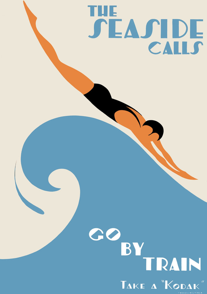 This vintage travel poster, titled "The Seaside Calls Britain," features a minimalist illustration of a swimmer diving into a stylized blue wave. With its classic charm, it promotes travel by train to seaside destinations in the UK. The elegant design and nostalgic appeal make it a striking addition to any wall decor collection. Ideal for lovers of vintage and minimalist art.