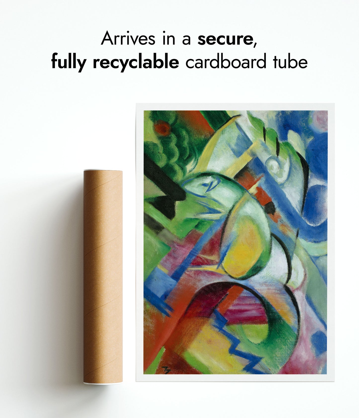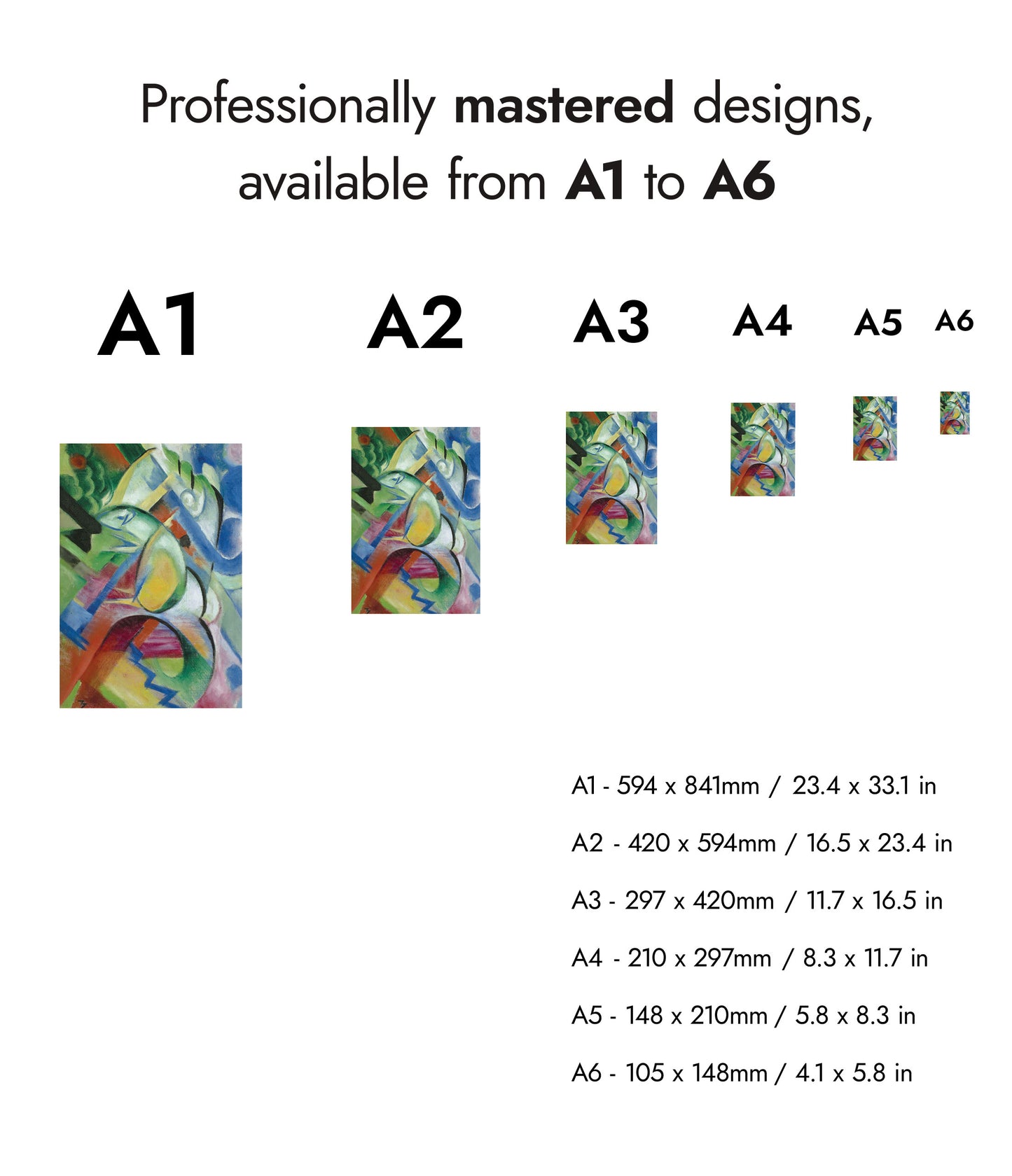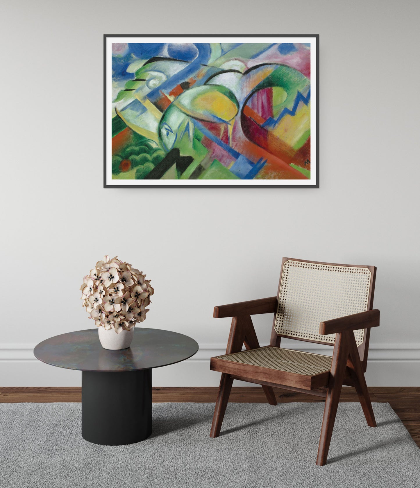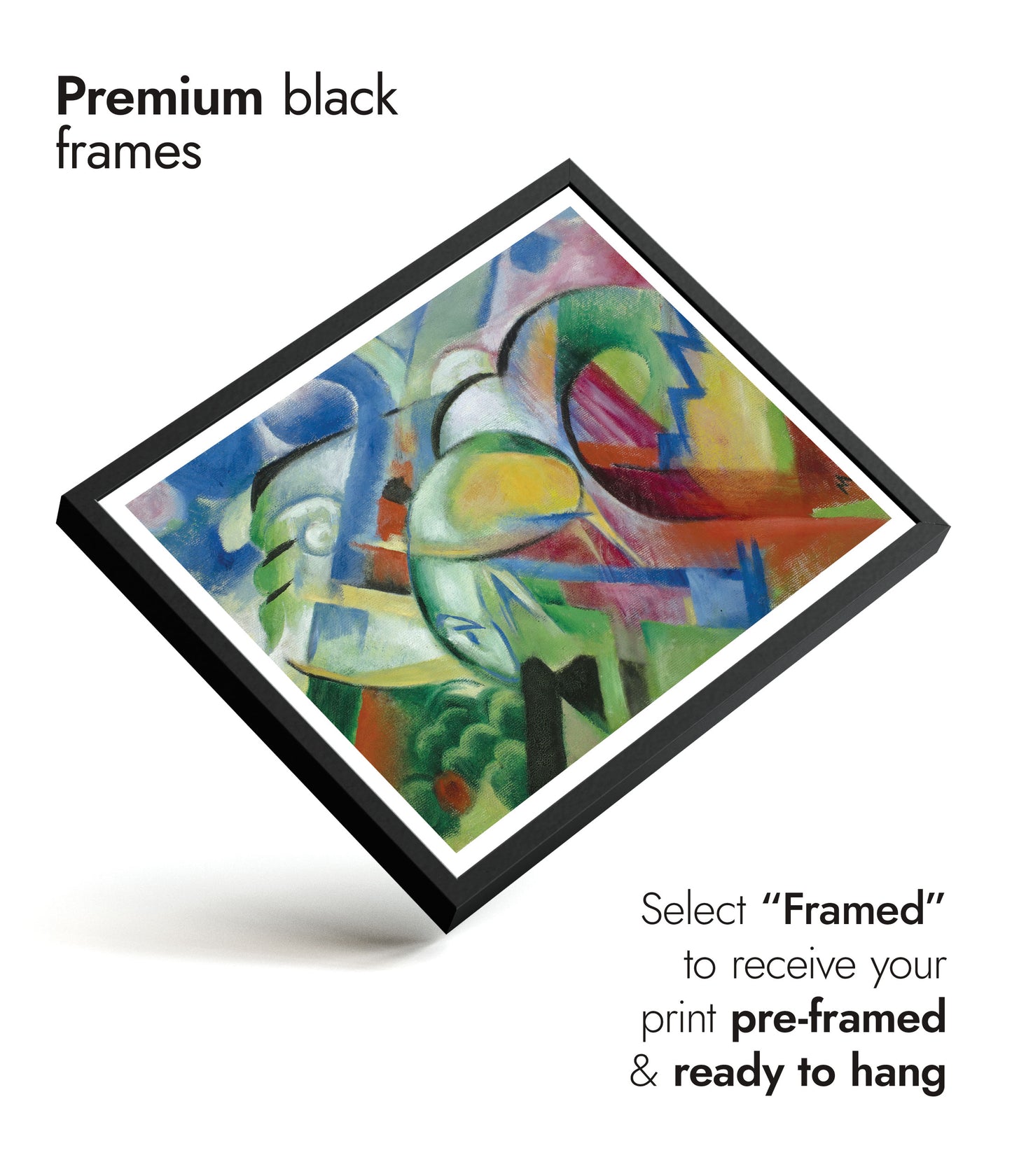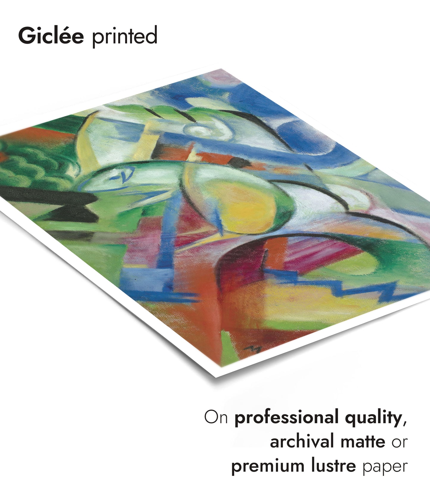 Experience the dynamic energy of "The Sheep" by Franz Marc with this cubism-inspired abstract landscape poster. Vivid geometric forms and vibrant colours blend seamlessly to depict sheep amidst a forest. This artwork's bold use of shapes and hues creates a compelling visual narrative, perfect for those seeking a unique and striking nature-inspired piece.