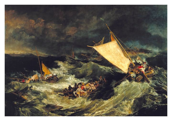 The "Shipwreck" poster by J.M.W. Turner captures a dramatic maritime scene, characterized by tumultuous waves and a stormy sky. This romanticism landscape depicts fishermen struggling against nature's fury, their boats battered by the sea. Turner's masterful use of light and shadow brings intensity and emotion to this gripping naval adventure, making it a striking addition to any art enthusiast's collection.