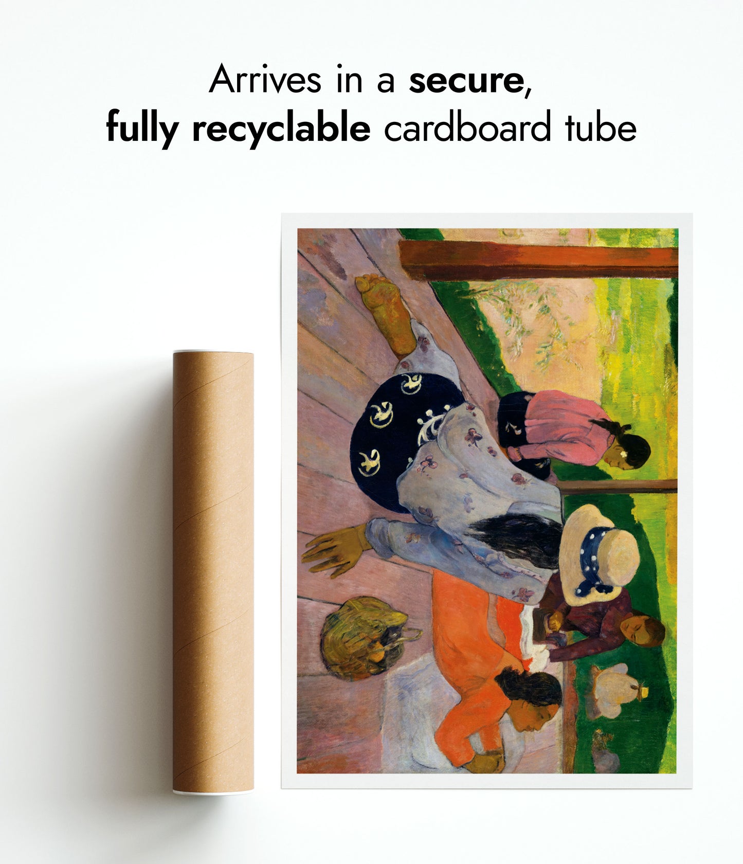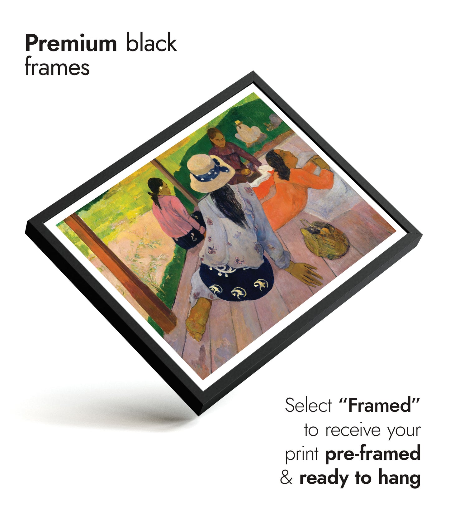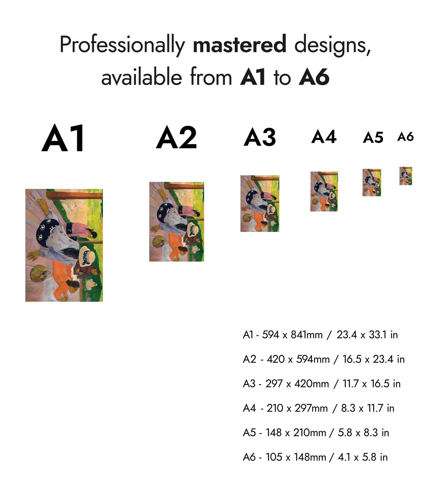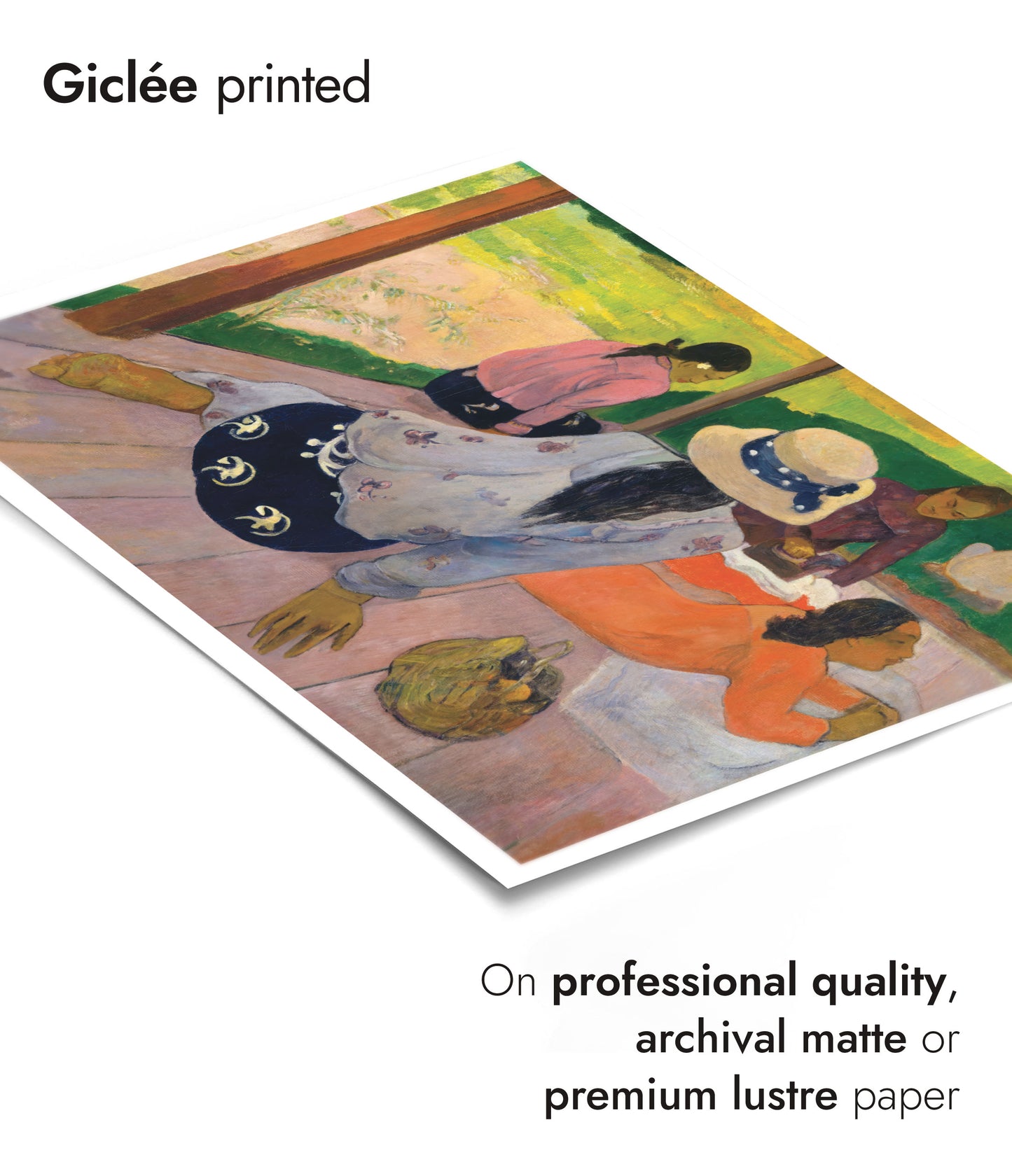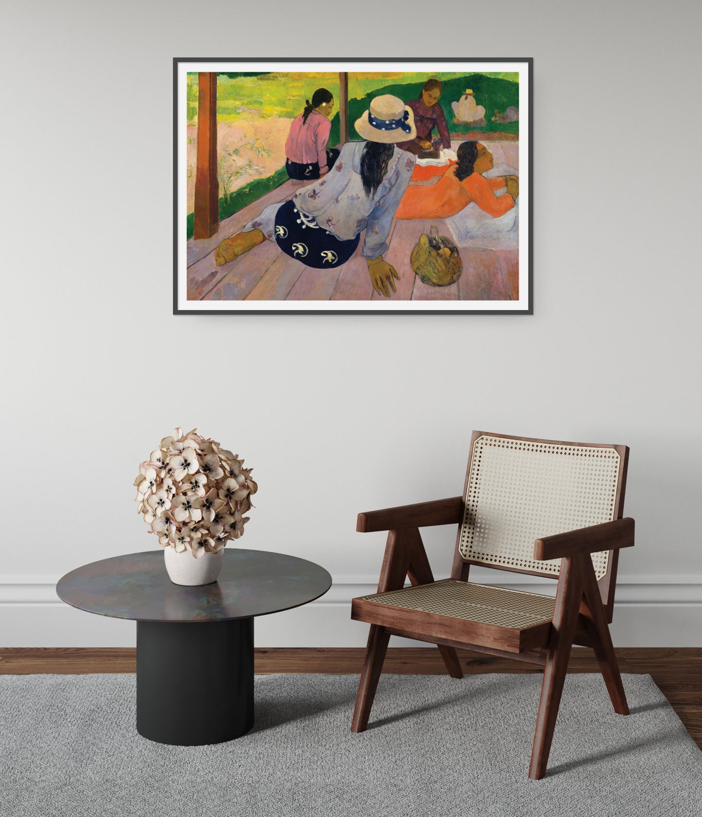 "The Siesta" poster by Paul Gauguin vividly portrays a serene summer scene where four women relax on a wooden platform near a grassy field. Dressed in vibrant, traditional clothing, the women exude a peaceful aura. This expressionist and primitivist artwork captures the essence of rest and tranquility in a tropical setting, making it an exquisite addition to any wall.