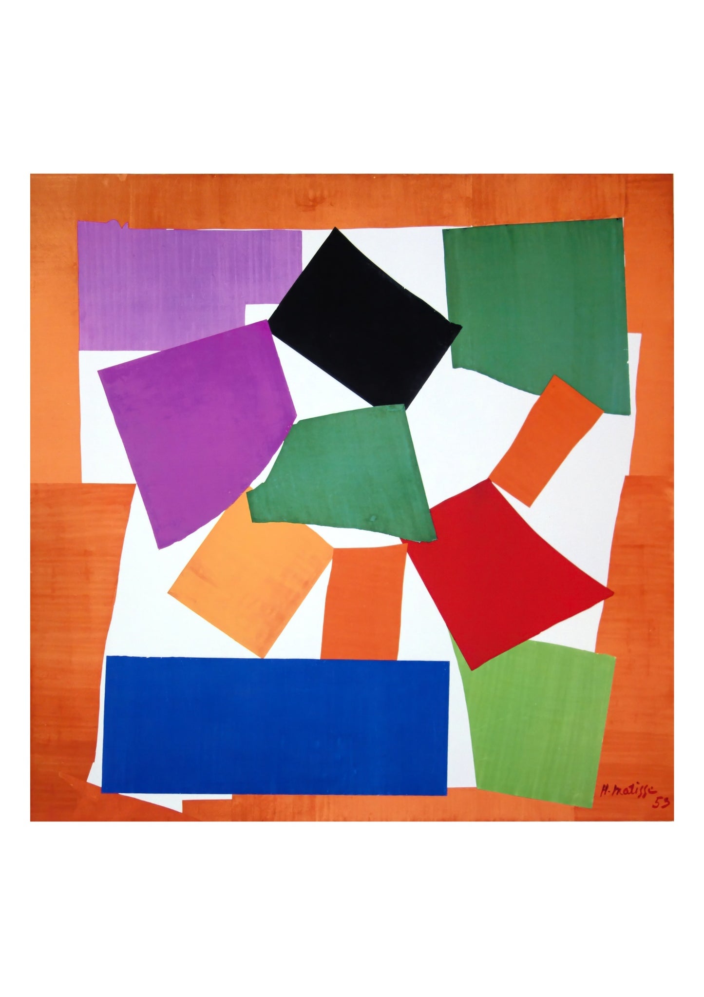 “The Snail” poster by Henri Matisse showcases a vivid abstract collage of geometric shapes in dynamic colours. With its mid-century modern style, this graphic art print features irregular squares and rectangles arranged on a striking orange background. Ideal for lovers of abstract and geometric art, this portrait poster brings vibrant energy to any space.
