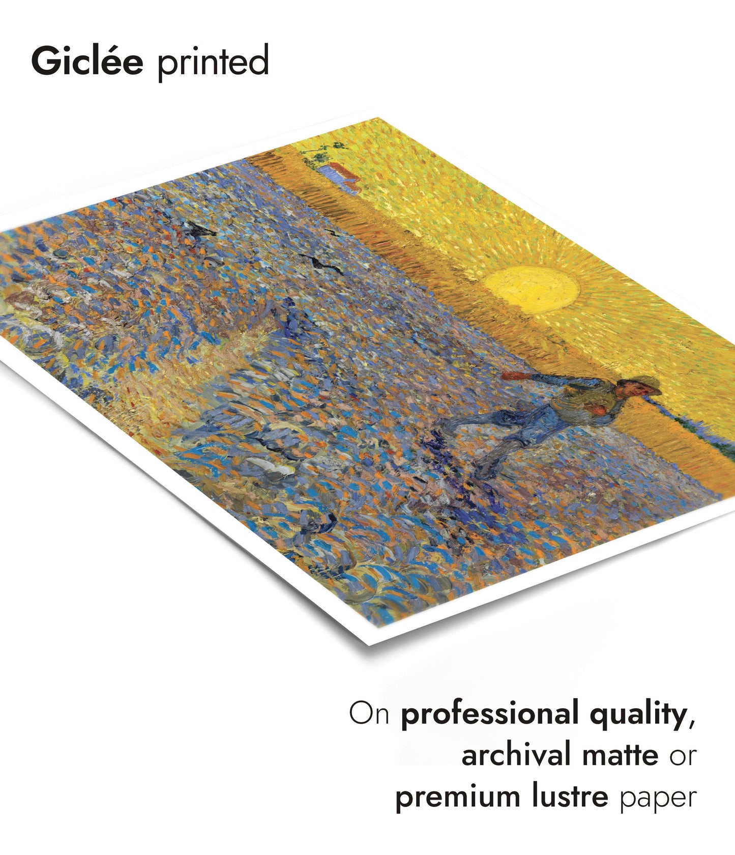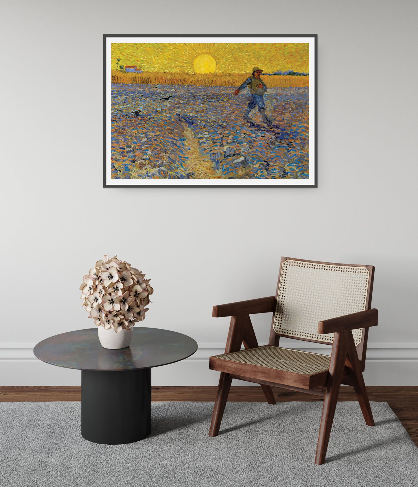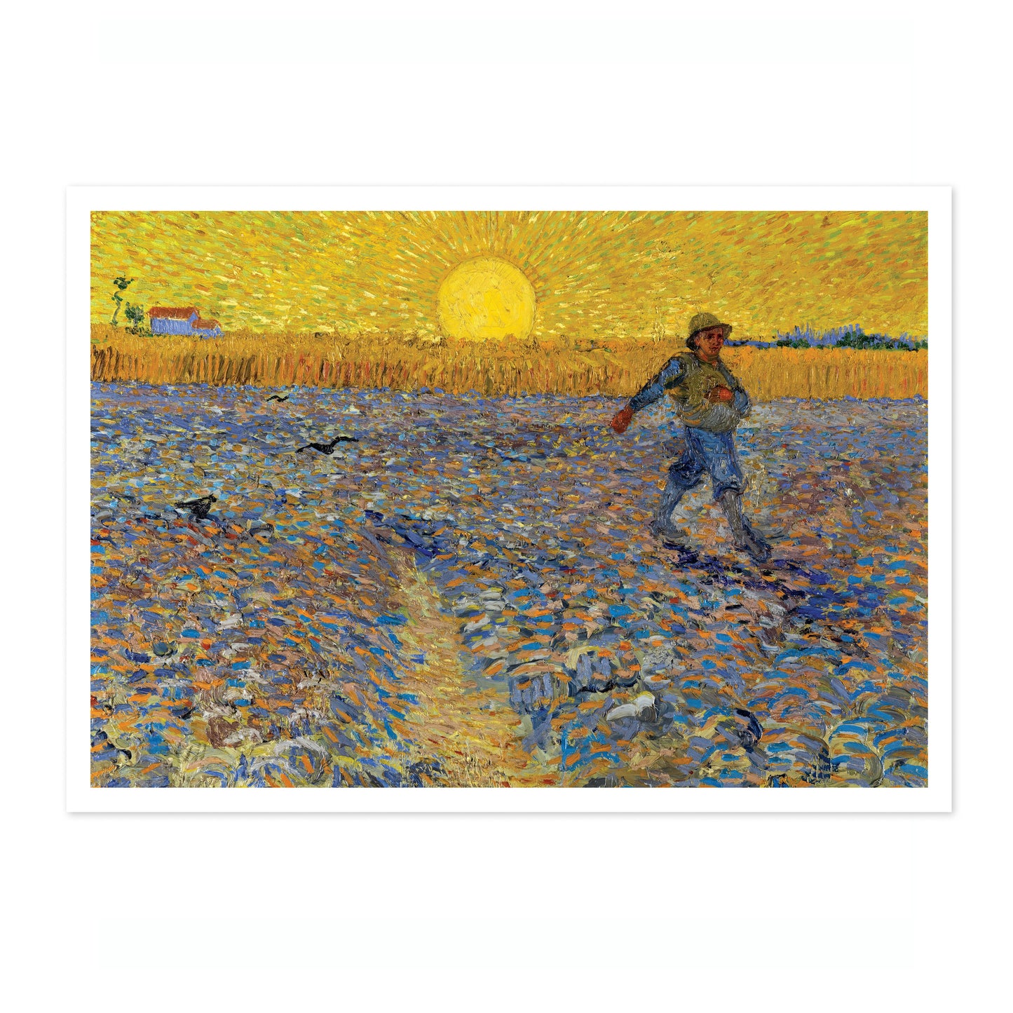 This Vincent Van Gogh poster, titled "The Sower," captures a farmer sowing seeds under a radiant sun. Rendered in a vibrant Post-Impressionist style, the landscape showcases dynamic brushstrokes and rich colours, reflecting the essence of farm life at sunset. Ideal for those who appreciate art and nature, this piece adds warmth and character to any space.