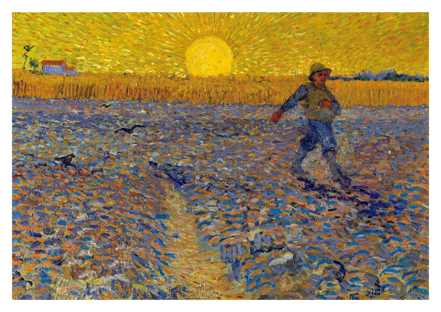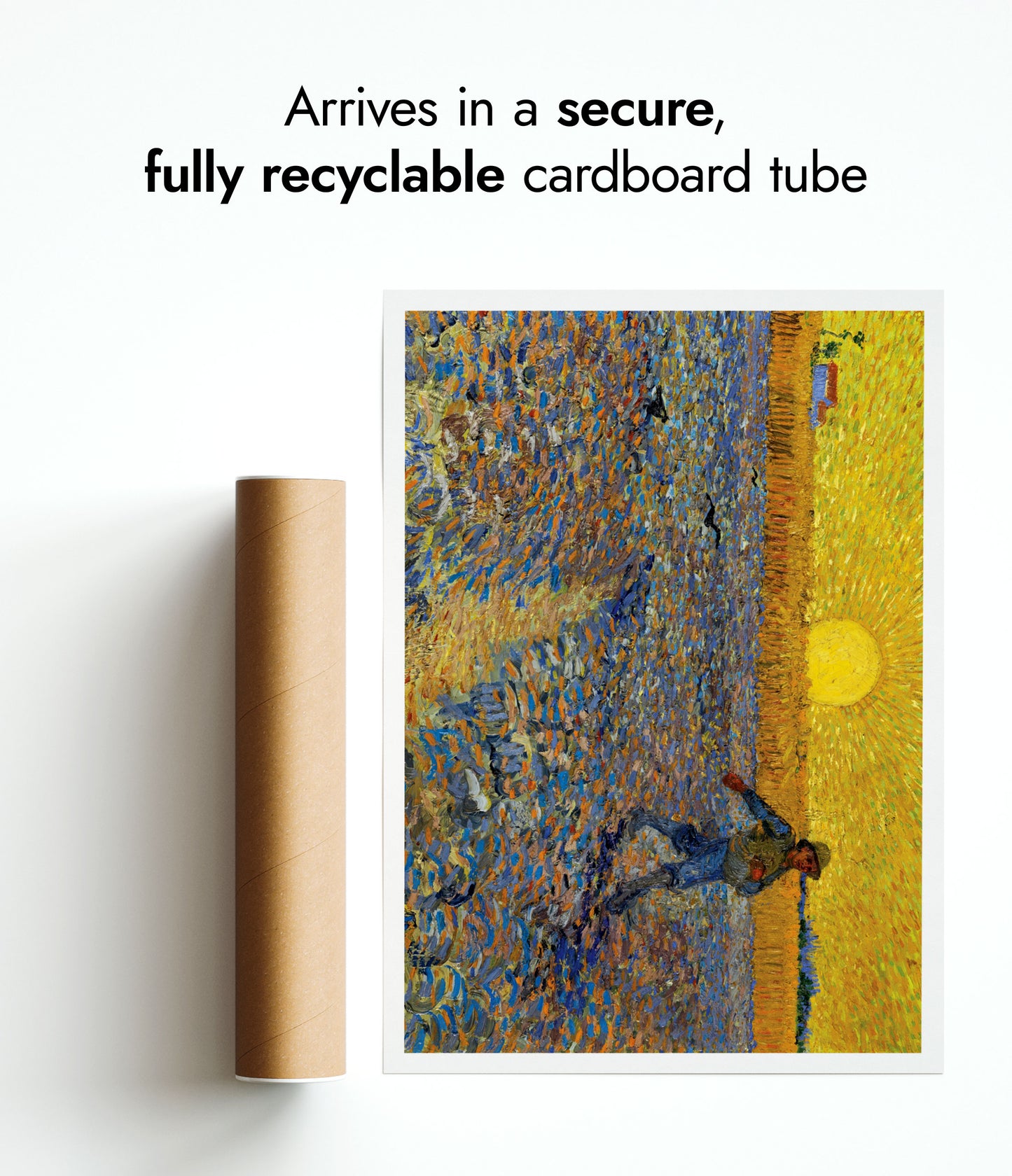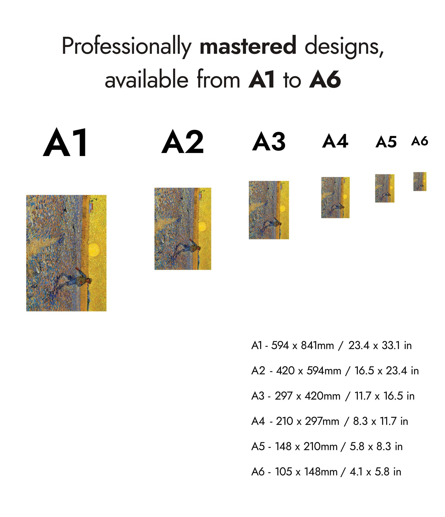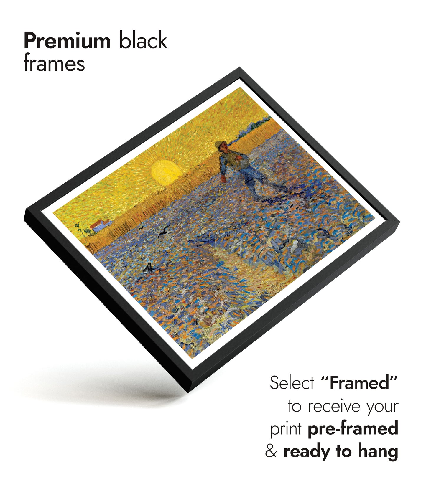This Vincent Van Gogh poster, titled "The Sower," captures a farmer sowing seeds under a radiant sun. Rendered in a vibrant Post-Impressionist style, the landscape showcases dynamic brushstrokes and rich colours, reflecting the essence of farm life at sunset. Ideal for those who appreciate art and nature, this piece adds warmth and character to any space.