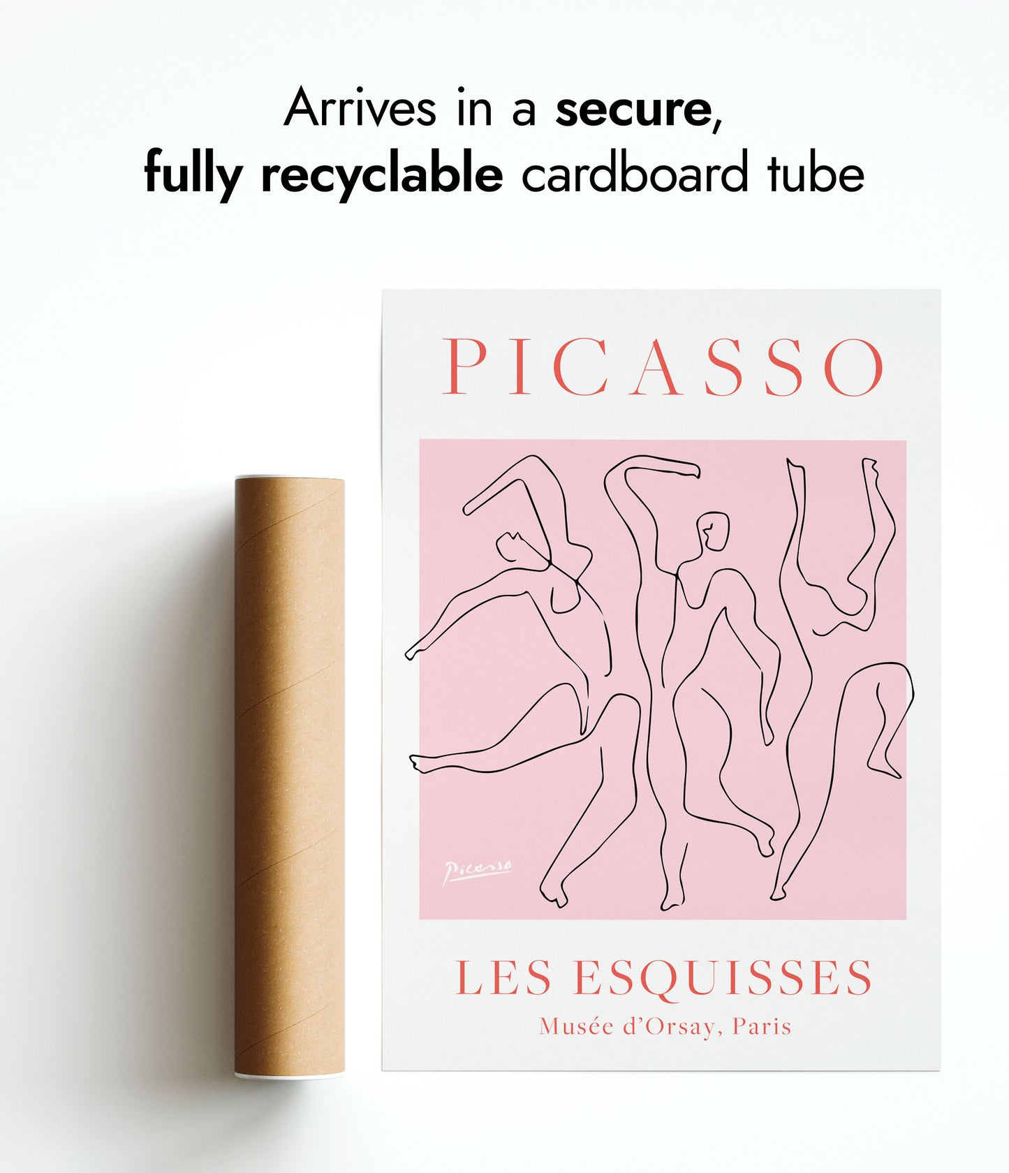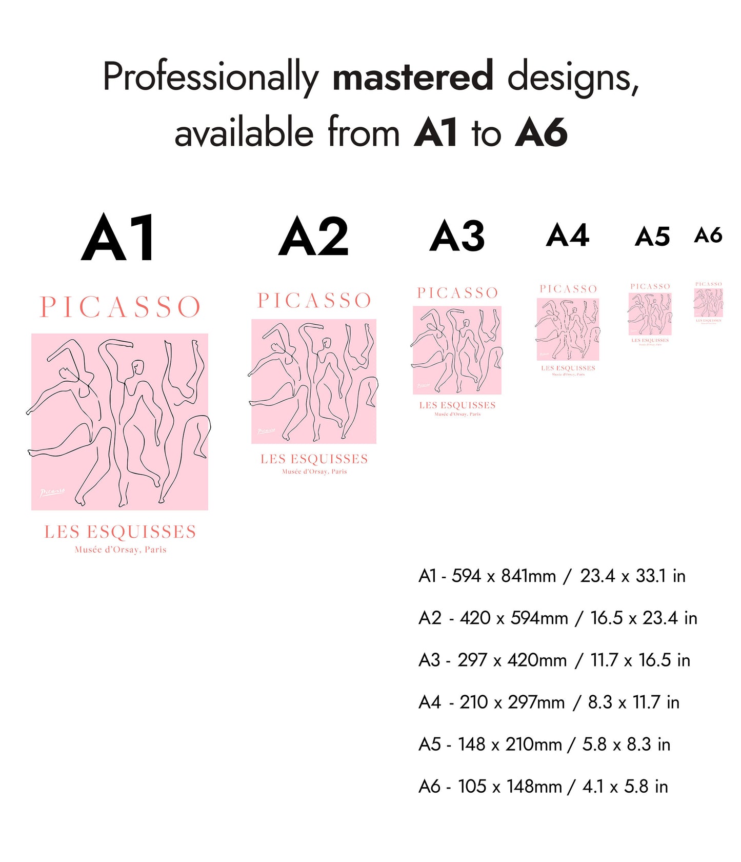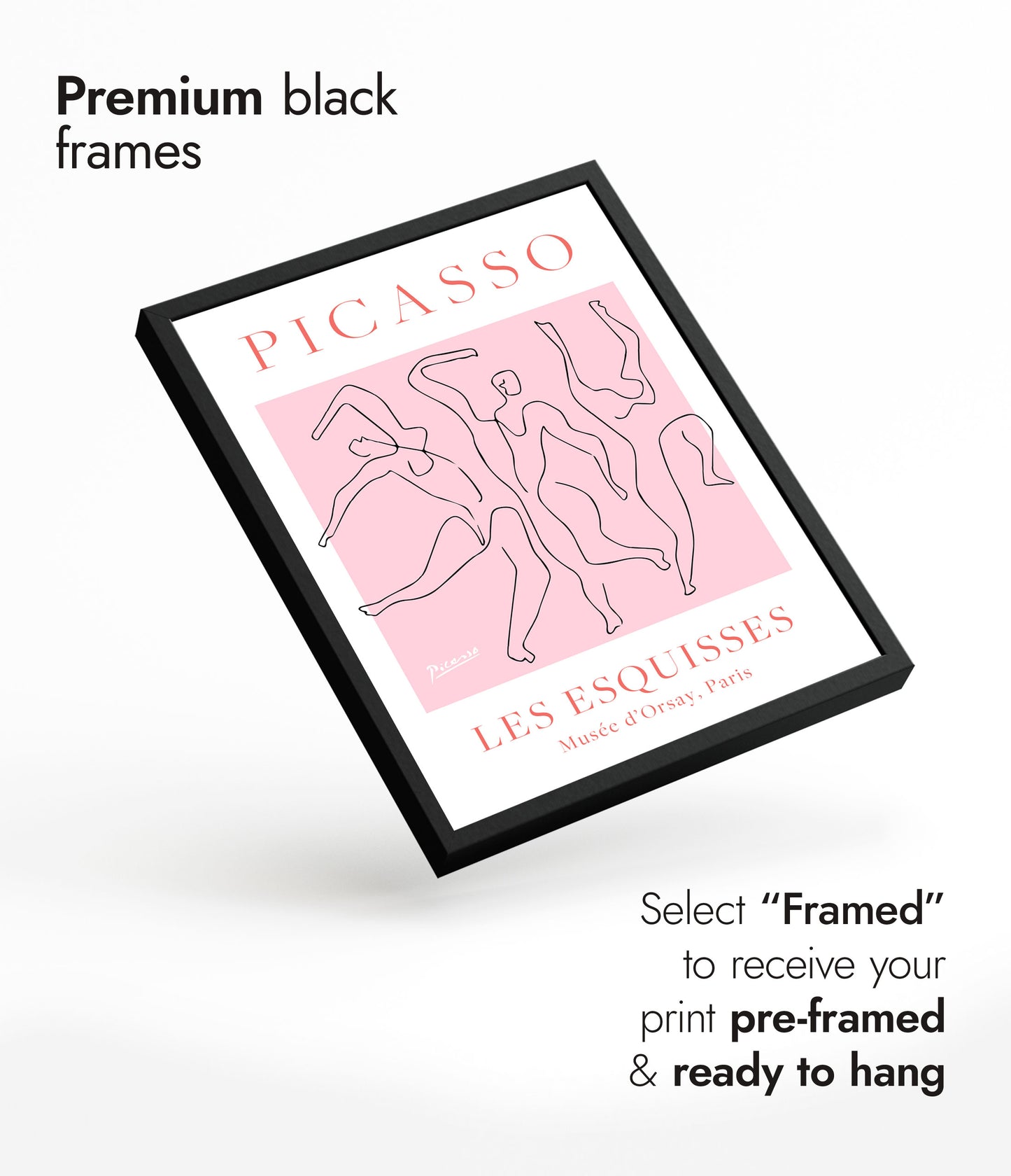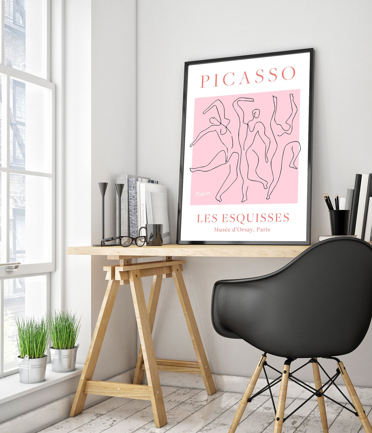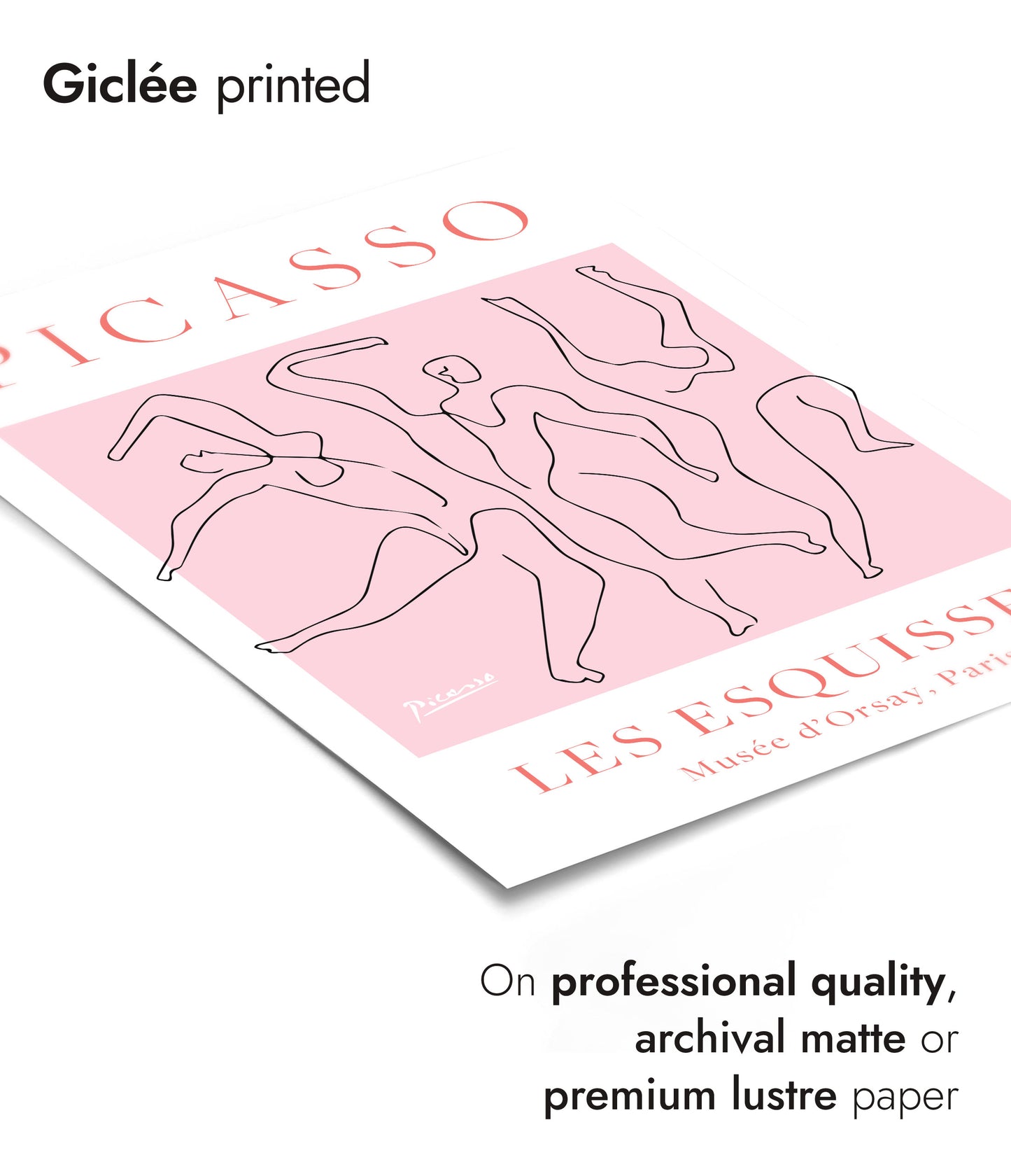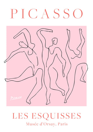 This poster, titled "Les Esquisses," showcases Picasso's minimalist line art style. It features elegant, fluid sketches of three dancers set against a soft pink background. Ideal for those who appreciate minimalist and exhibition-themed art prints, this portrayal of graceful female forms encapsulates Picasso's artistic mastery, making it a timeless addition to any space.