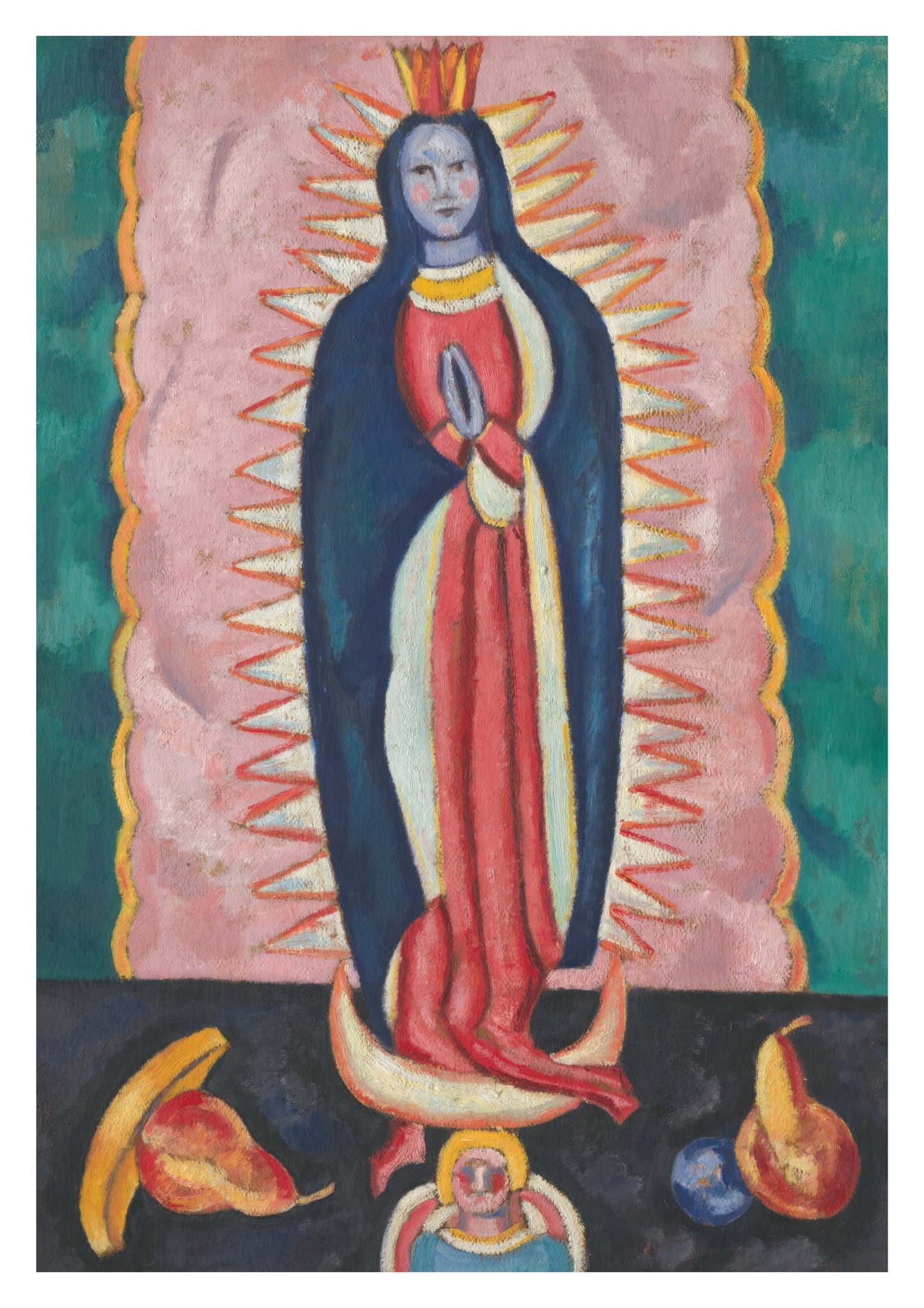 This "The Virgin of Guadeloupe" poster by Marsden Hartley showcases a surrealistic depiction of the Virgin surrounded by vibrant rays. A modernist touch gives the icon a mystic aura, enhanced by rich, layered colours. Below, a still life arrangement of fruits adds intriguing contrast, blending religious symbolism with everyday objects in a compelling, dreamlike composition.