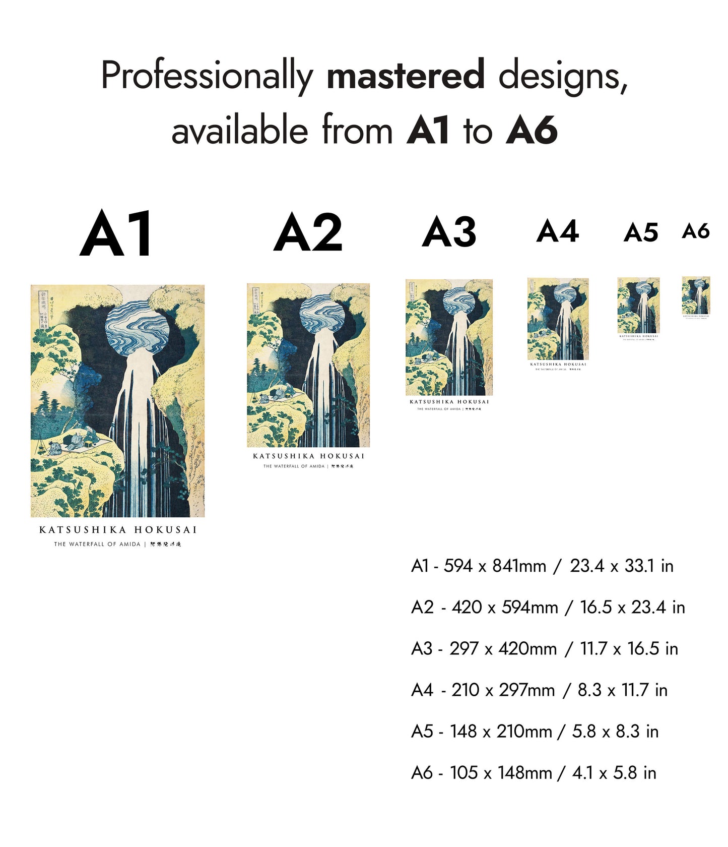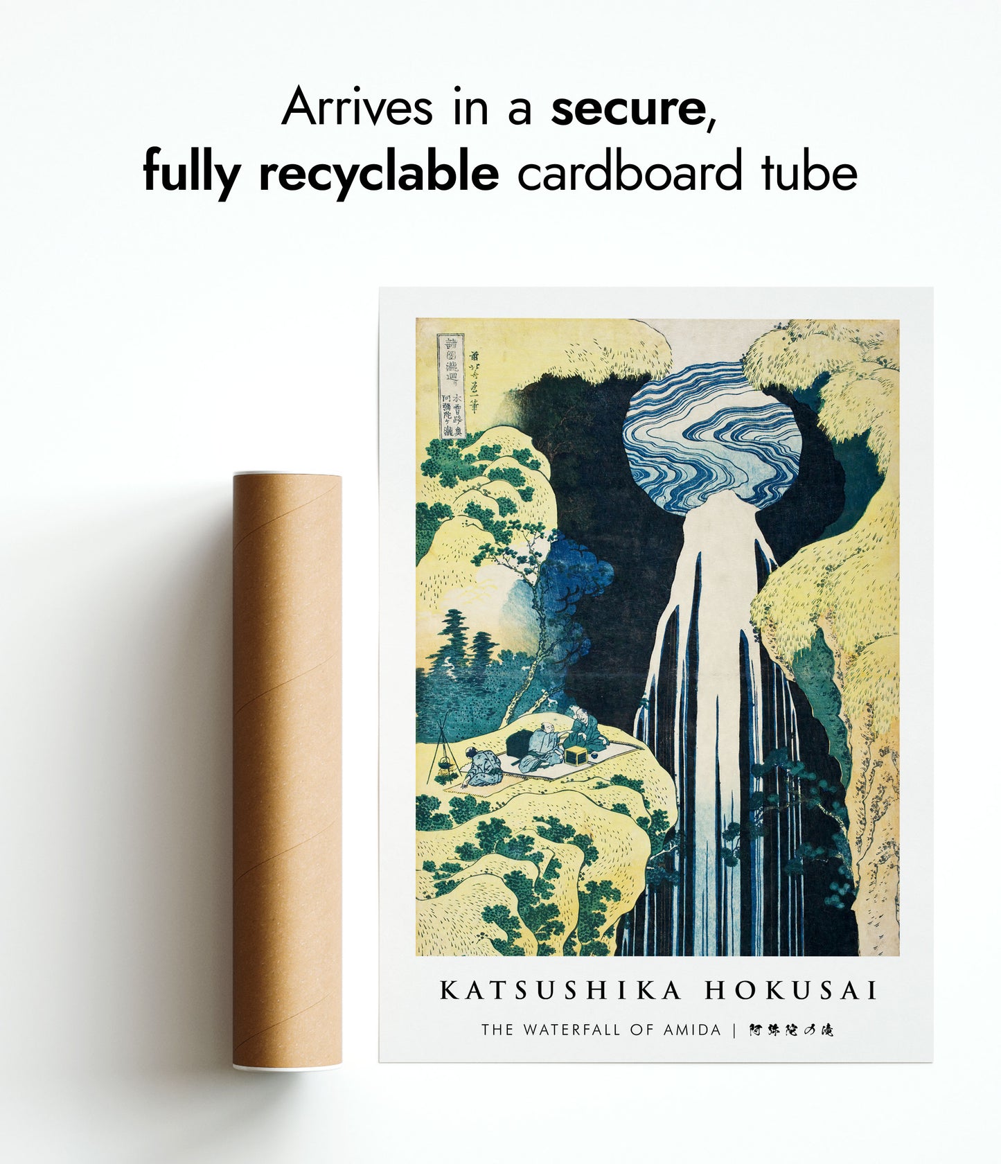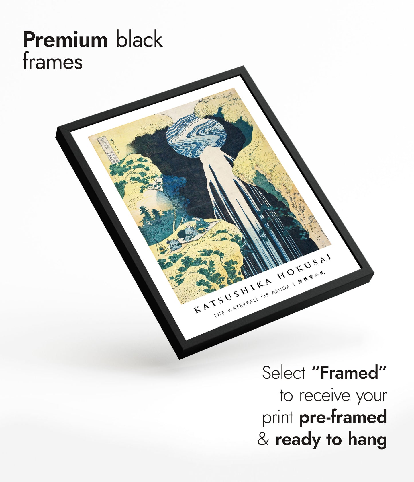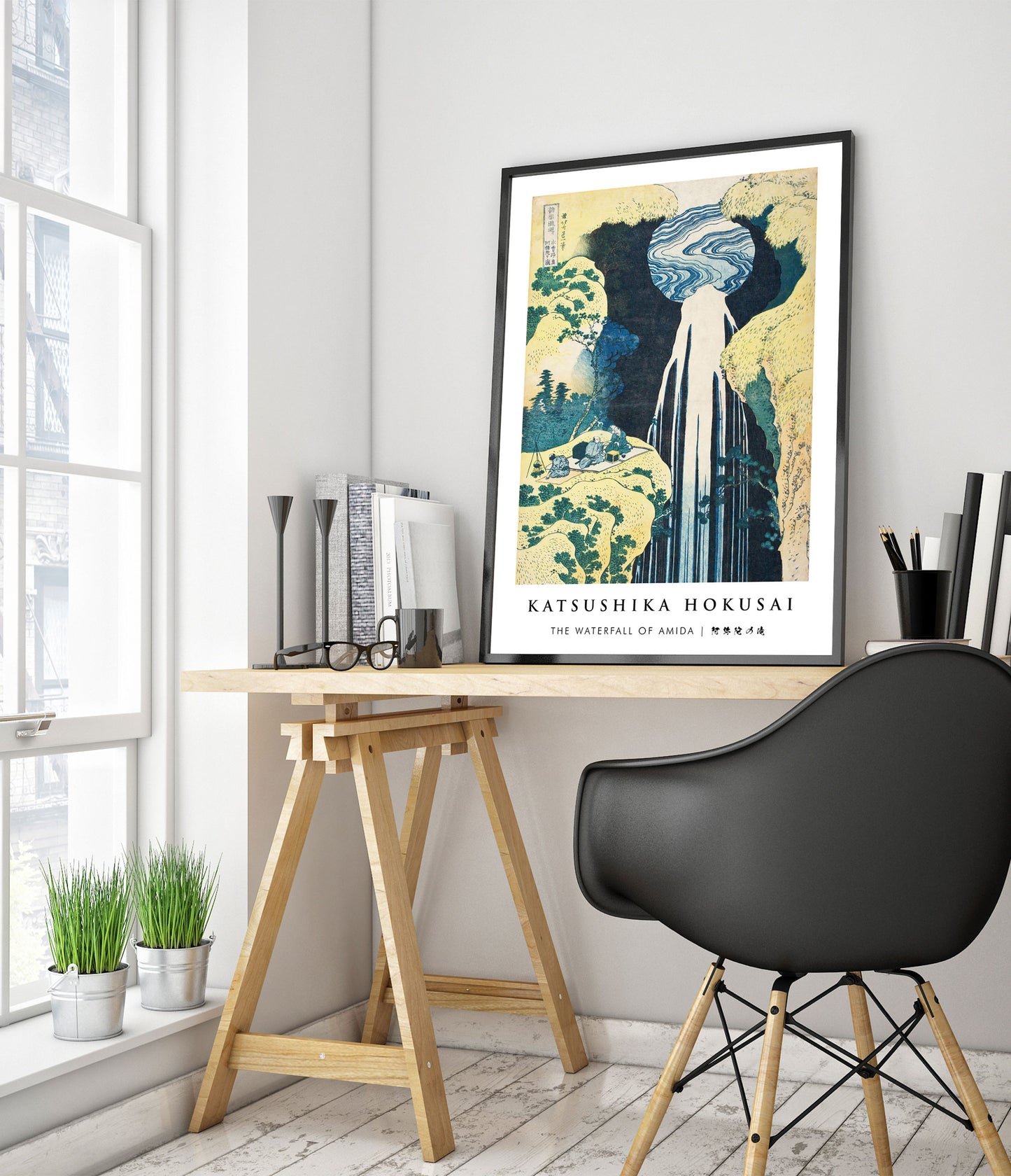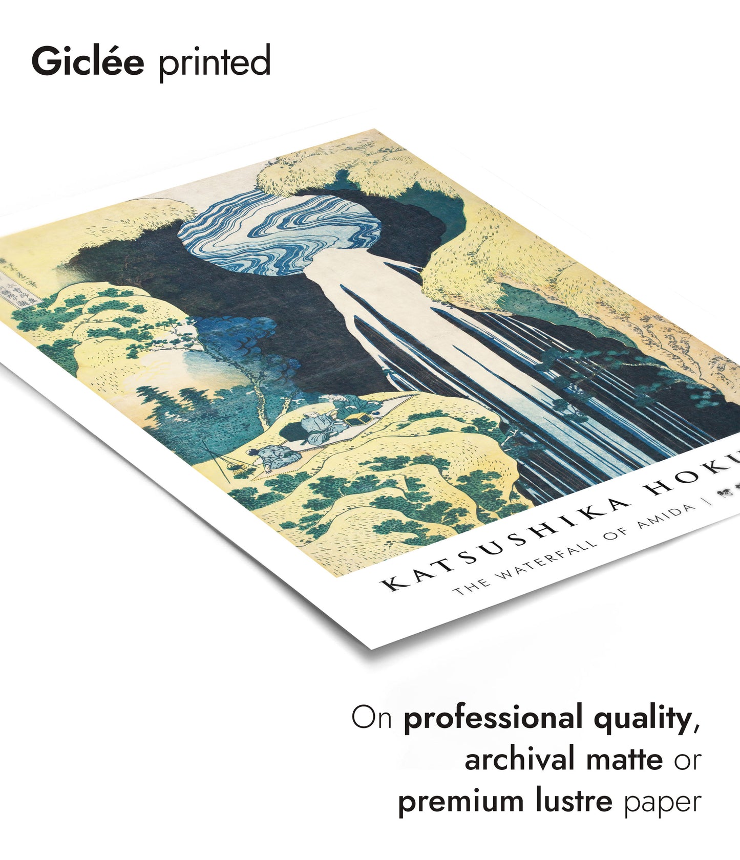 This poster showcases "The Waterfall of Amida" by renowned artist Katsushika Hokusai. The traditional Japanese woodblock print captures the serene landscape with a majestic waterfall cascading through a forested mountain. The composition highlights intricate details of trees and rugged cliffs, embodying the classic Ukiyo-E style. Ideal for fans of Japanese art and natural scenery.