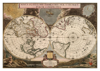 "The World From Its Poles" is a vintage illustration poster featuring detailed dual hemispheres of the Earth from a polar perspective. Ideal for history and geography enthusiasts, this vintage map captures intricate cartographic details and classical artistry, accentuated by period-appropriate embellishments. Perfect for adding a touch of antique charm to your space.