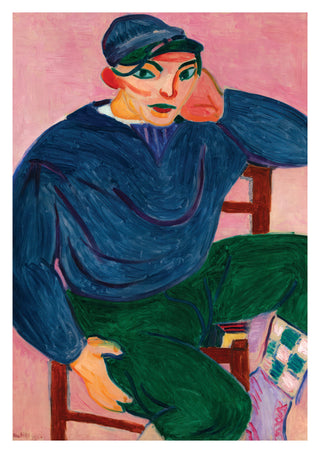 "The Young Sailor" poster by Henri Matisse showcases a vibrant Fauvist portrait with bold, expressive brushstrokes. Depicting a relaxed young sailor in navy and green attire against a soft pink background, the artwork emphasizes strong contrasts and emotive colour use. Ideal for adding an artistic touch to any space, this piece reflects Matisse's iconic modernist style.