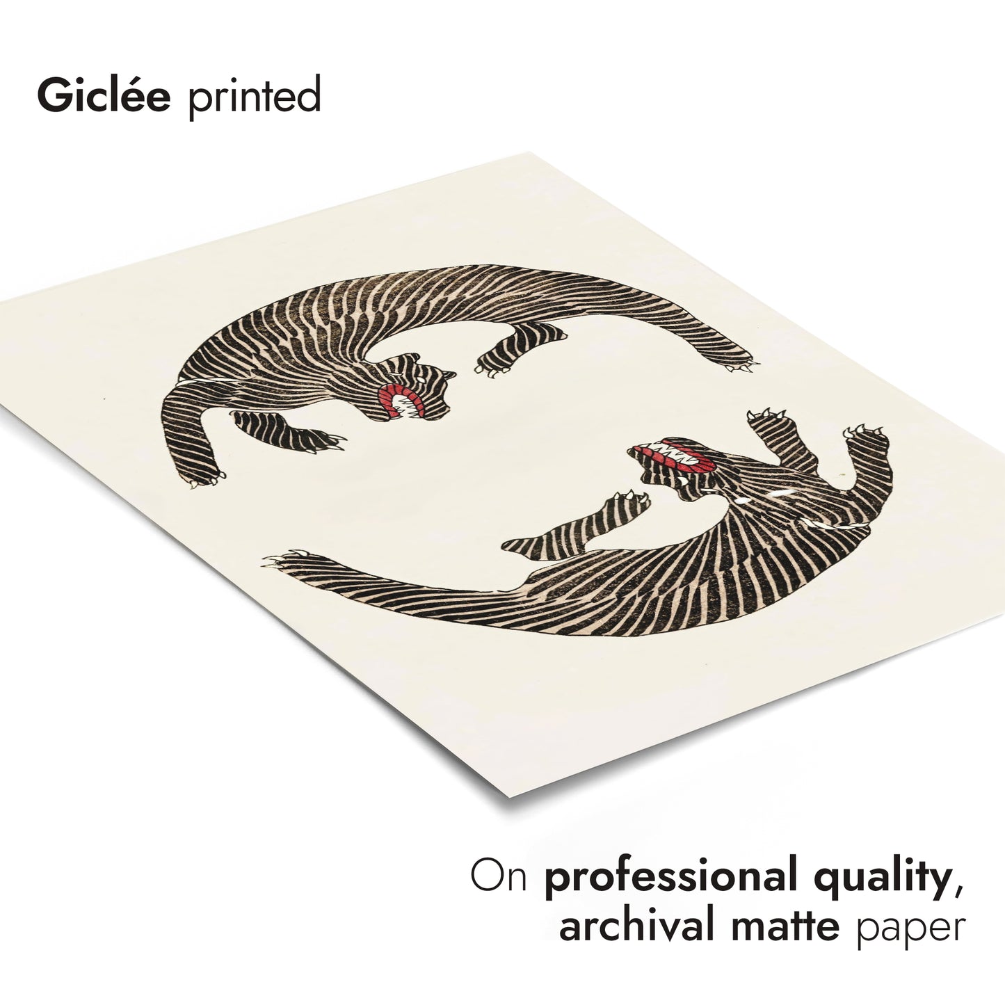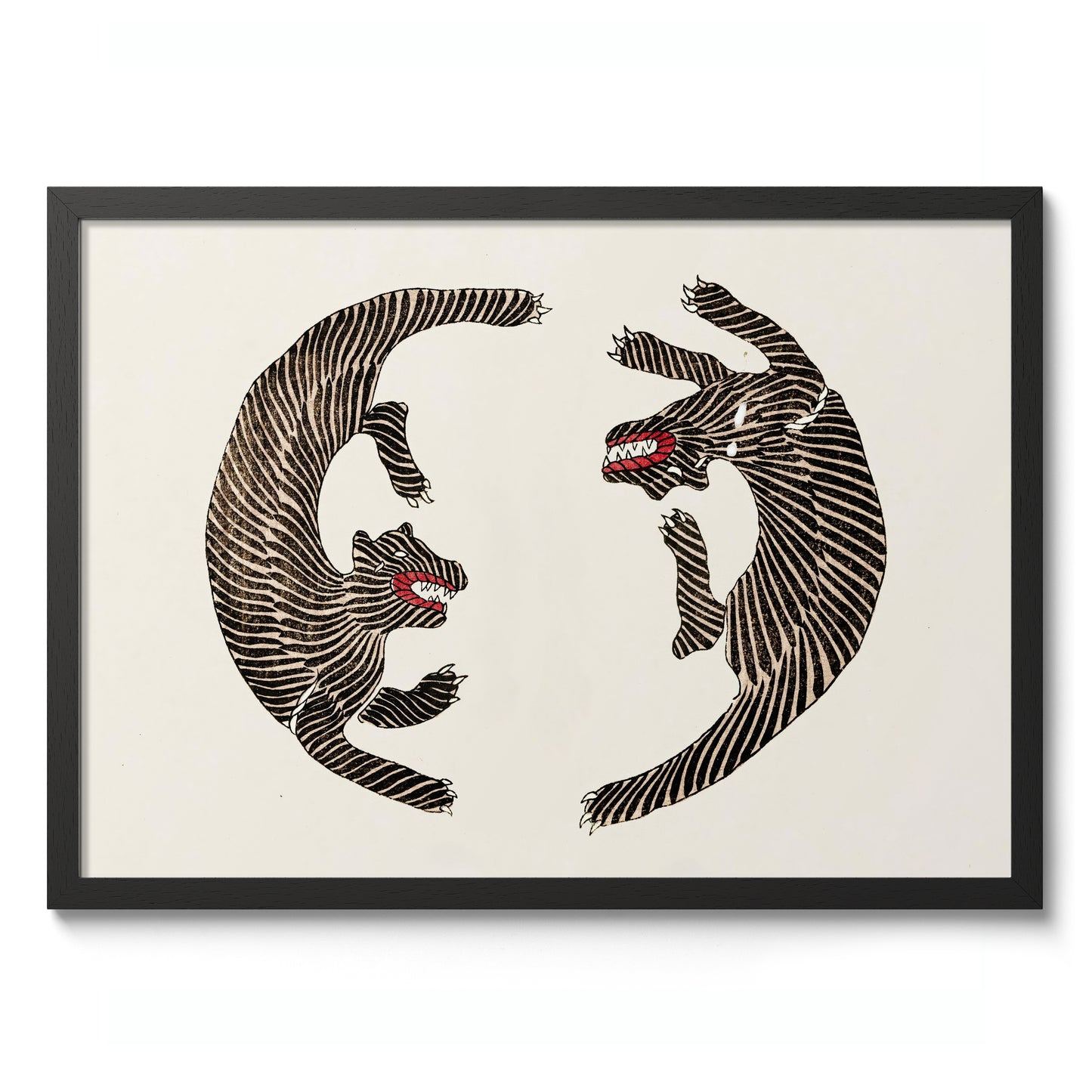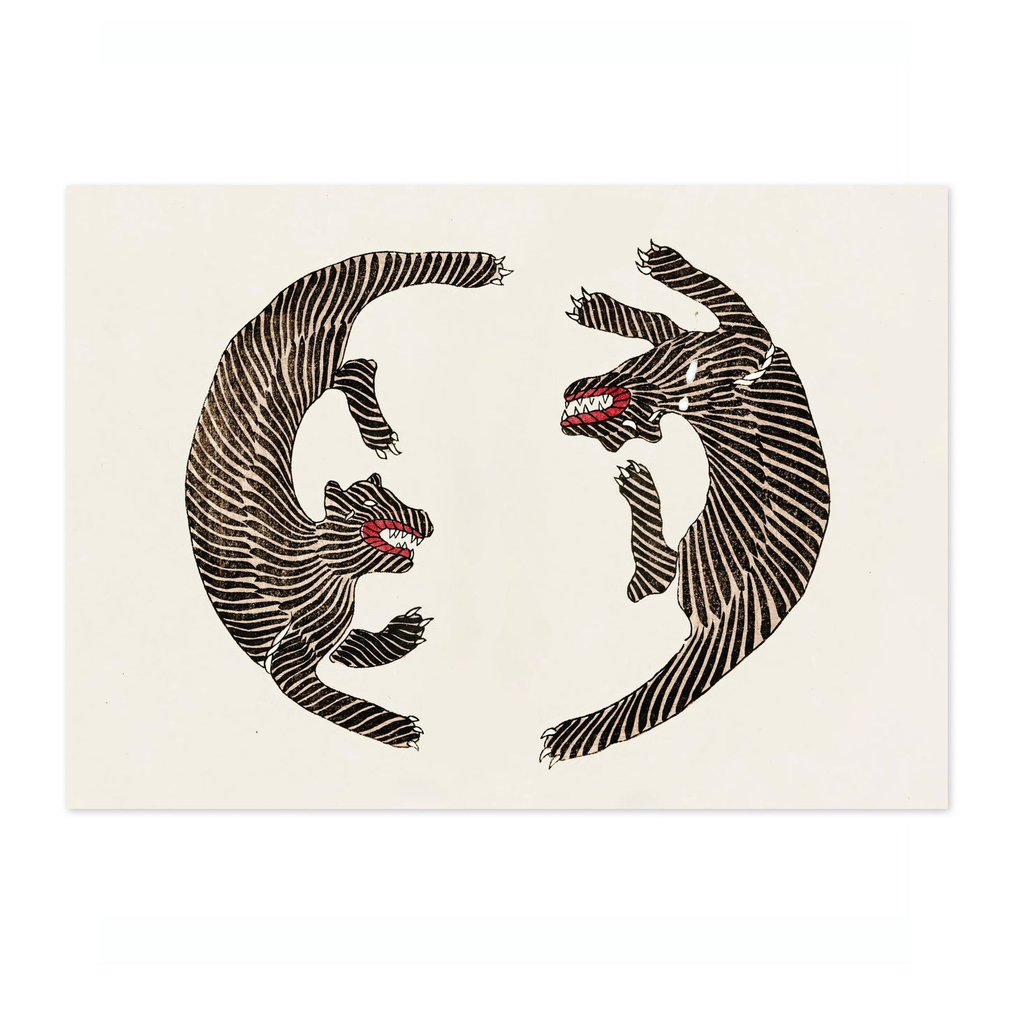 This captivating poster by artist Taguchi Tomoki features two dynamically posed tigers, rendered in striking black and white stripes with vivid red mouths. Inspired by traditional Japanese woodblock prints, this illustration captures the power and grace of these majestic animals. The beige background provides a subtle contrast, emphasizing the tigers' movements and expressions in Ukiyo-E style. Ideal for wildlife and art enthusiasts.