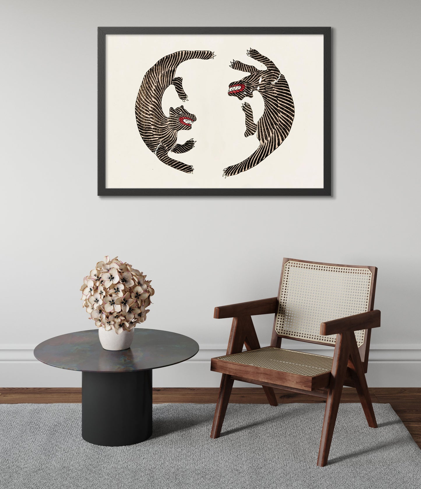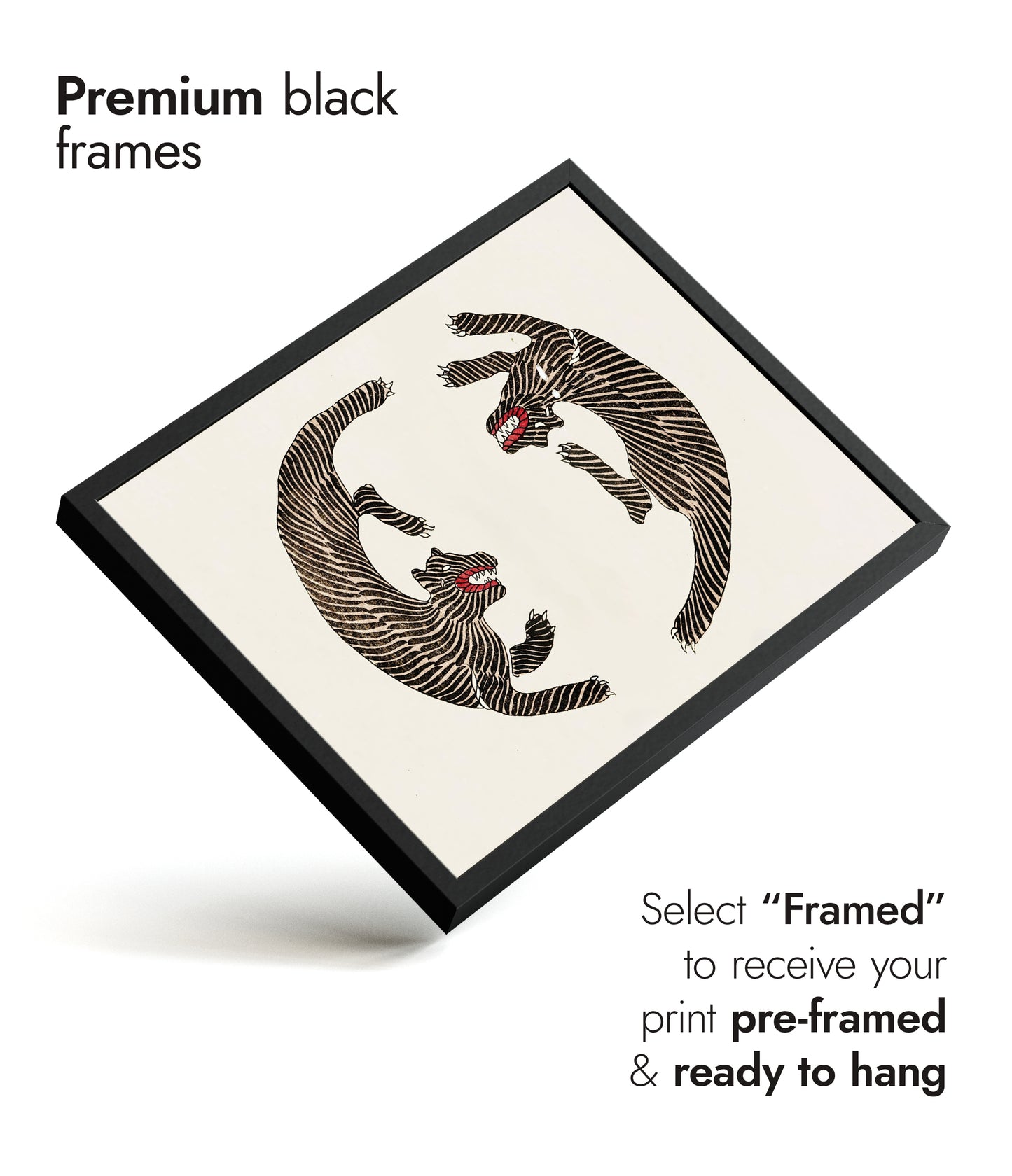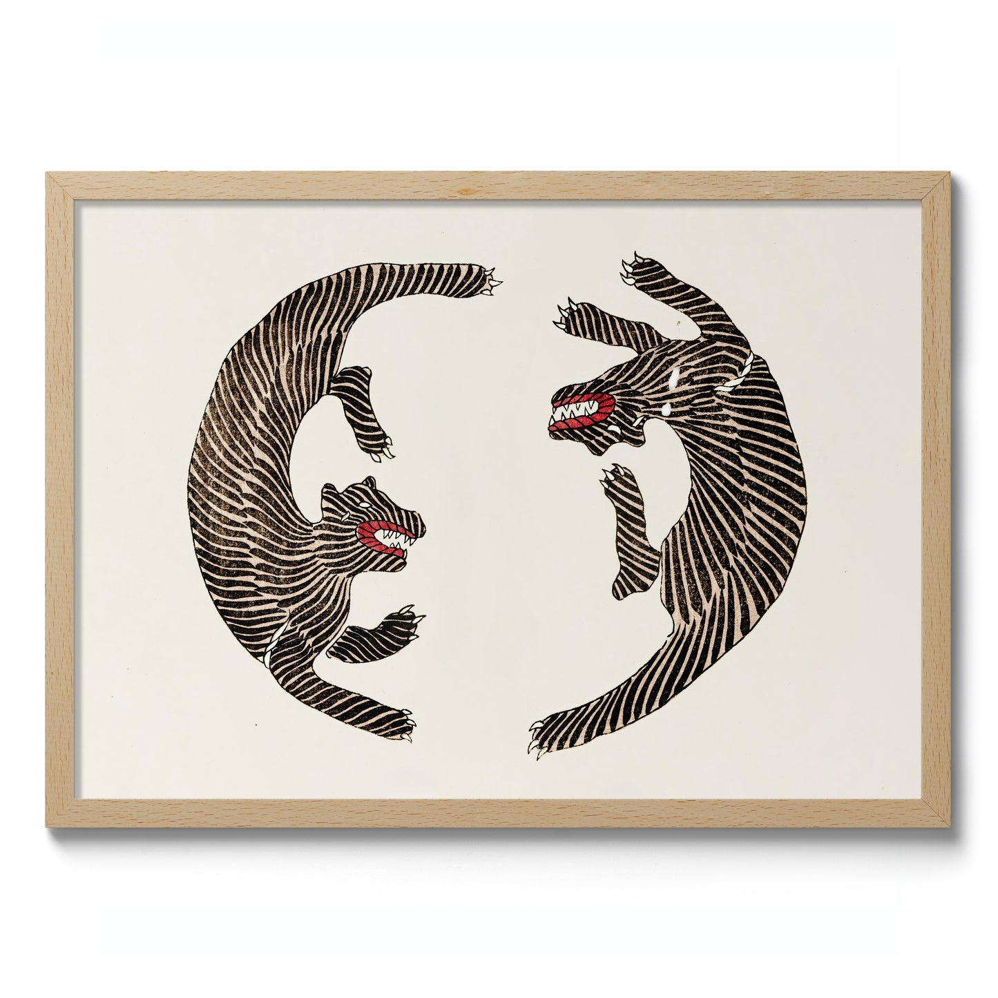 This captivating poster by artist Taguchi Tomoki features two dynamically posed tigers, rendered in striking black and white stripes with vivid red mouths. Inspired by traditional Japanese woodblock prints, this illustration captures the power and grace of these majestic animals. The beige background provides a subtle contrast, emphasizing the tigers' movements and expressions in Ukiyo-E style. Ideal for wildlife and art enthusiasts.