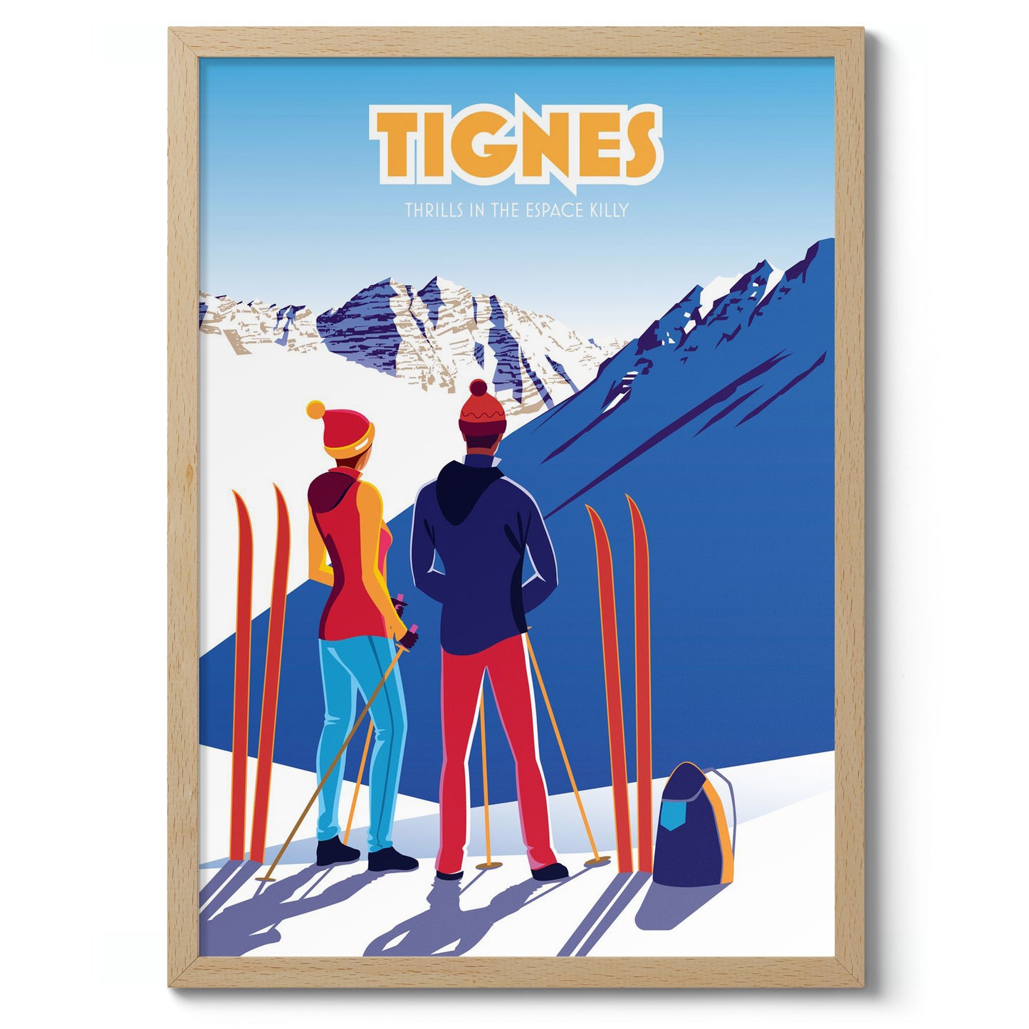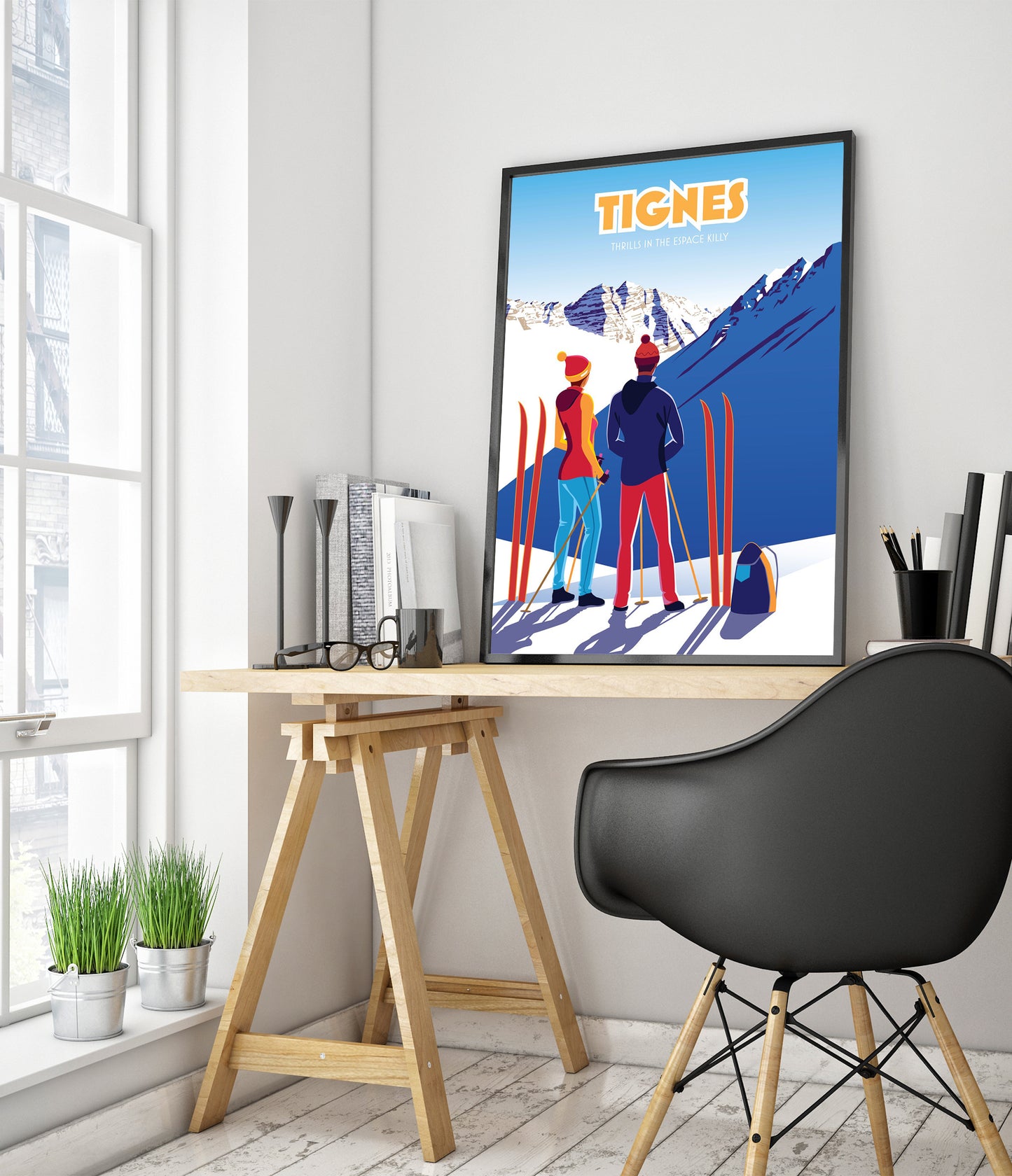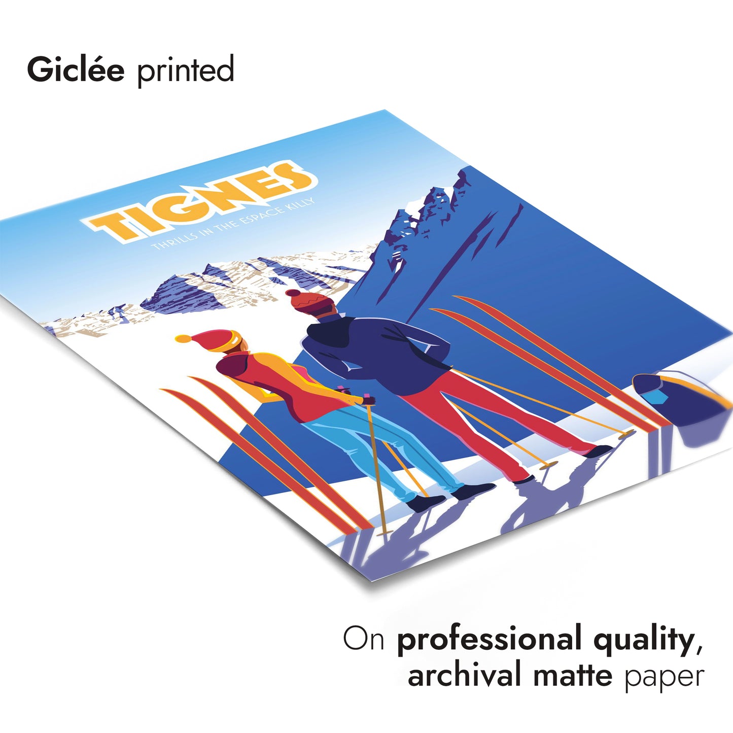 This vibrant Tignes poster captures the thrill of skiing in the French Alps. Featuring two skiers in retro attire, the graphic art showcases striking contrasts between the snowy mountain peaks and the clear blue sky. Ideal for ski enthusiasts, this modern, graphic style illustration evokes the excitement of winter sports in the Espace Killy region.