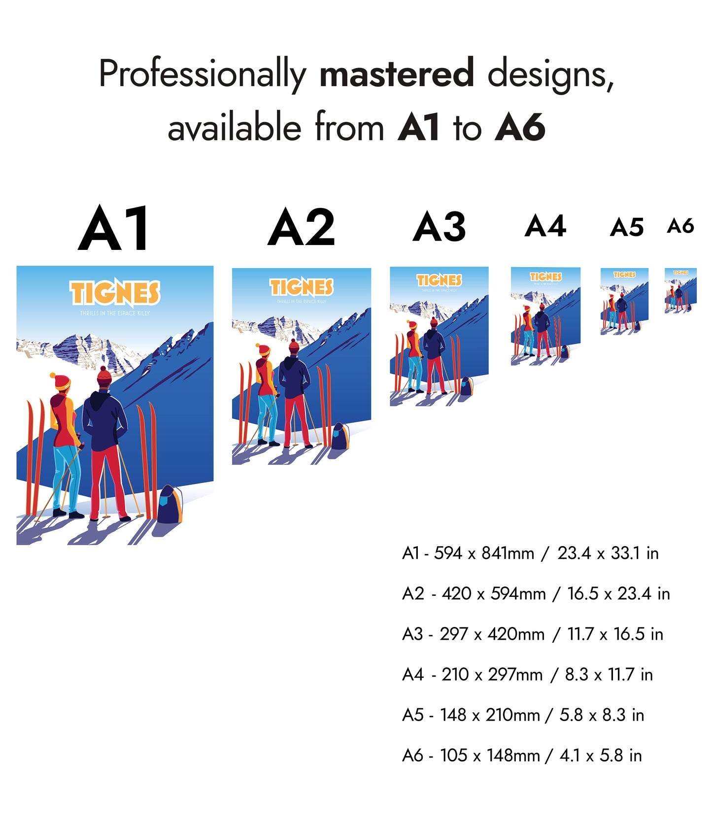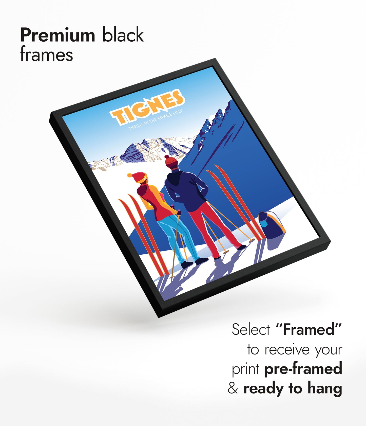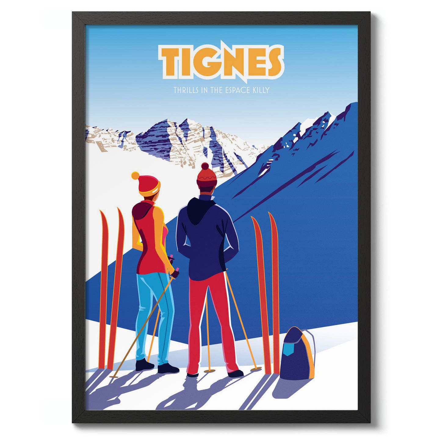 This vibrant Tignes poster captures the thrill of skiing in the French Alps. Featuring two skiers in retro attire, the graphic art showcases striking contrasts between the snowy mountain peaks and the clear blue sky. Ideal for ski enthusiasts, this modern, graphic style illustration evokes the excitement of winter sports in the Espace Killy region.