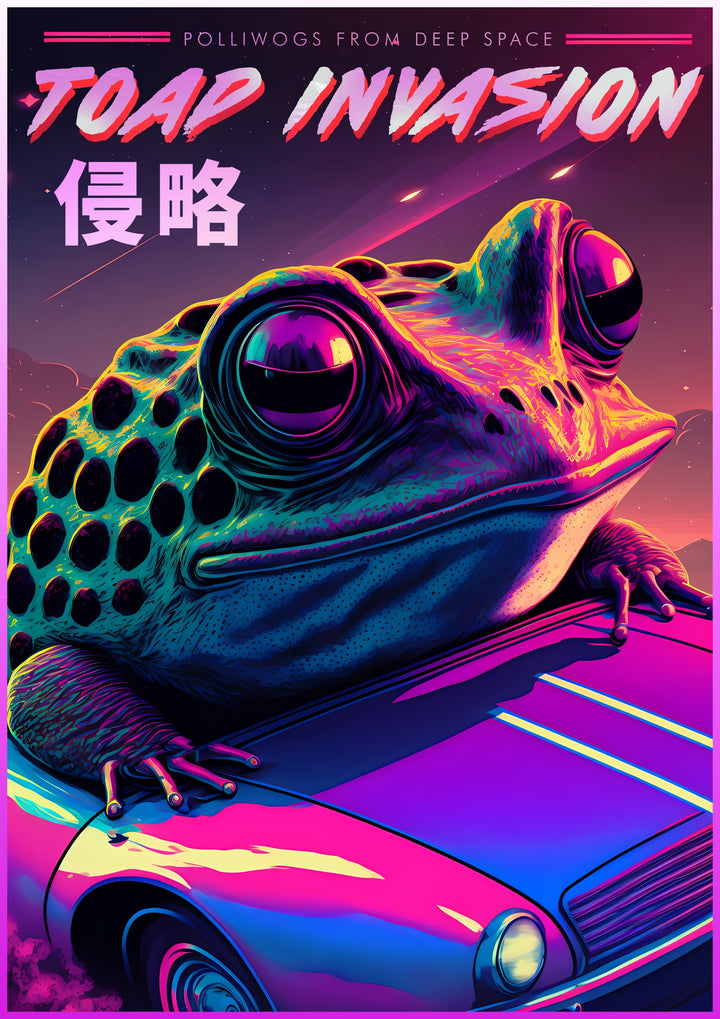 The "Toad Invasion" poster features vibrant, synthwave aesthetics with a giant, multicoloured toad atop a neon sports car. Its retro, sci-fi design is highlighted by bold hues of pink, purple, and blue, capturing both a humorous and surreal vibe. Perfect for fans of anime, retro graphics, and animal-themed art.