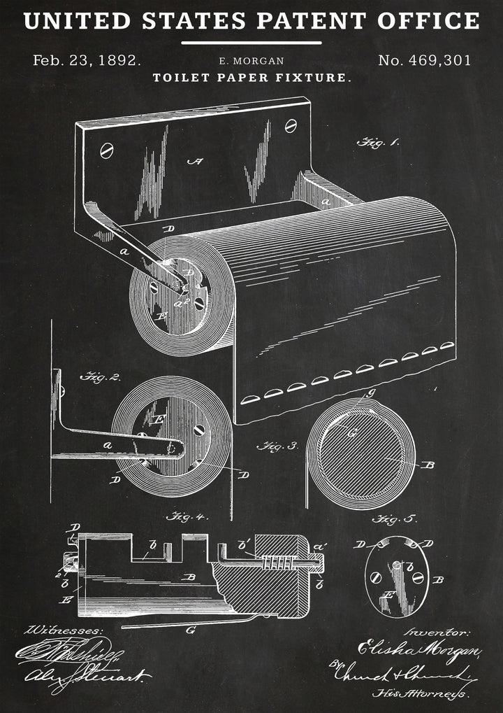 This vintage-style poster showcases a detailed schematic of the 1892 patent for a toilet paper fixture. The monochrome illustration offers a historical view into early designs, highlighting intricate line art and precise technical elements. Perfect for bathroom decor, this patent print appeals to those with an interest in vintage engineering and history.