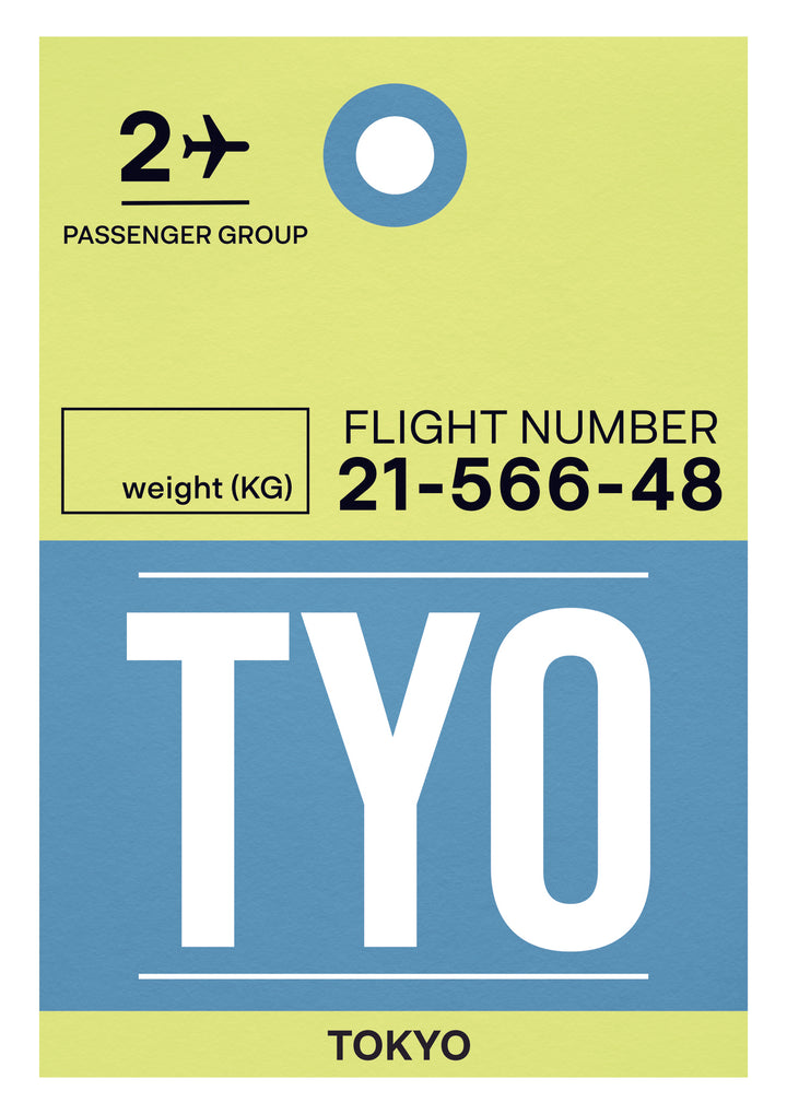 This retro graphic poster captures the essence of Tokyo, Japan, through a bright and minimalist design inspired by vintage luggage tags. Featuring bold typography with the city code "TYO” and flight details, it evokes the excitement of travel. Perfect for adding a touch of wanderlust to any space. Ideal for travel enthusiasts and lovers of modern, simplistic art.