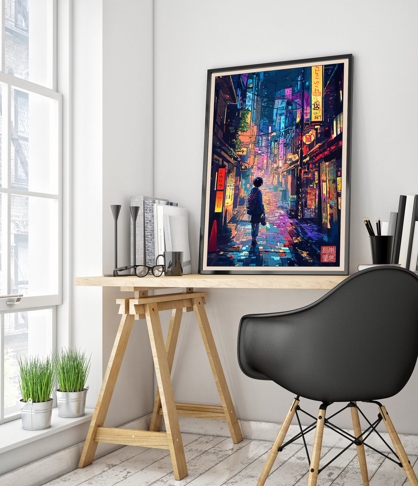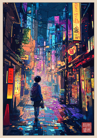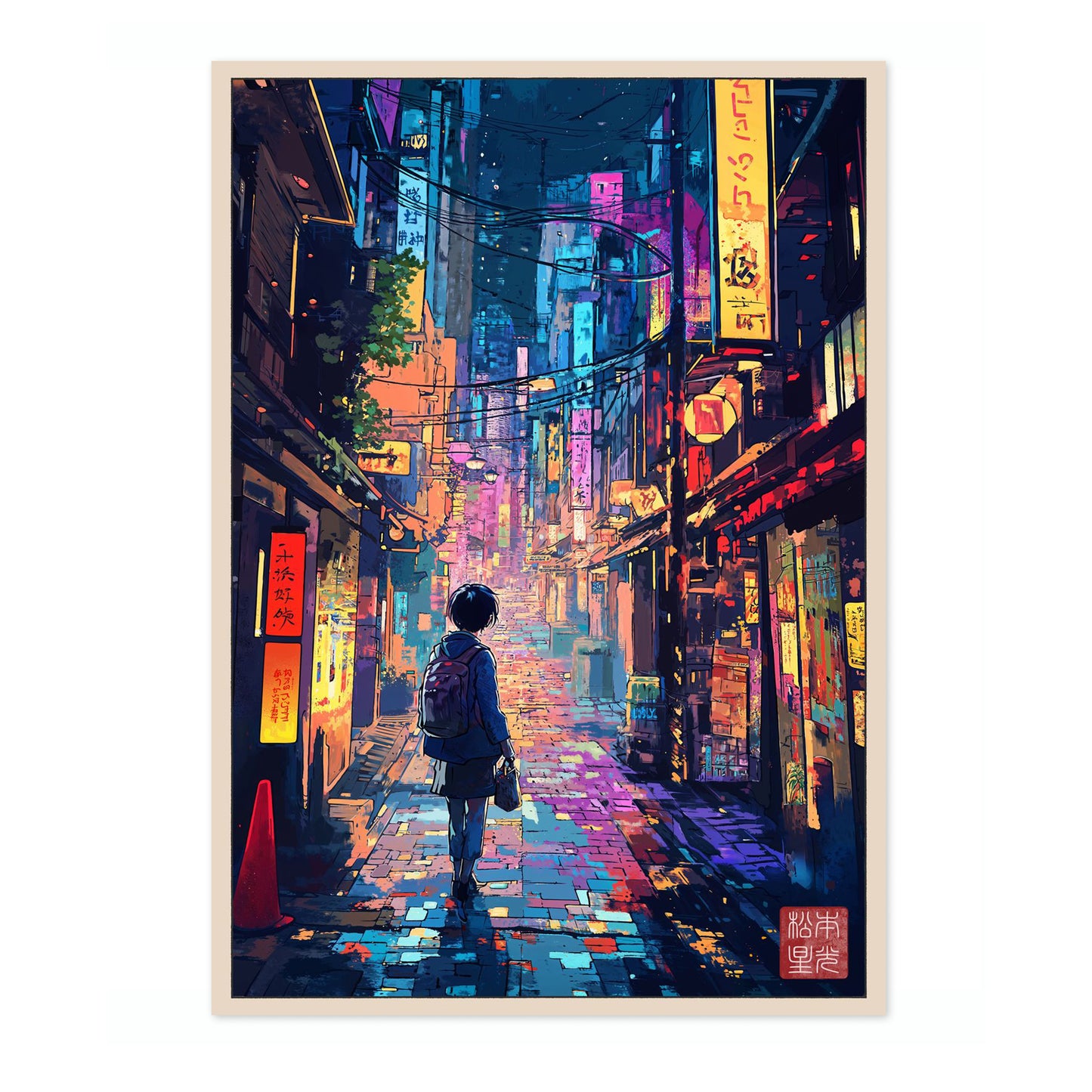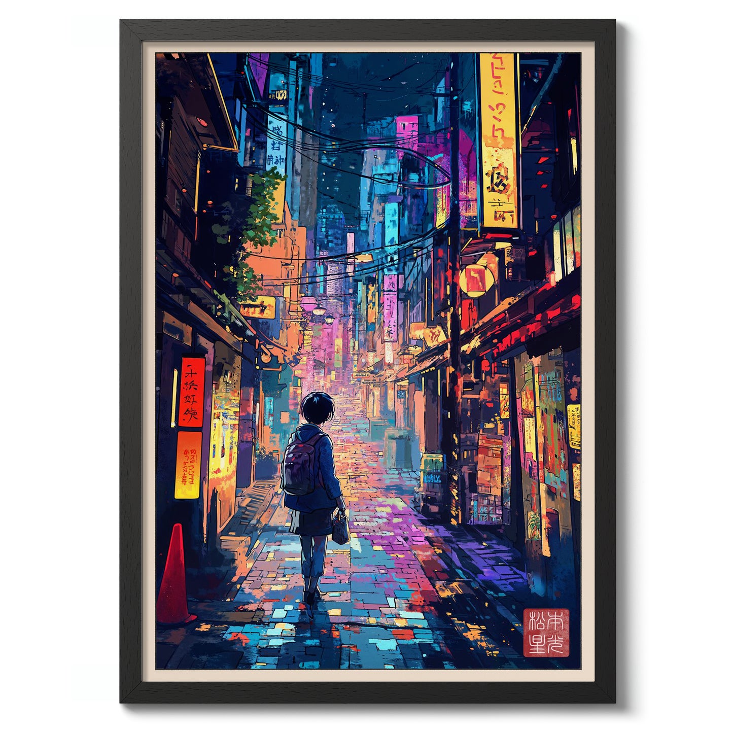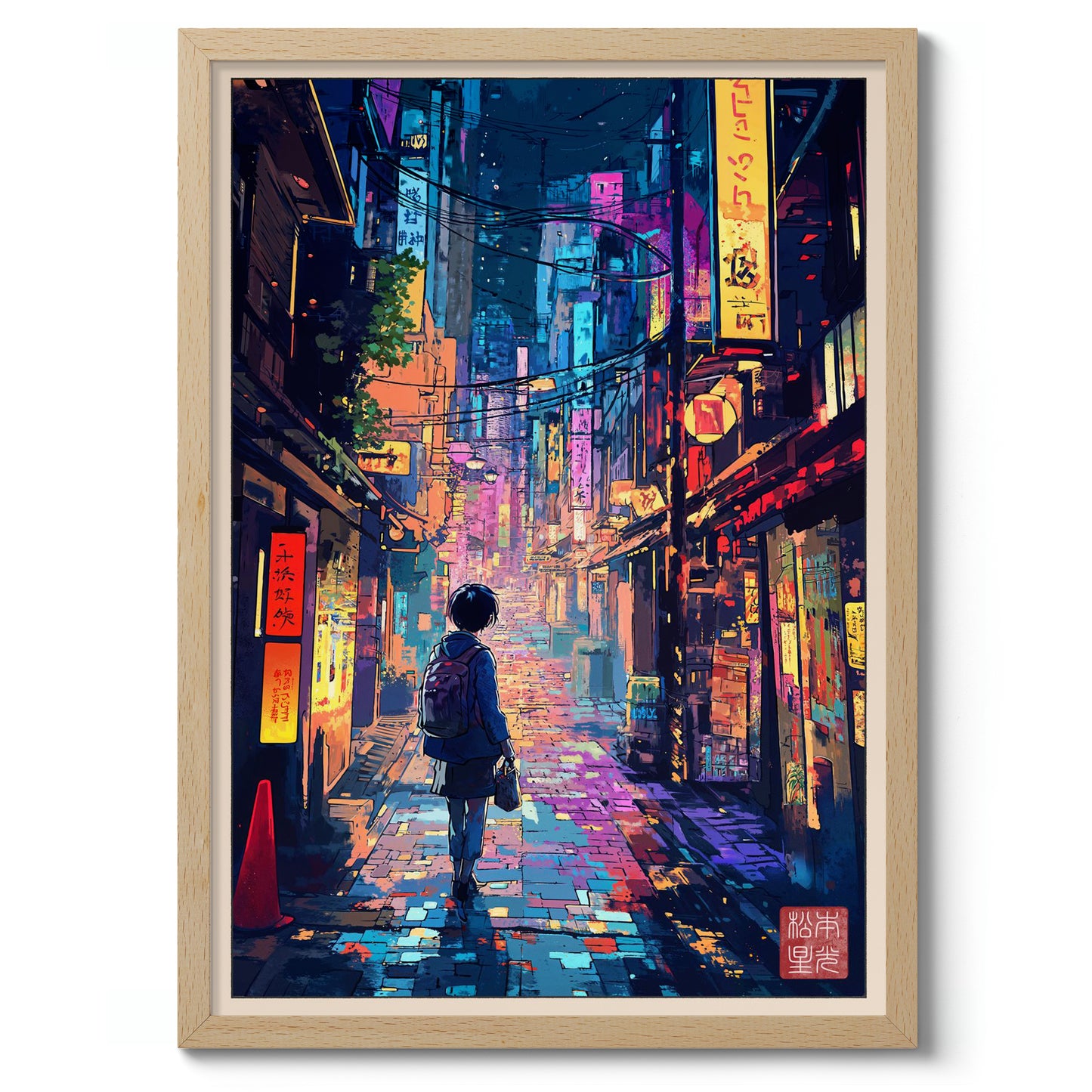 The "Tokyo Alley" poster immerses you in a vibrant Tokyo night scene, capturing a lone girl wandering through a bustling alleyway. The image is rich with neon colors, traditional woodblock influences, and the lively ambiance of a nightlife scene. With intricate detailing of a Japanese street, it evokes the essence of urban exploration under neon lights. Ideal for anime and Japanese art enthusiasts.