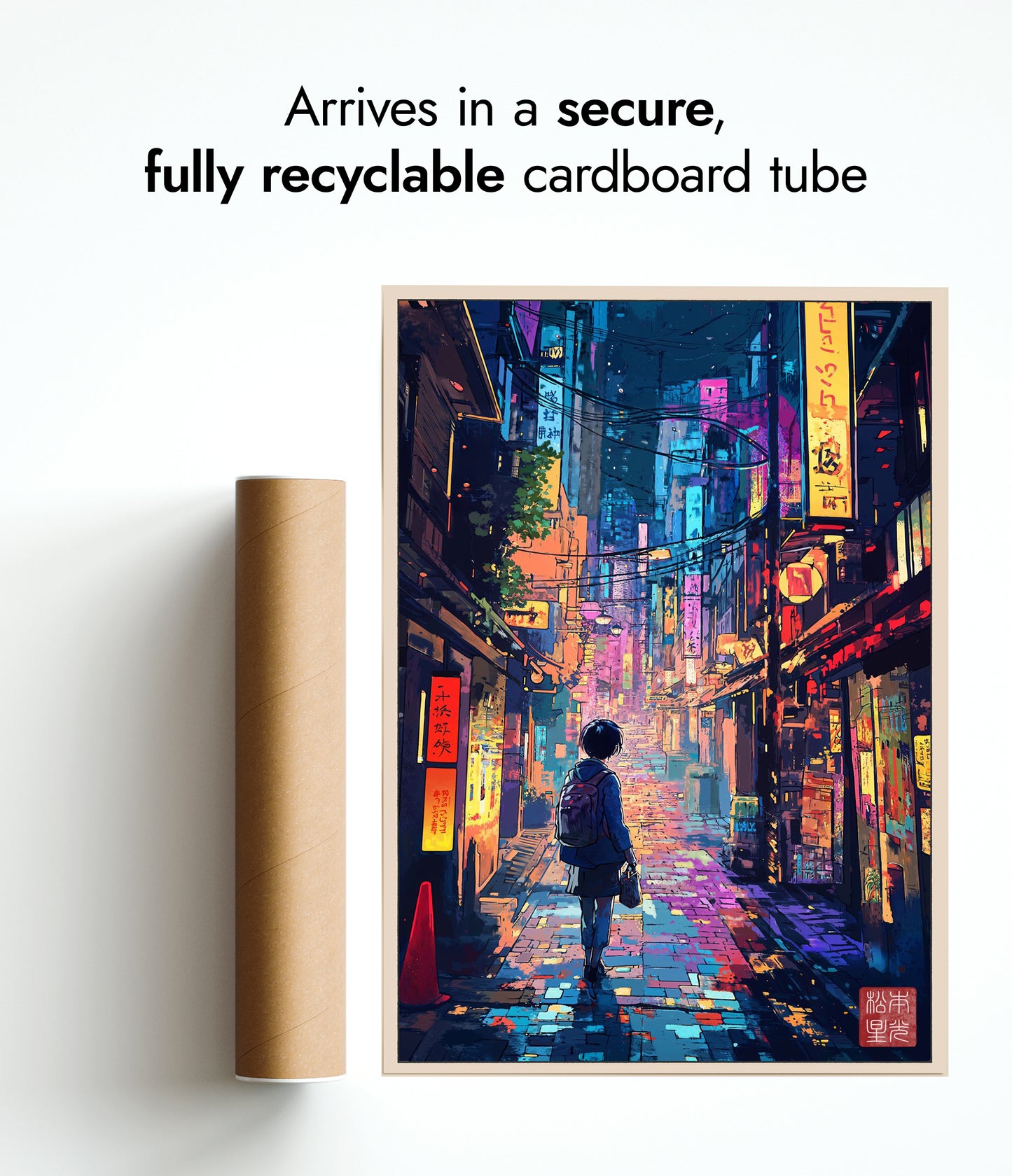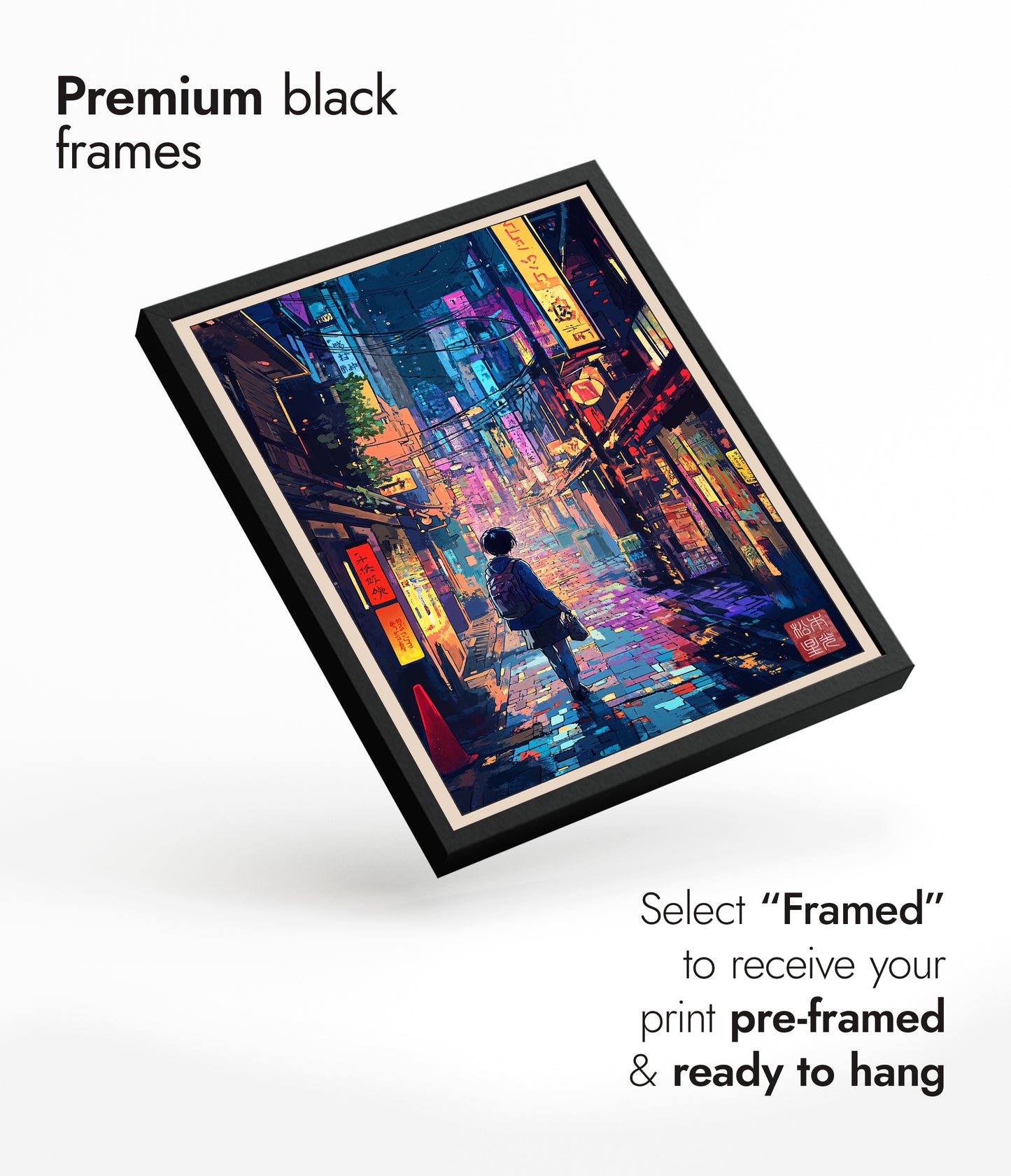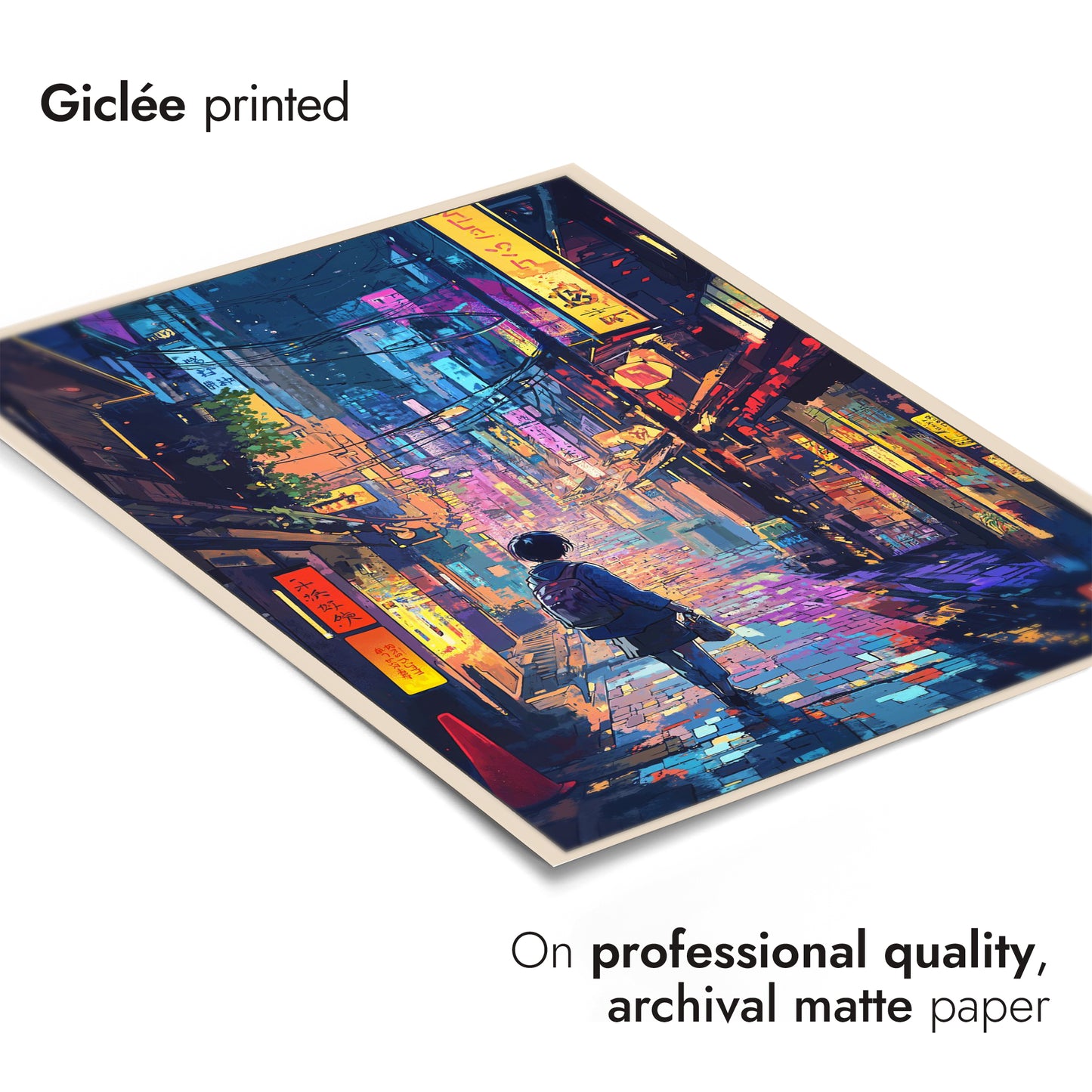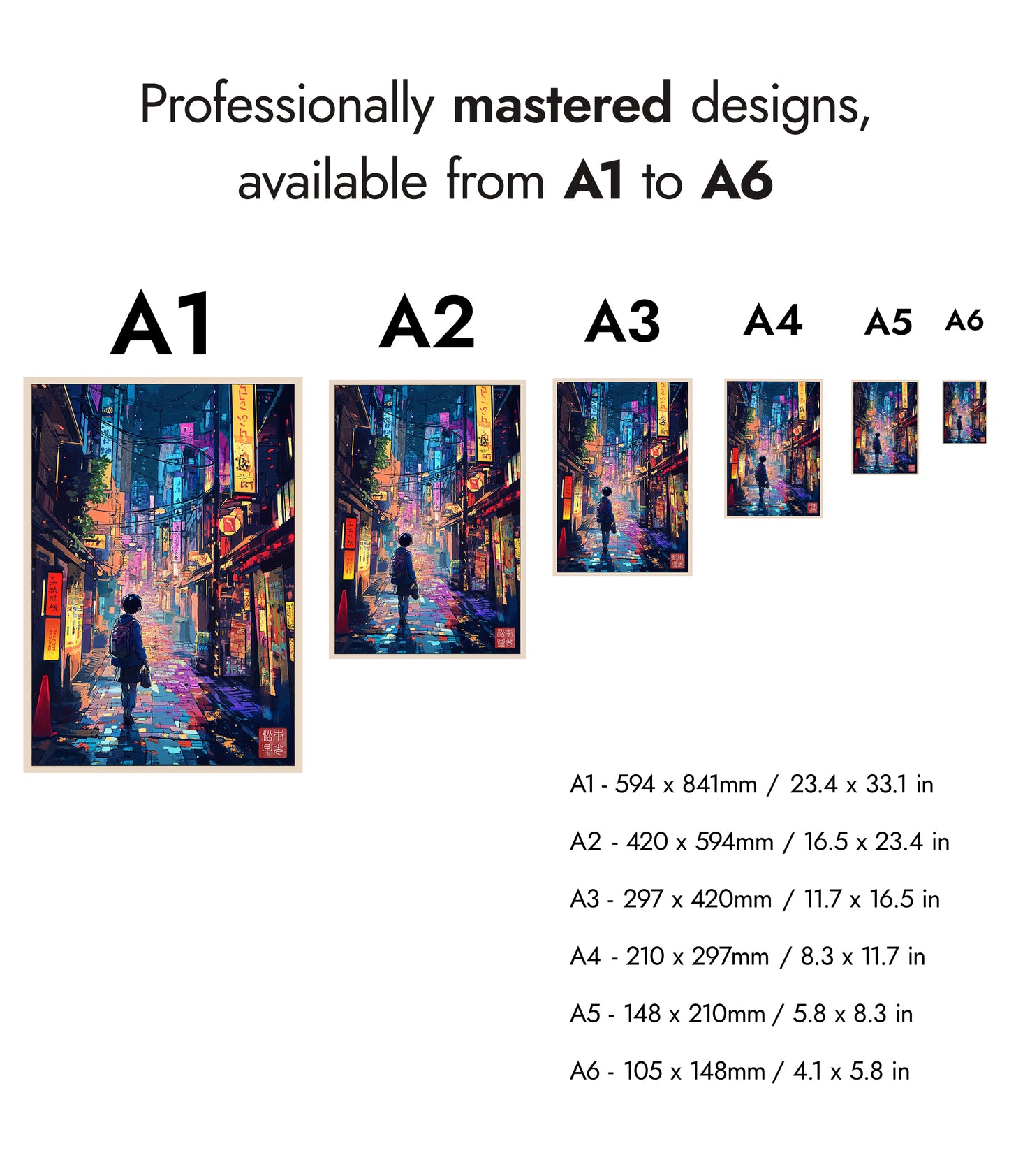 The "Tokyo Alley" poster immerses you in a vibrant Tokyo night scene, capturing a lone girl wandering through a bustling alleyway. The image is rich with neon colors, traditional woodblock influences, and the lively ambiance of a nightlife scene. With intricate detailing of a Japanese street, it evokes the essence of urban exploration under neon lights. Ideal for anime and Japanese art enthusiasts.