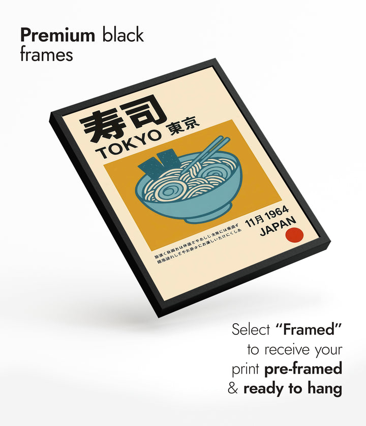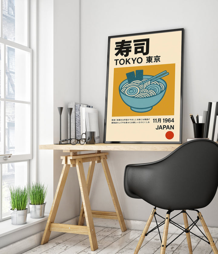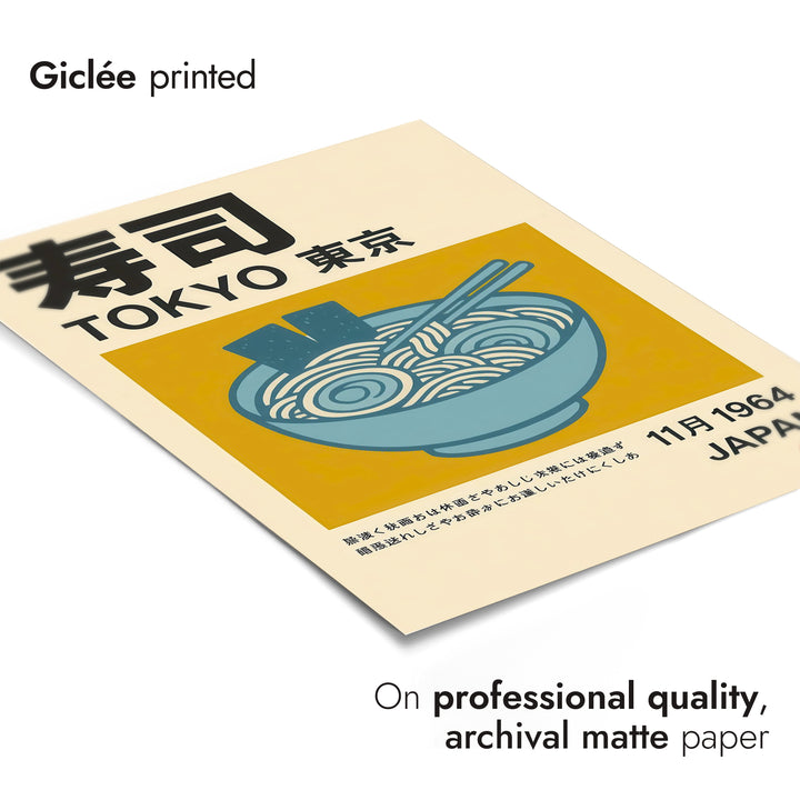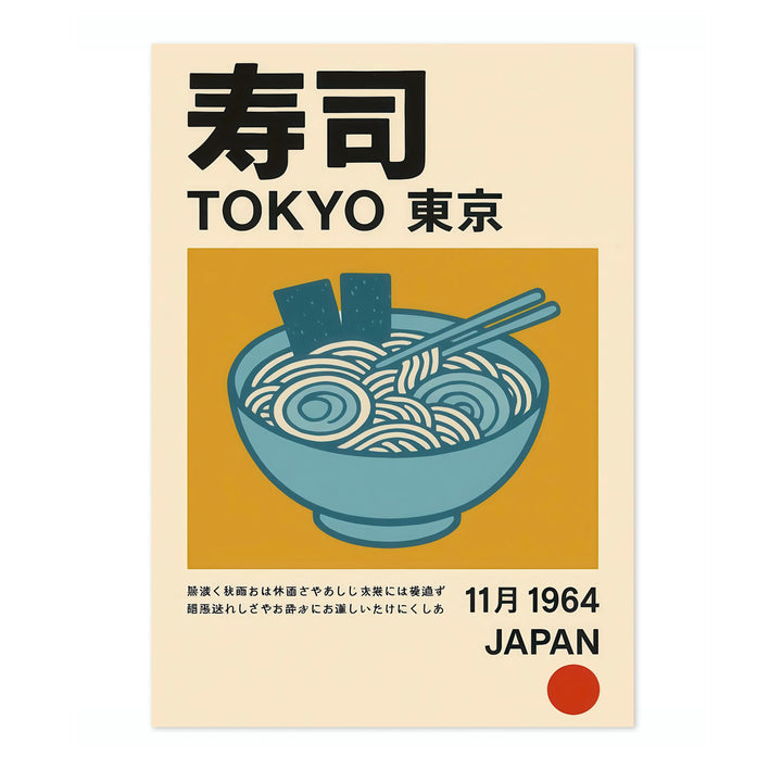 This Tokyo Ramen Exhibition poster captures the essence of traditional Japanese cuisine. Featuring a stylized bowl of ramen with chopsticks, it highlights cultural food artistry. The bold typography and minimalist graphic design reflect a 1964 aesthetic, offering a nostalgic glimpse into Japan's vibrant food scene. Ideal for enthusiasts of Japanese culture and graphic art, this print adds depth to any space.