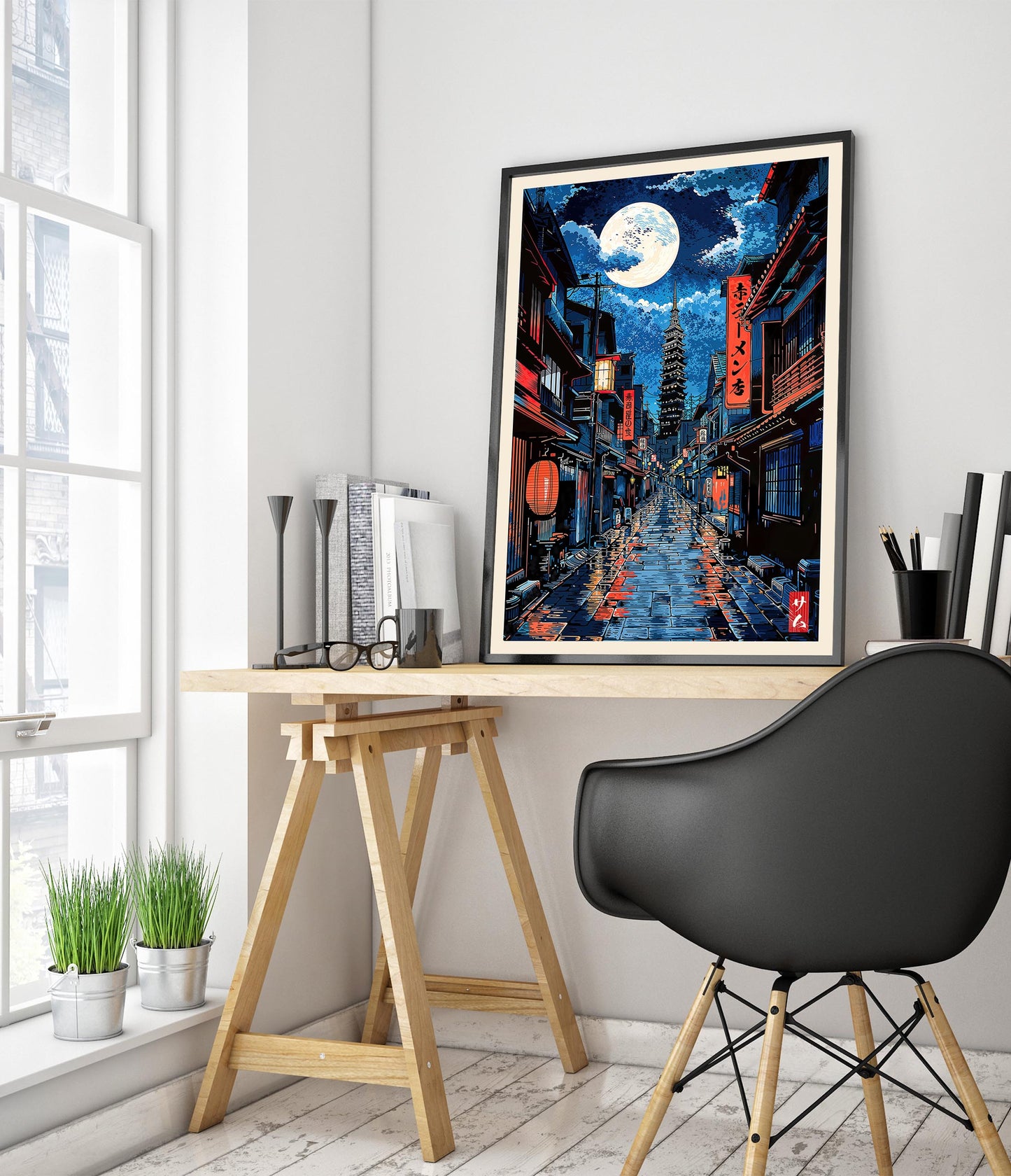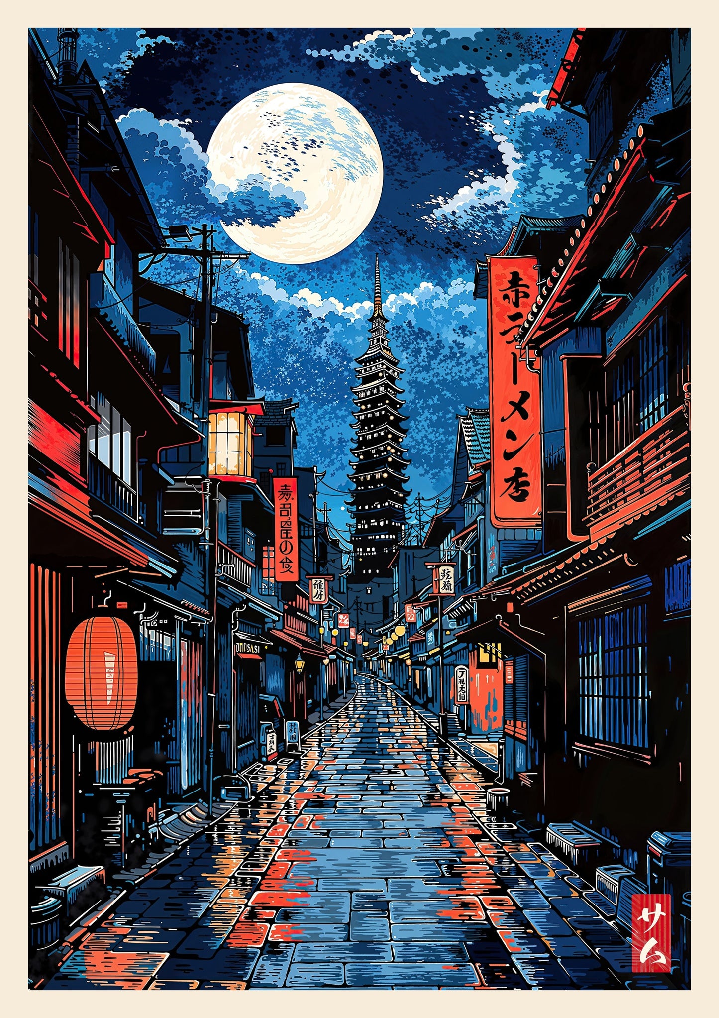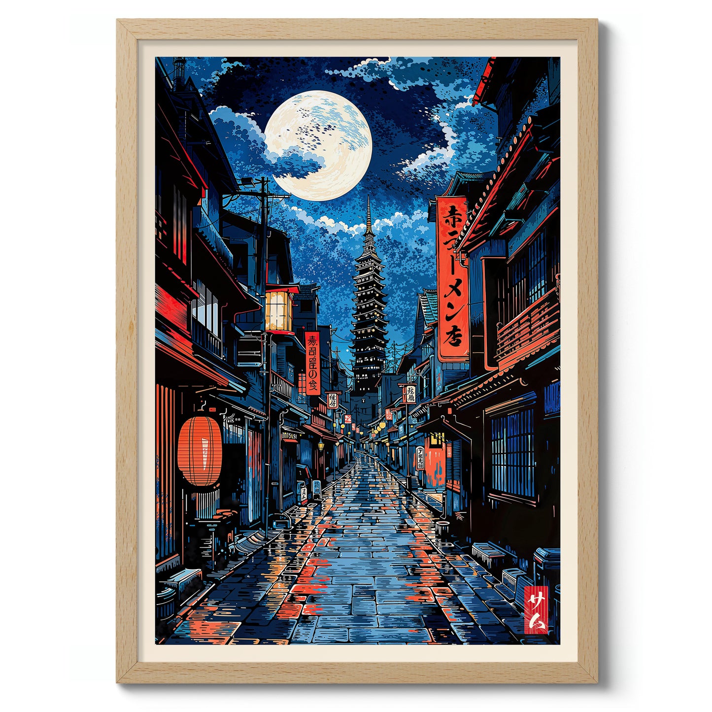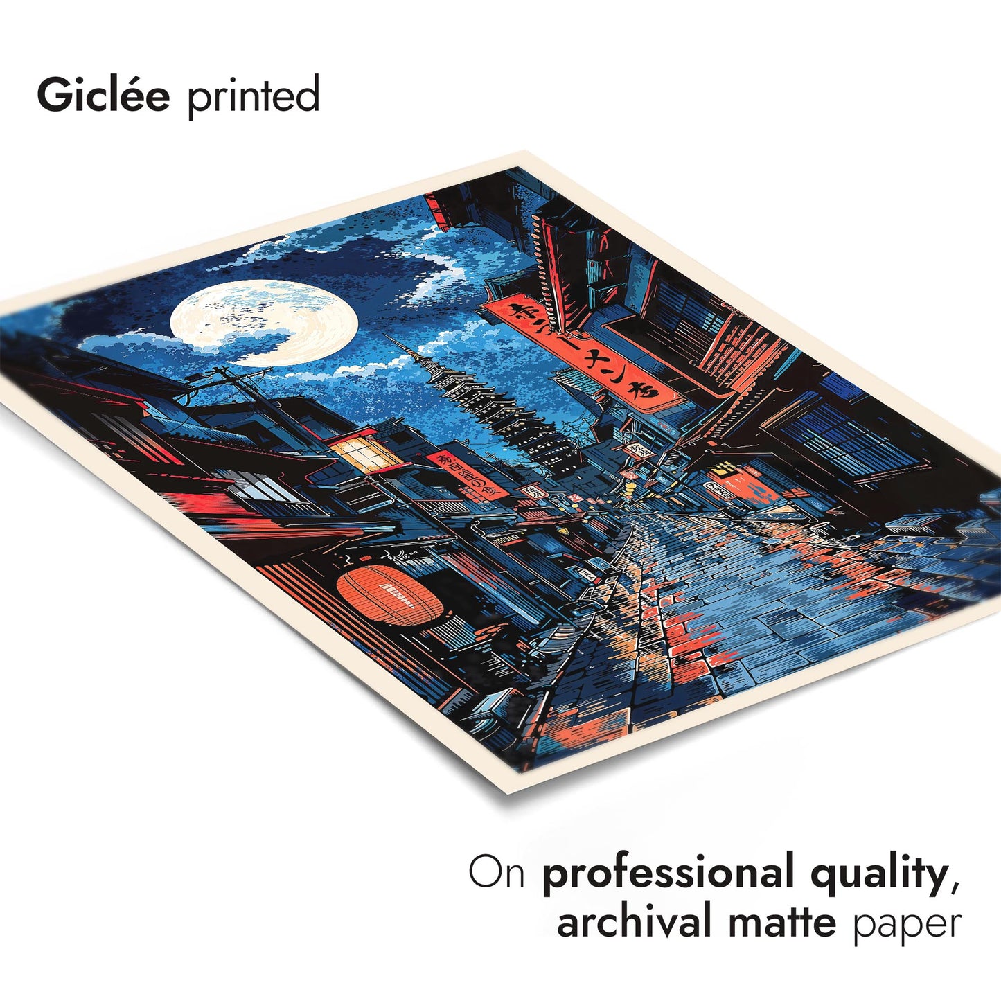 This "Tokyo Red Light" poster captures a serene night scene in Tokyo, Japan. Featuring a moonlit street with traditional Japanese architecture and a towering pagoda in the distance, the artwork showcases vivid red lanterns and reflective wet paths. Its anime illustration style brings the city's quiet beauty to life, making it an eye-catching addition to any space. Perfect for lovers of Japanese culture and nightscapes.
