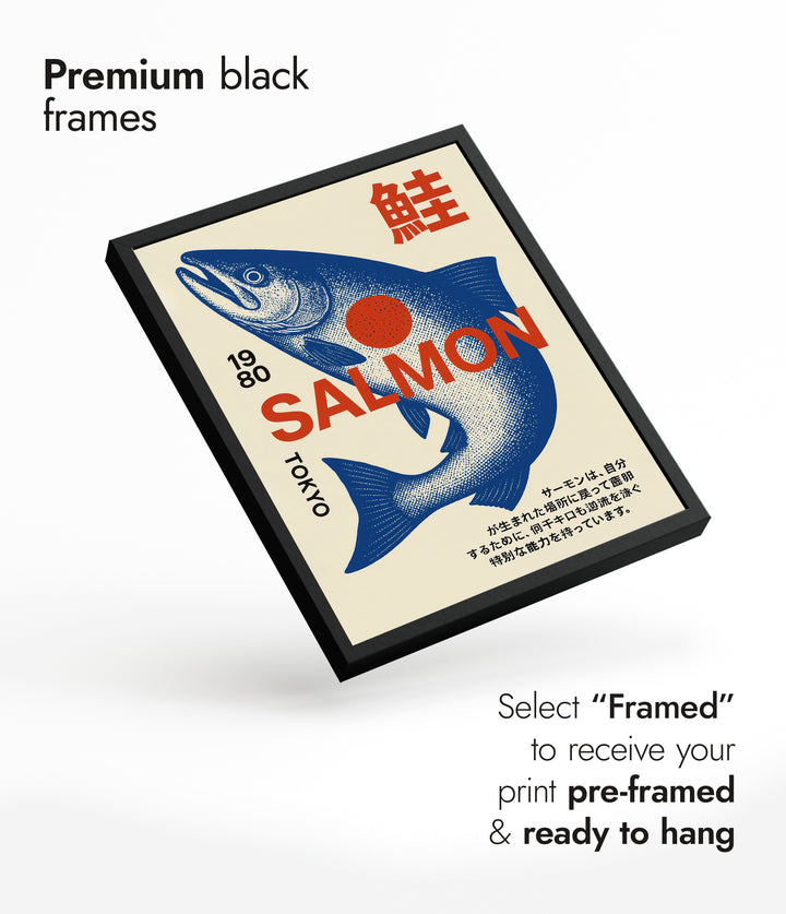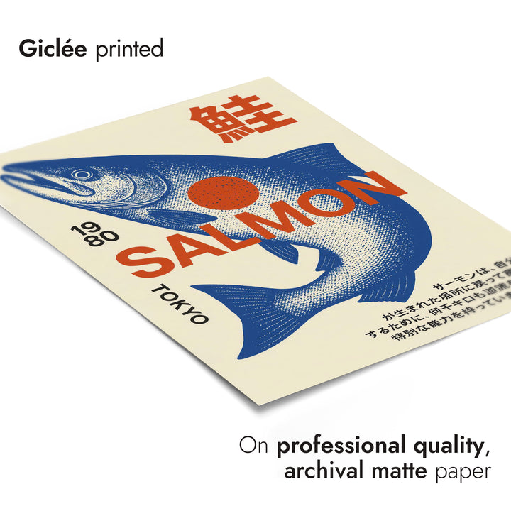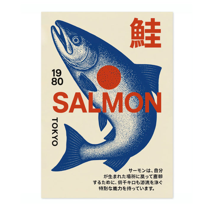 The "Tokyo Salmon 1980" poster artfully blends traditional and modern graphic design elements. Featuring a striking blue salmon against a cream background, this Japanese-inspired piece incorporates bold typography and vibrant colors. The kanji characters and the red circle nod to Tokyo's cultural essence, making it ideal for enthusiasts of Japanese art. Perfect for enhancing any space with a touch of Tokyo's artistic flair.