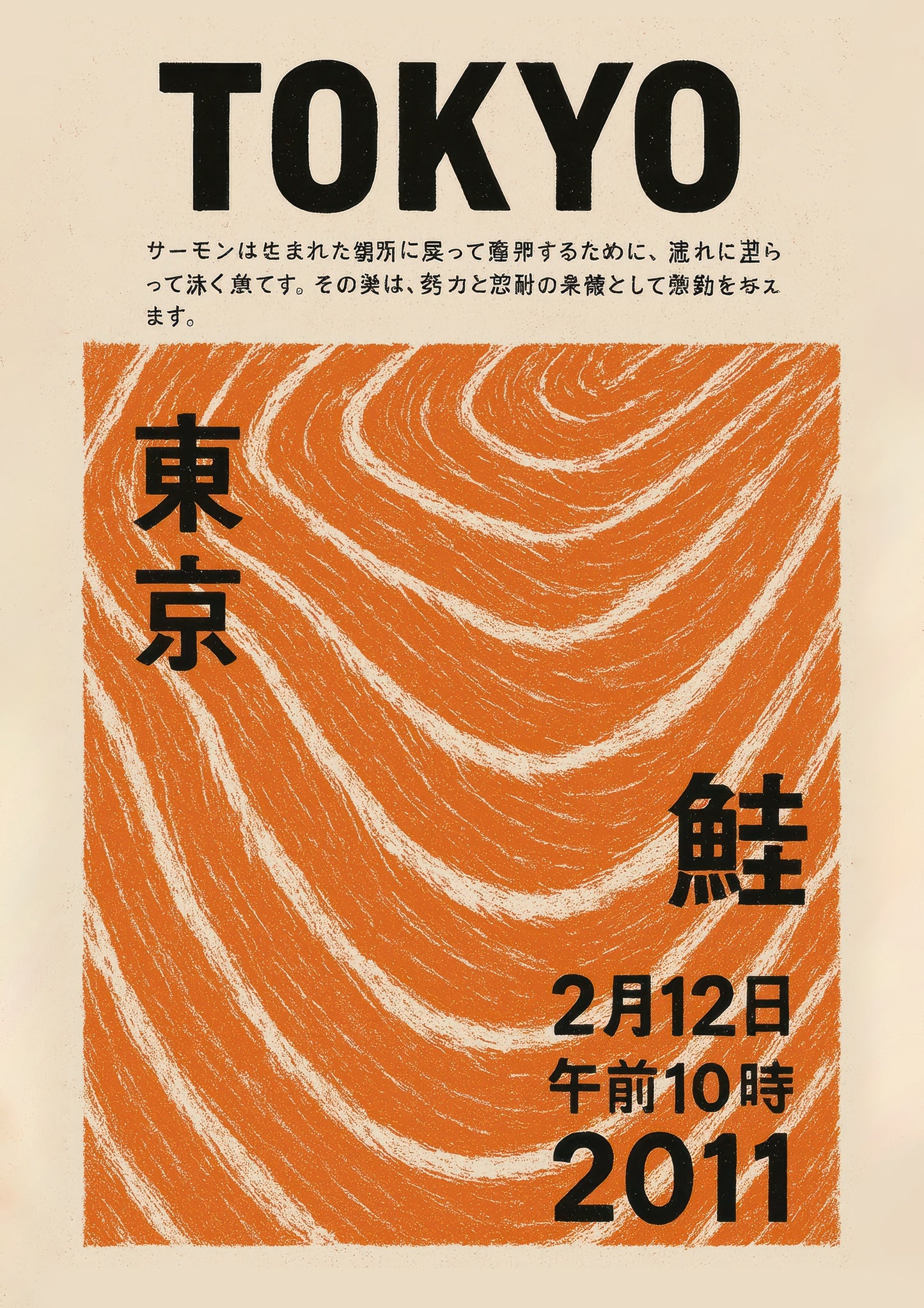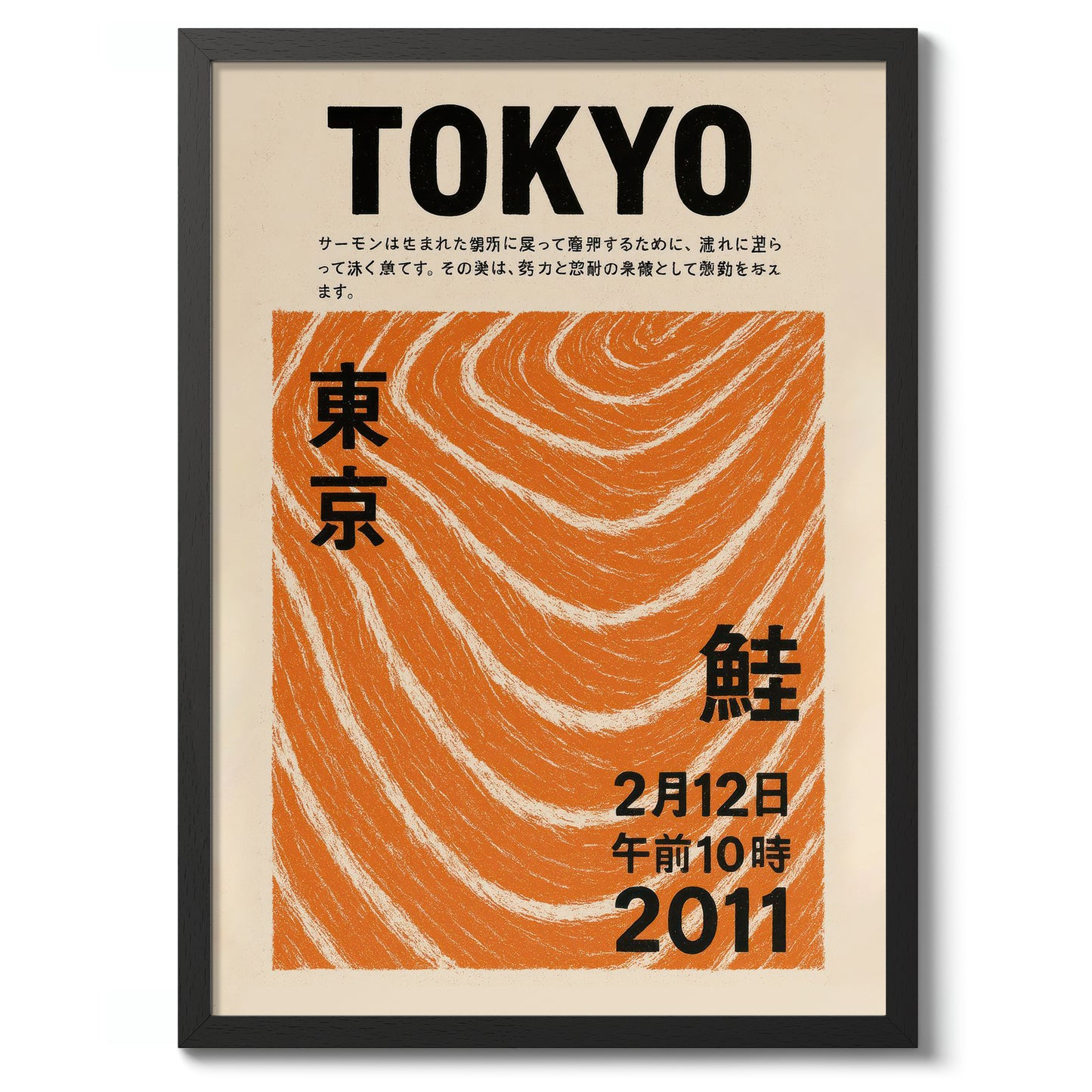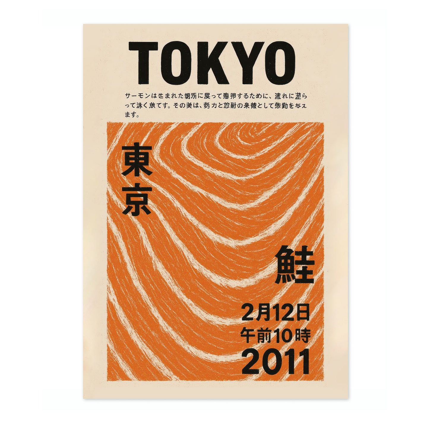 This striking Tokyo Salmon 2011 poster fuses traditional and modern aesthetics. The bold black typography contrasts against dynamic orange wave patterns, symbolizing salmon swimming upstream. Featuring key elements like Tokyo and salmon, it captivates with its cultural nods and artistic flair. Perfect for enthusiasts of Japanese art and design seeking a vibrant piece celebrating both Tokyo and its culinary icons.
