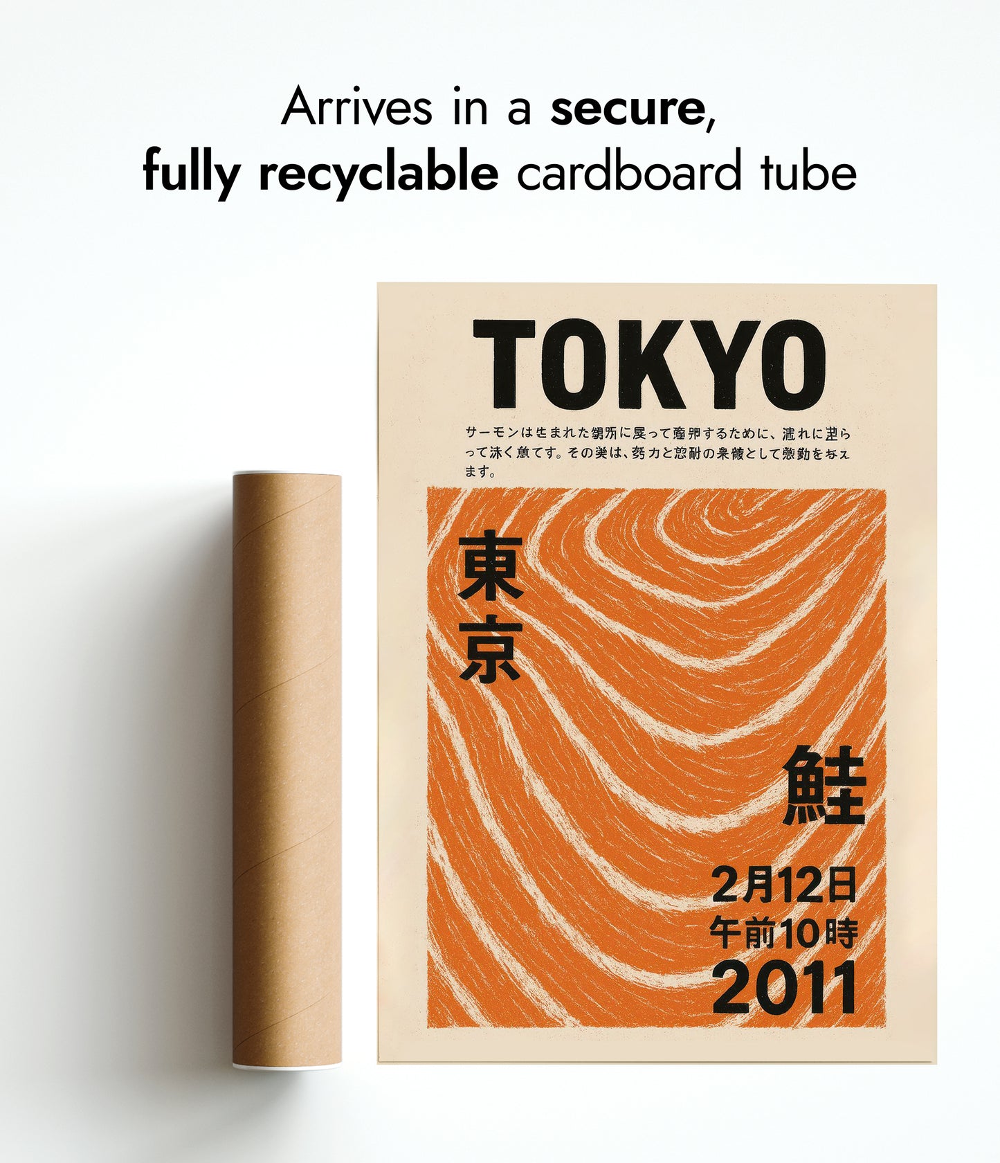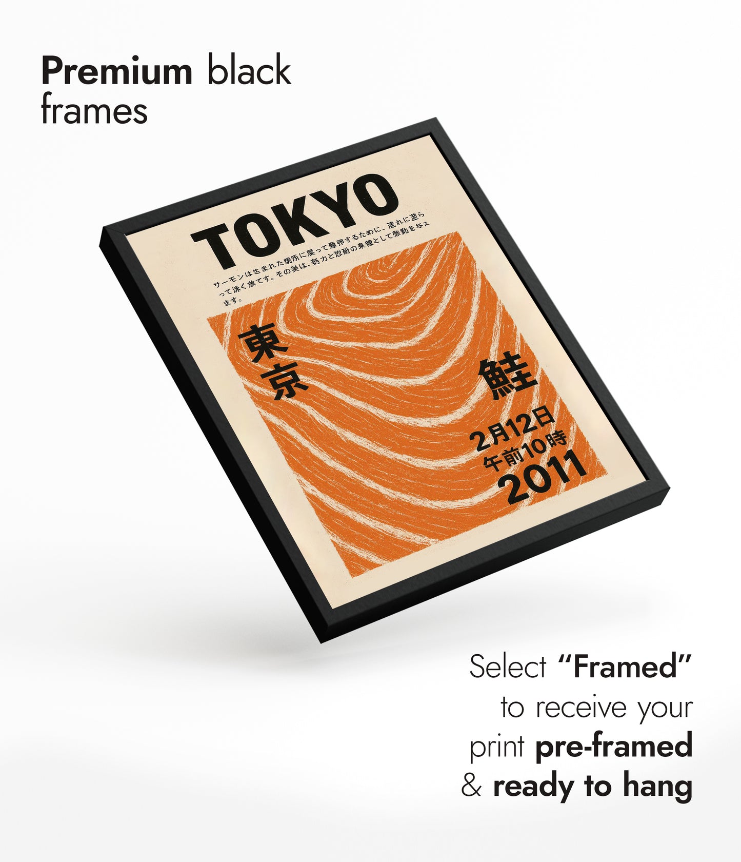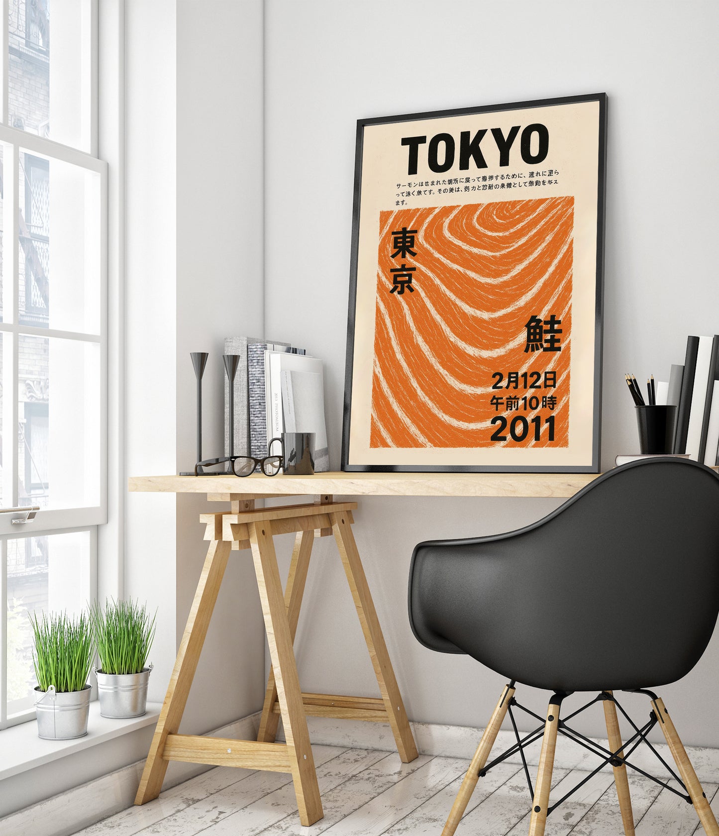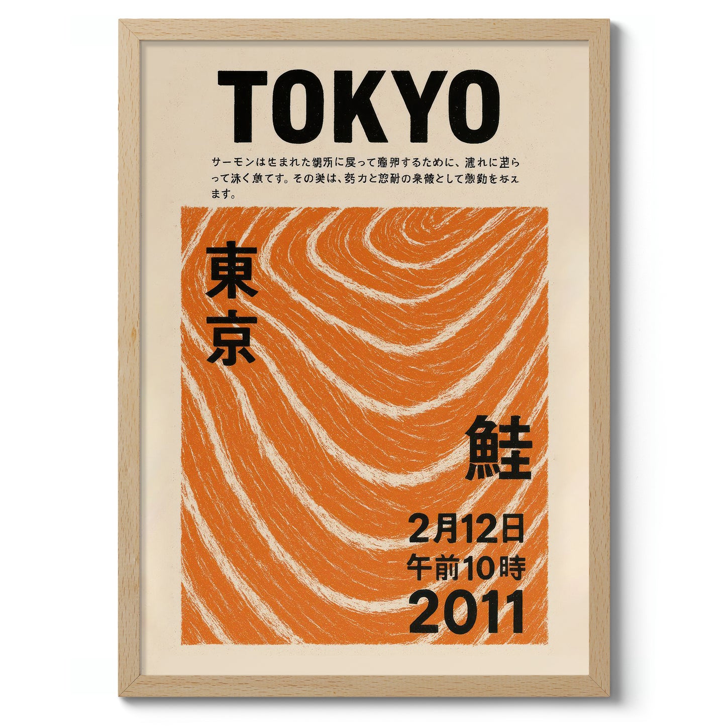 This striking Tokyo Salmon 2011 poster fuses traditional and modern aesthetics. The bold black typography contrasts against dynamic orange wave patterns, symbolizing salmon swimming upstream. Featuring key elements like Tokyo and salmon, it captivates with its cultural nods and artistic flair. Perfect for enthusiasts of Japanese art and design seeking a vibrant piece celebrating both Tokyo and its culinary icons.