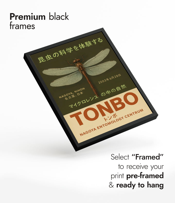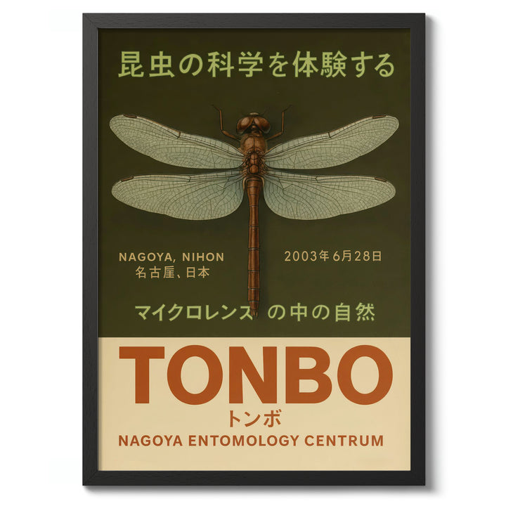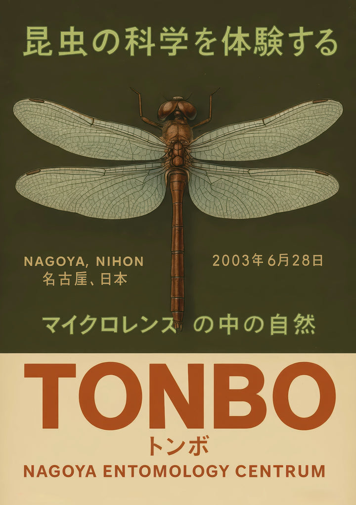 This Japanese poster titled "Tonbo" features an intricately detailed dragonfly illustration, set against an olive-green background. The design evokes a sense of naturalism and vintage appeal, highlighting the beauty and precision of insect science. The poster includes Japanese text promoting an entomology exhibit in Nagoya, Japan, emphasizing the artistry and allure of nature’s tiny wonders.