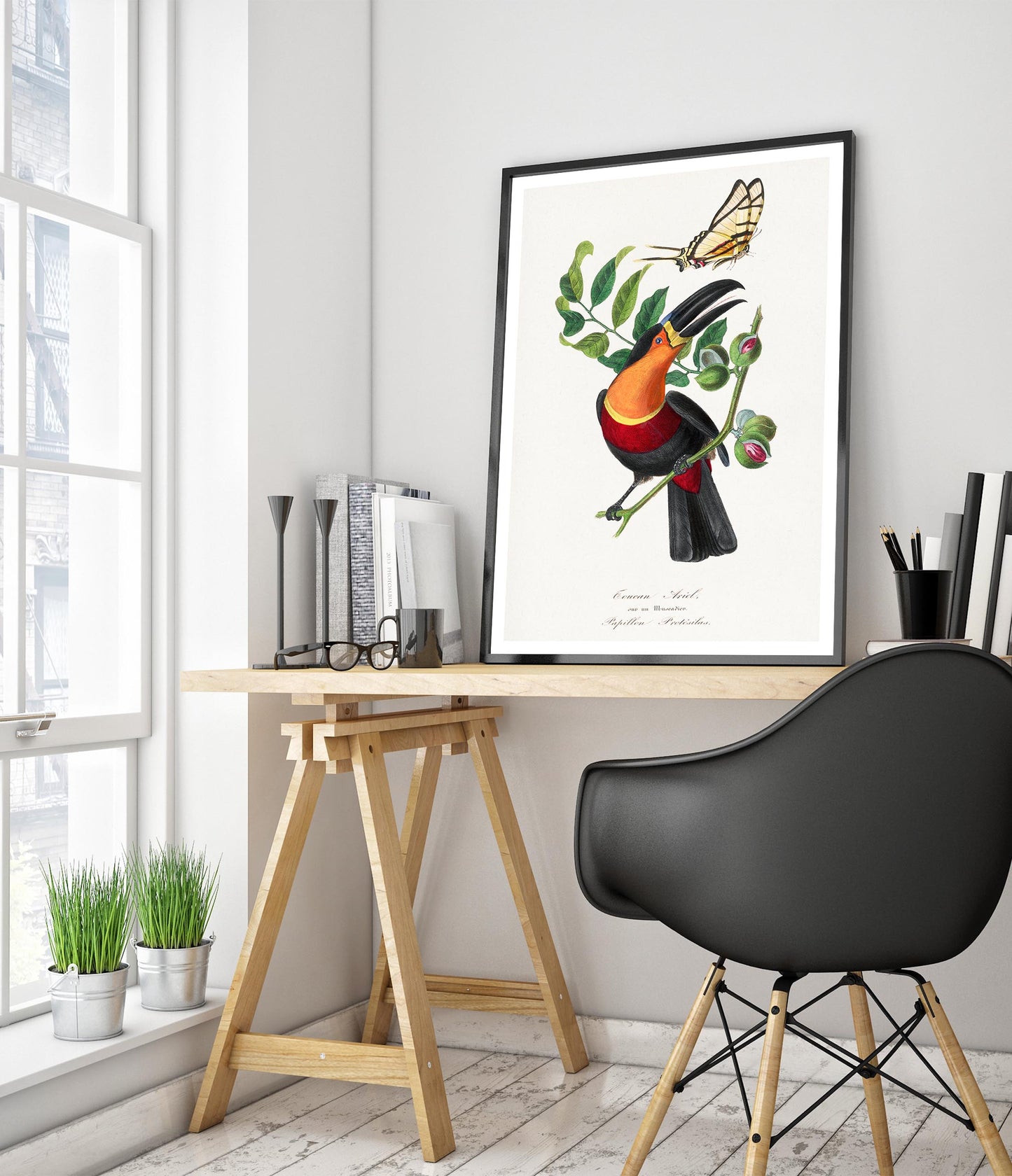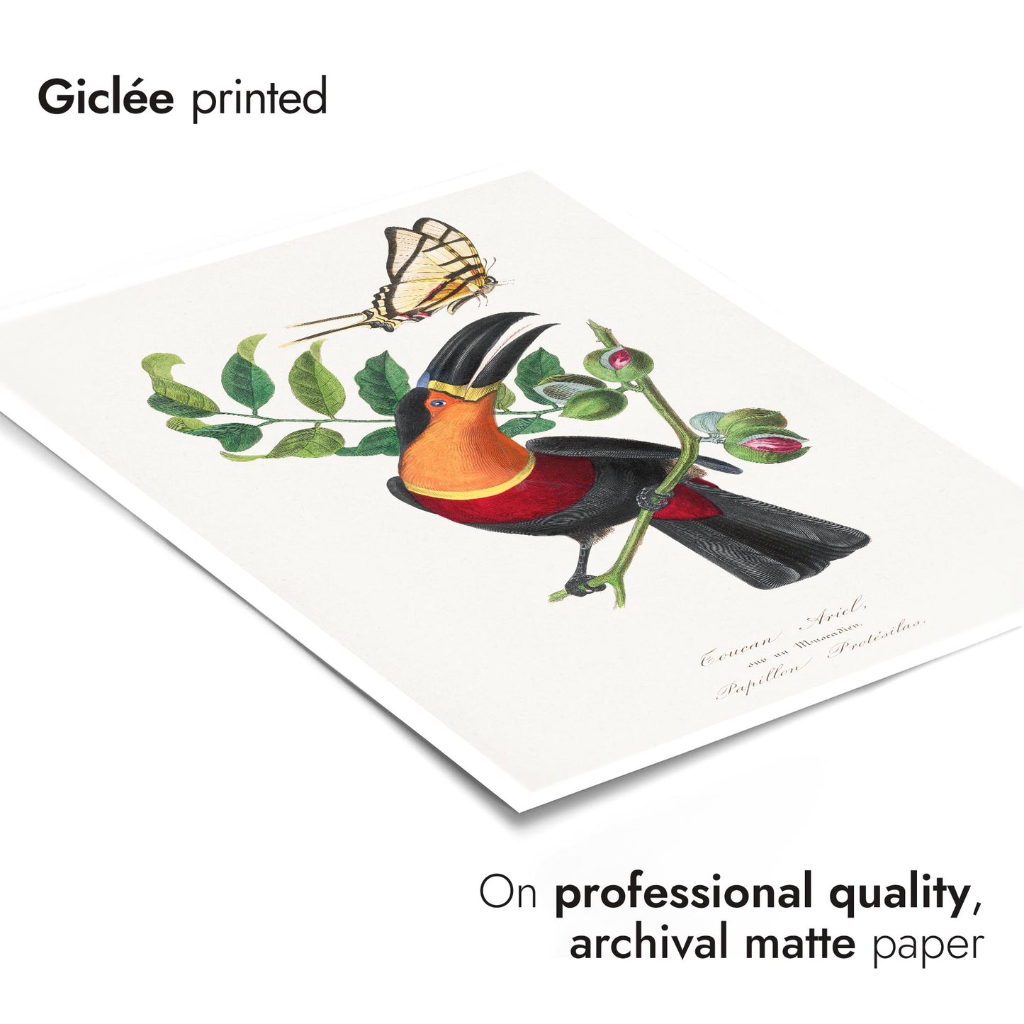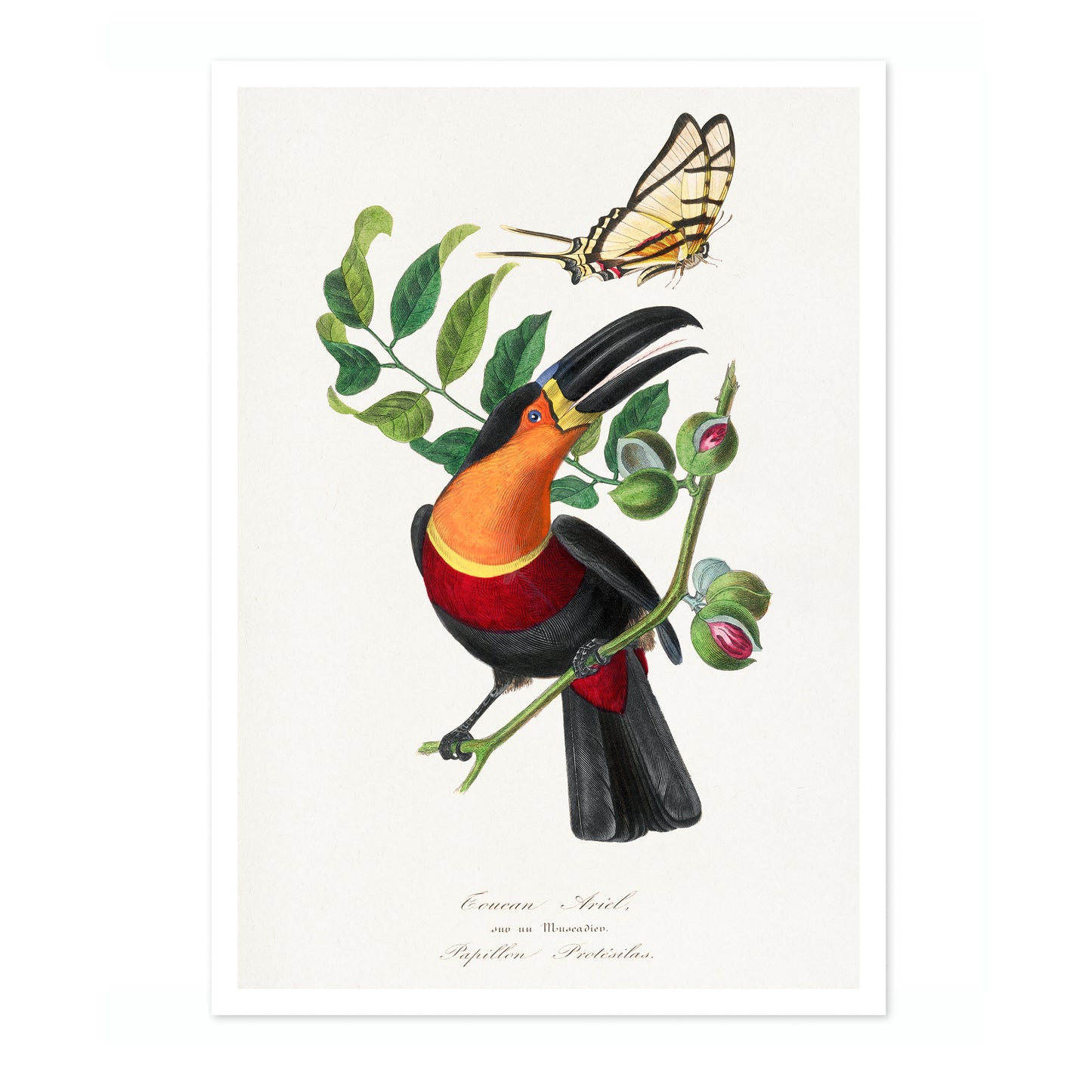 The "Toucan Ariel" poster showcases a vibrant illustration by Charles D'Orbigny. It features a striking toucan perched on a leafy branch, complemented by a delicate butterfly in flight. Richly detailed with vintage charm, this zoological artwork highlights the toucan's vivid plumage and anatomically precise insect elements. Ideal for nature enthusiasts, this portrait effortlessly blends botanical and animal themes.