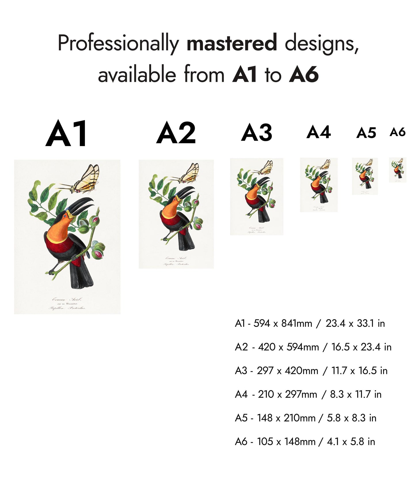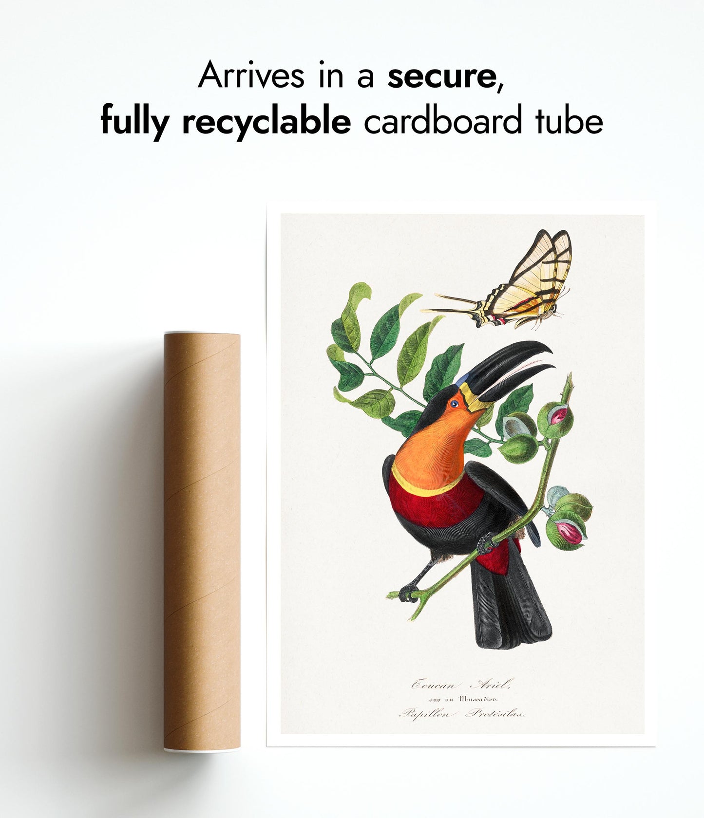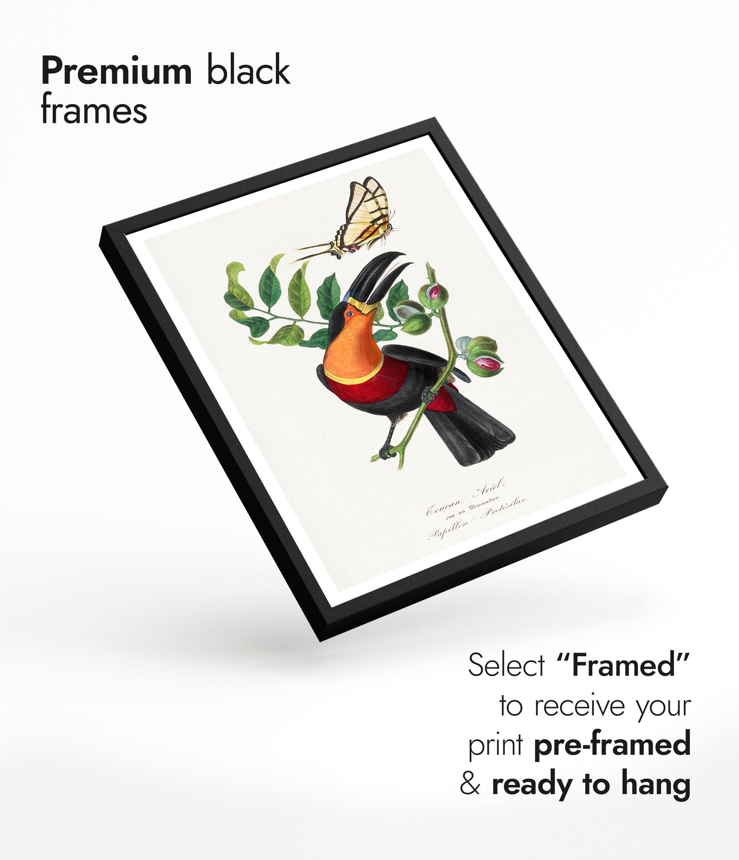 The "Toucan Ariel" poster showcases a vibrant illustration by Charles D'Orbigny. It features a striking toucan perched on a leafy branch, complemented by a delicate butterfly in flight. Richly detailed with vintage charm, this zoological artwork highlights the toucan's vivid plumage and anatomically precise insect elements. Ideal for nature enthusiasts, this portrait effortlessly blends botanical and animal themes.