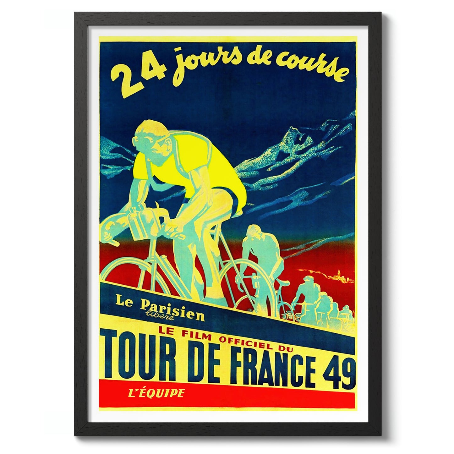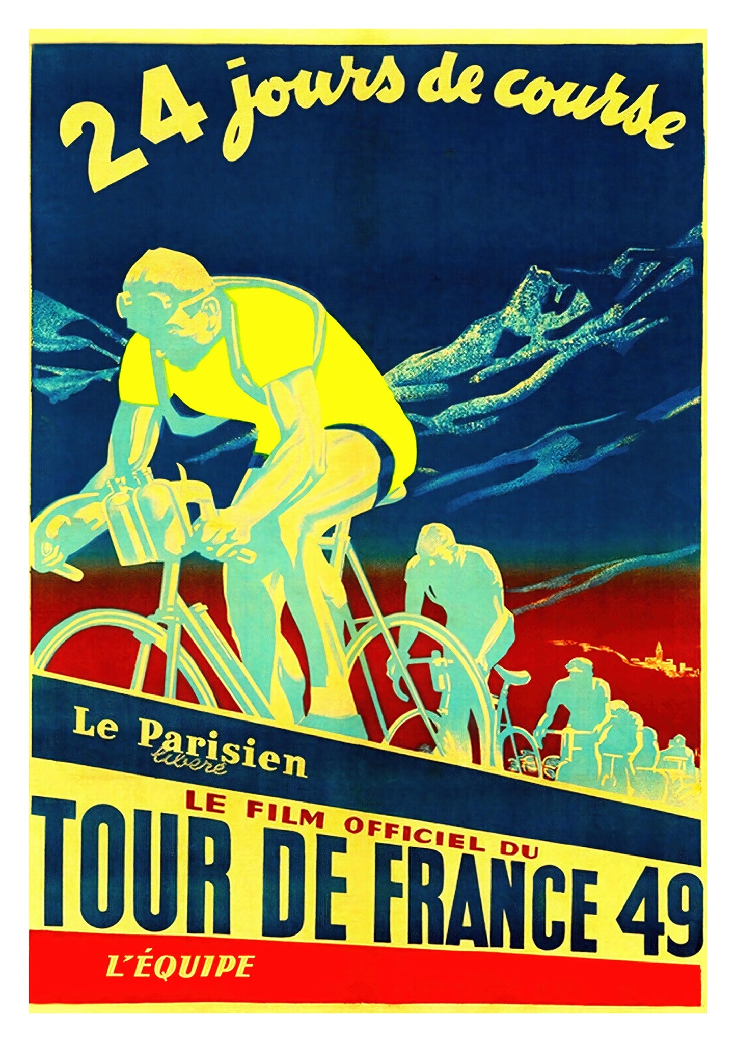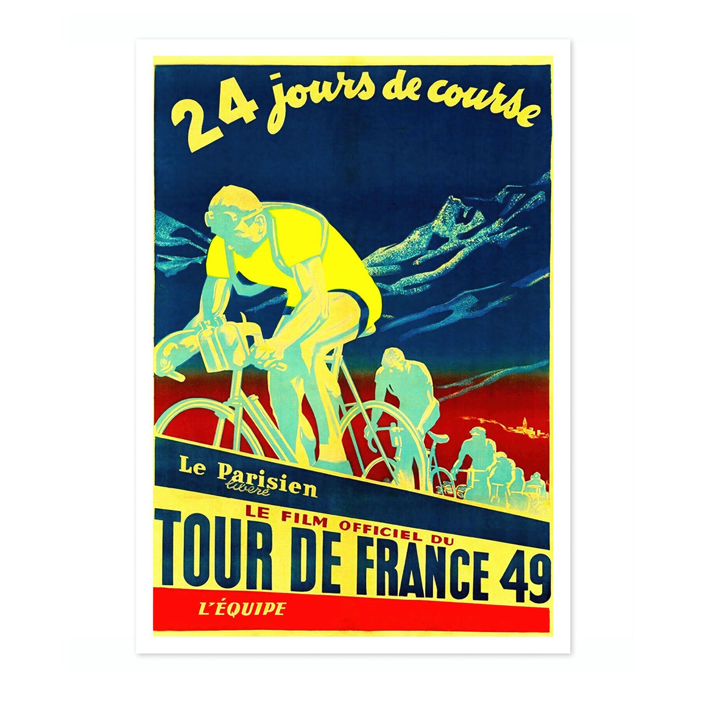 This vintage Tour de France 49 poster features cyclists in motion against a striking mountain backdrop. The bold blue, yellow, and red color palette captures the dynamic energy of this legendary race. With the title "Le Film Officiel du Tour de France 49," this cycling art print reflects the history and excitement of this iconic French sporting event.