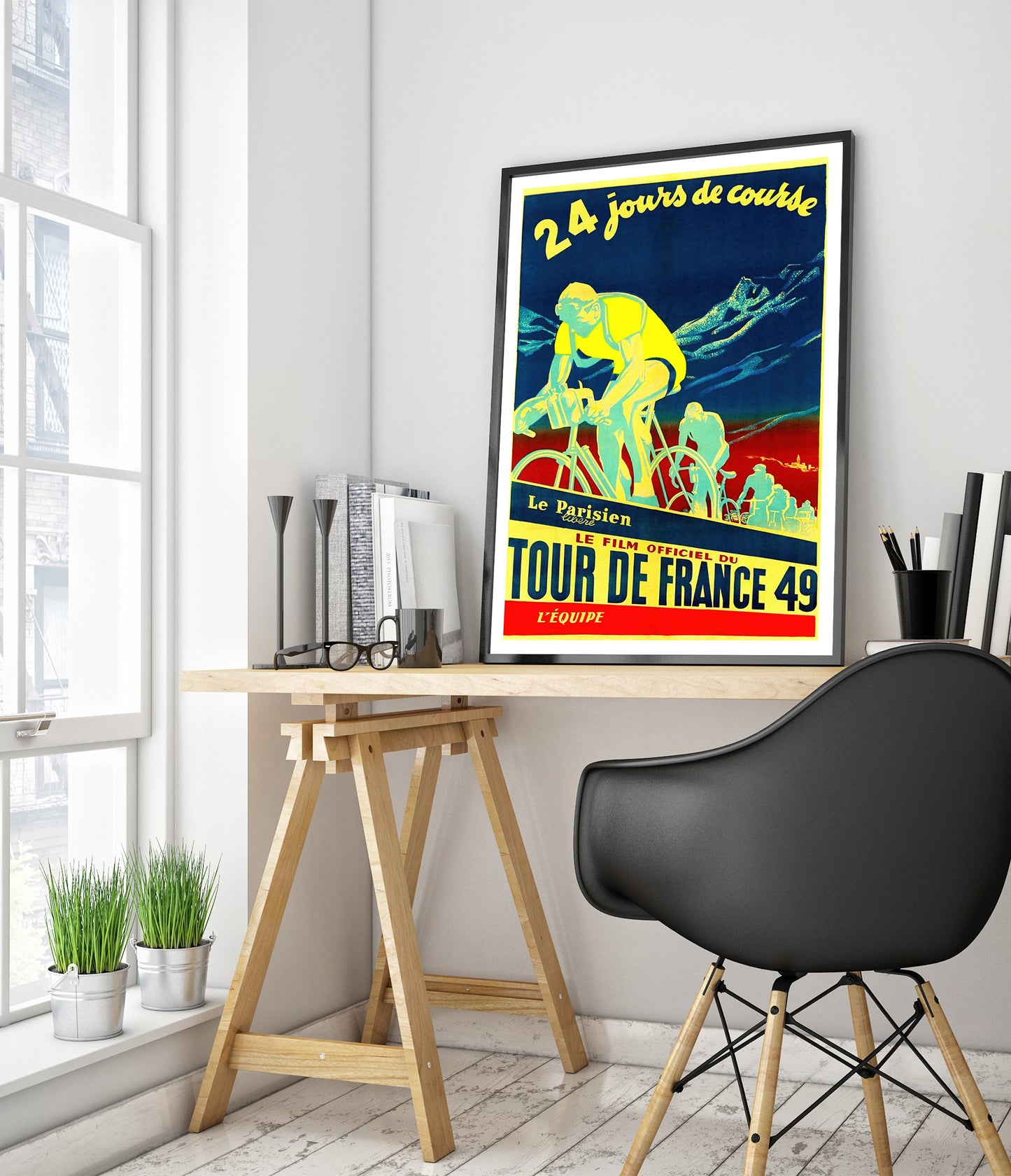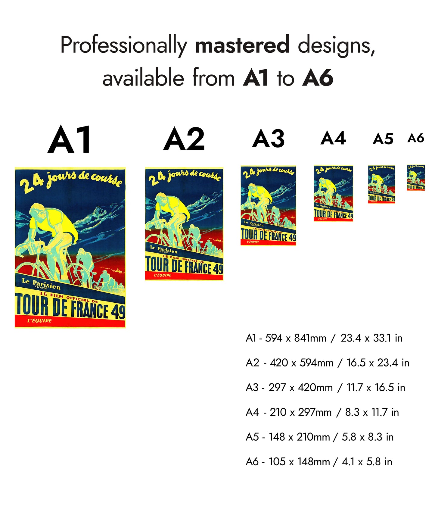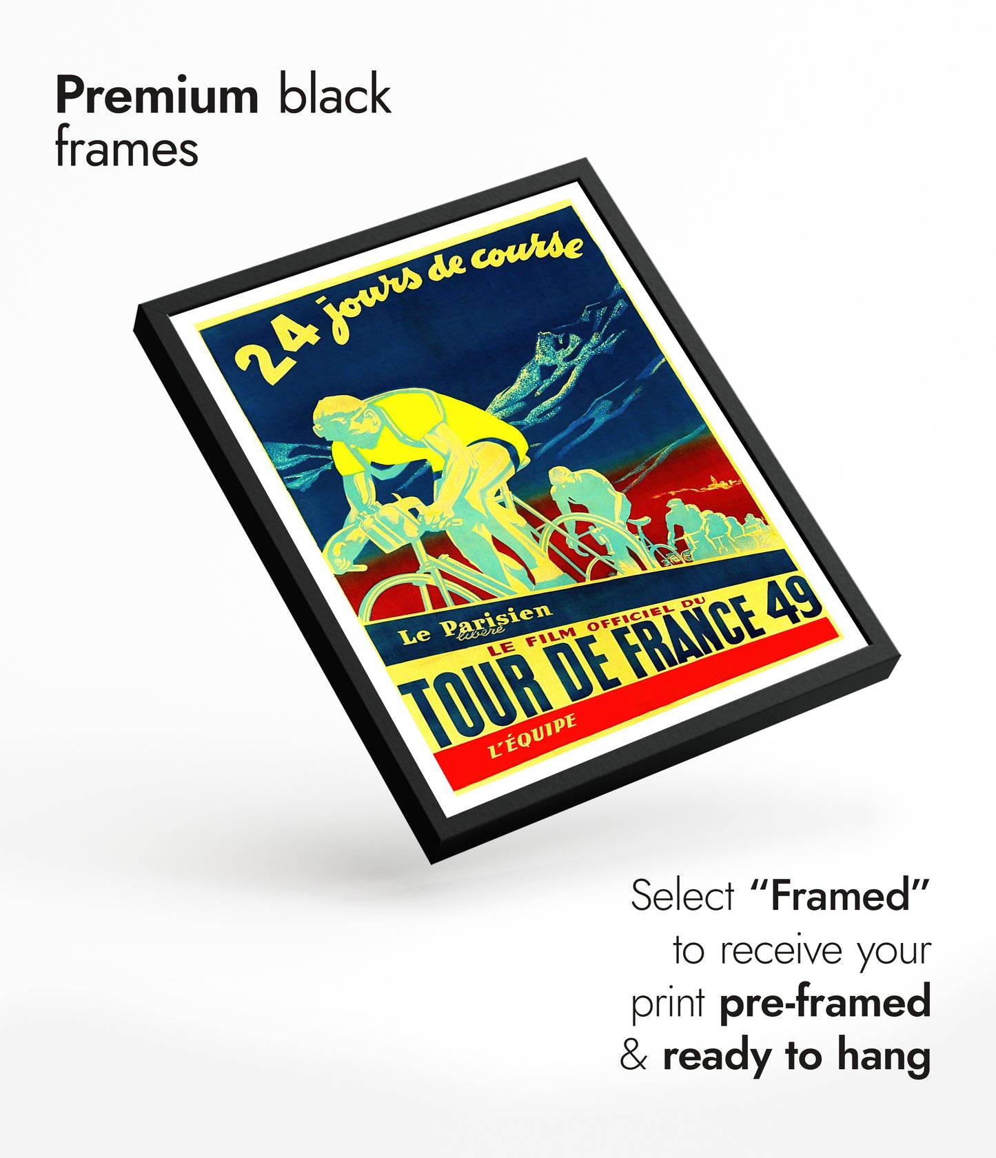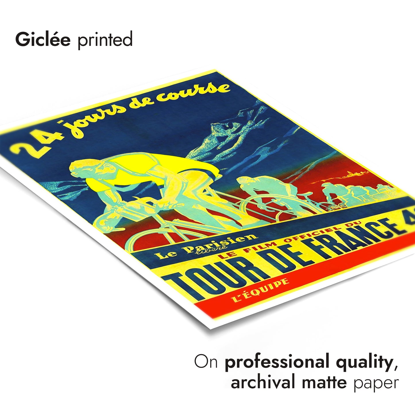 This vintage Tour de France 49 poster features cyclists in motion against a striking mountain backdrop. The bold blue, yellow, and red color palette captures the dynamic energy of this legendary race. With the title "Le Film Officiel du Tour de France 49," this cycling art print reflects the history and excitement of this iconic French sporting event.
