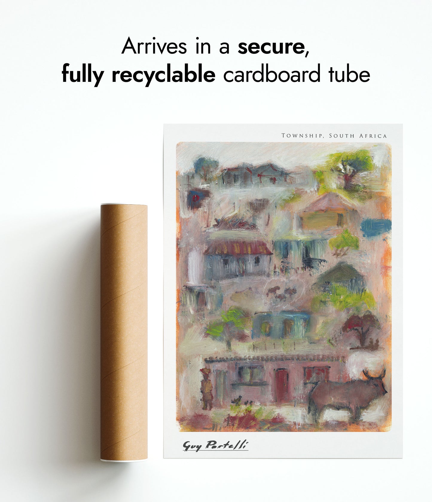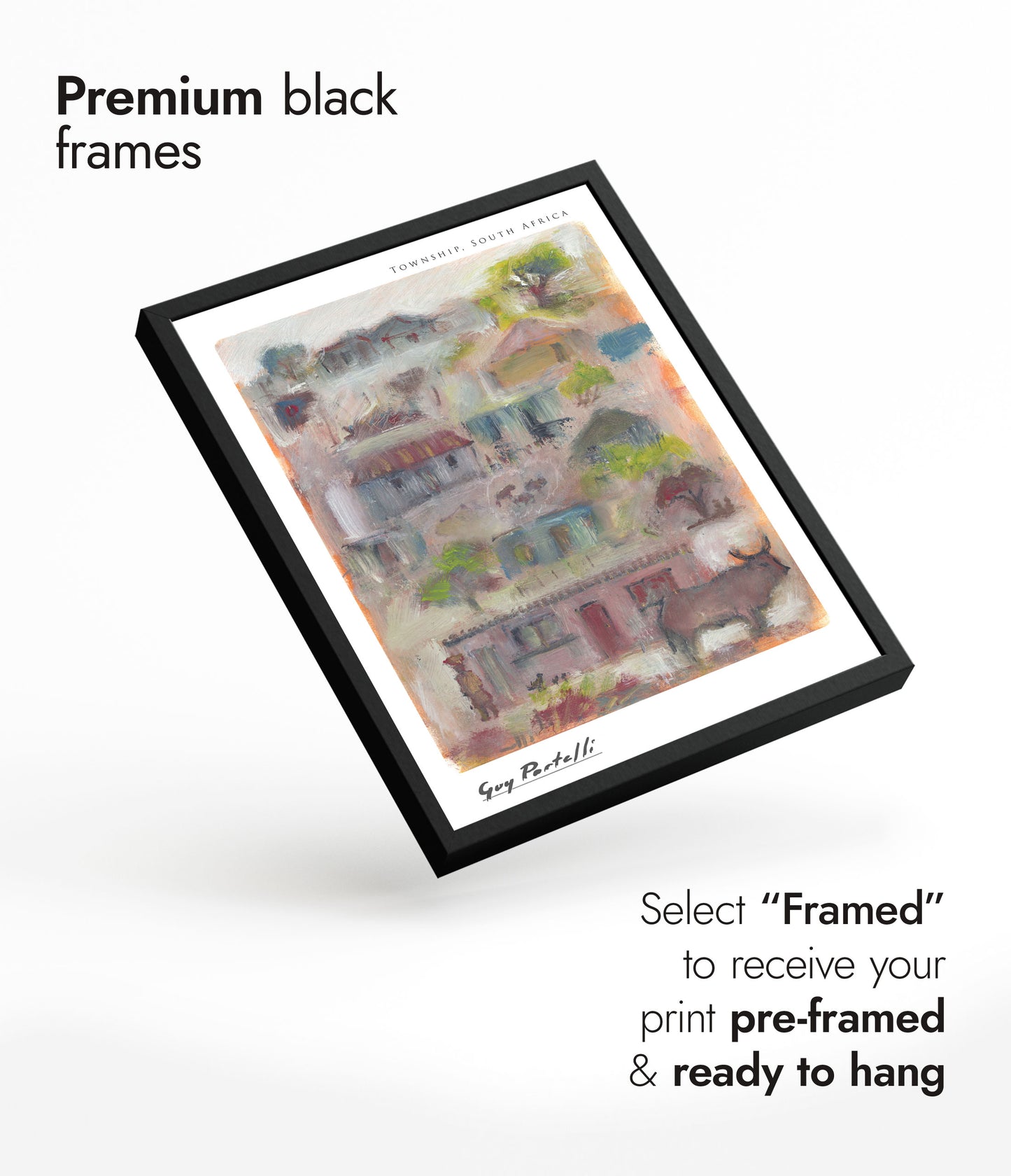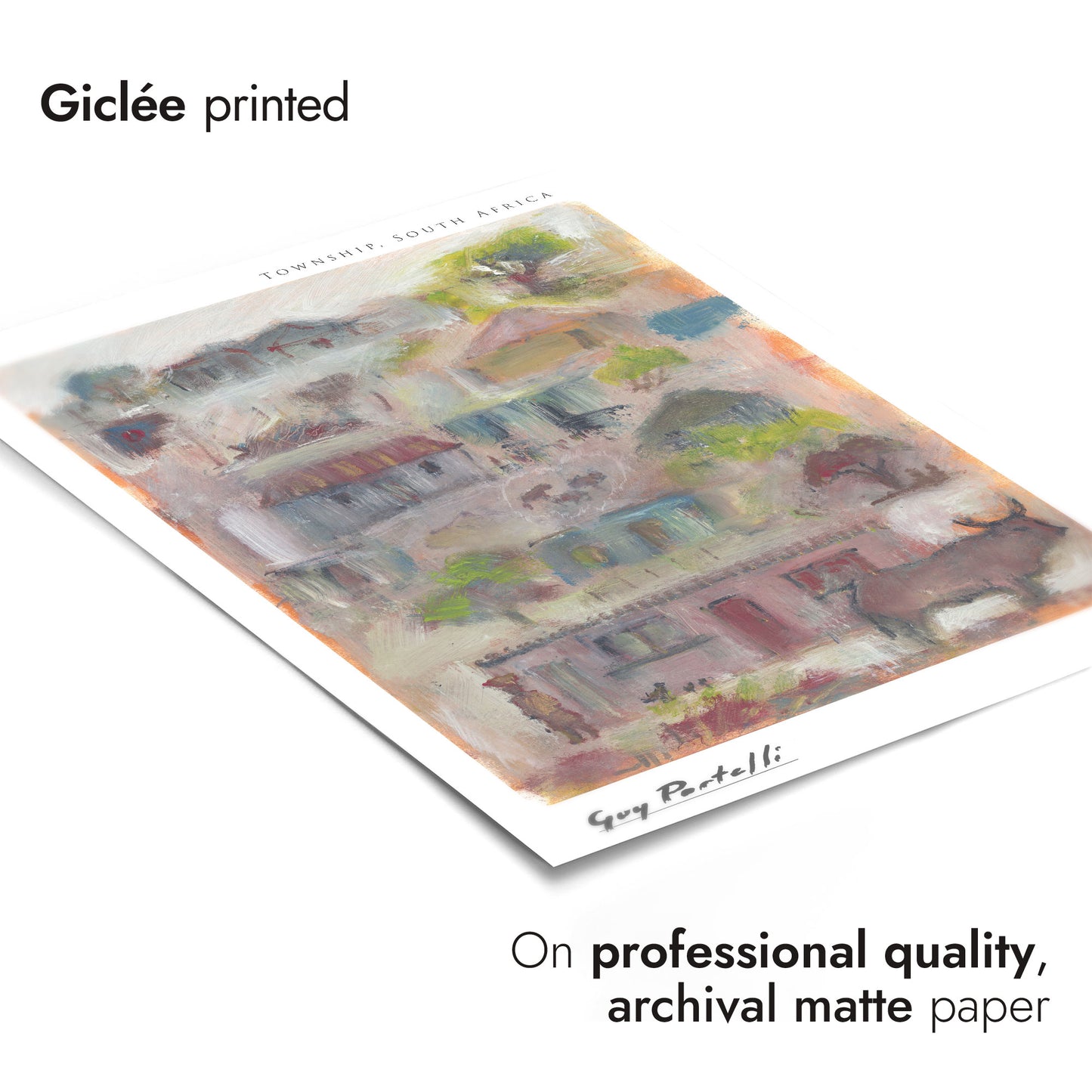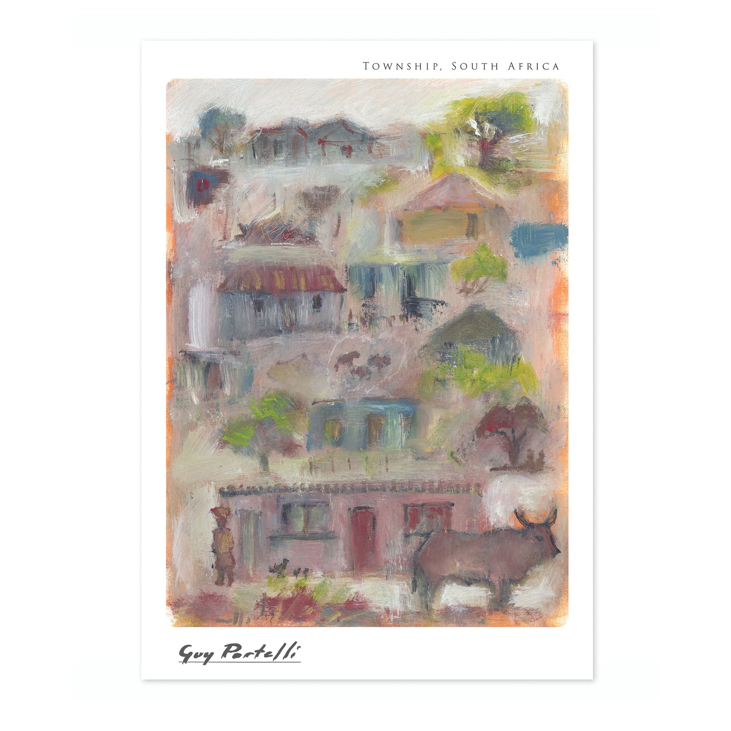 Celebrate South African life with this evocative "Township, South Africa" poster by Guy Portelli. Rich watercolours depict a lively village scene with rustic houses, a grazing bull, and abundant nature. The soft brushstrokes and earthy palette beautifully capture the essence of rural African life, making this art print a captivating addition to any space. Perfect for landscape and cultural art enthusiasts.