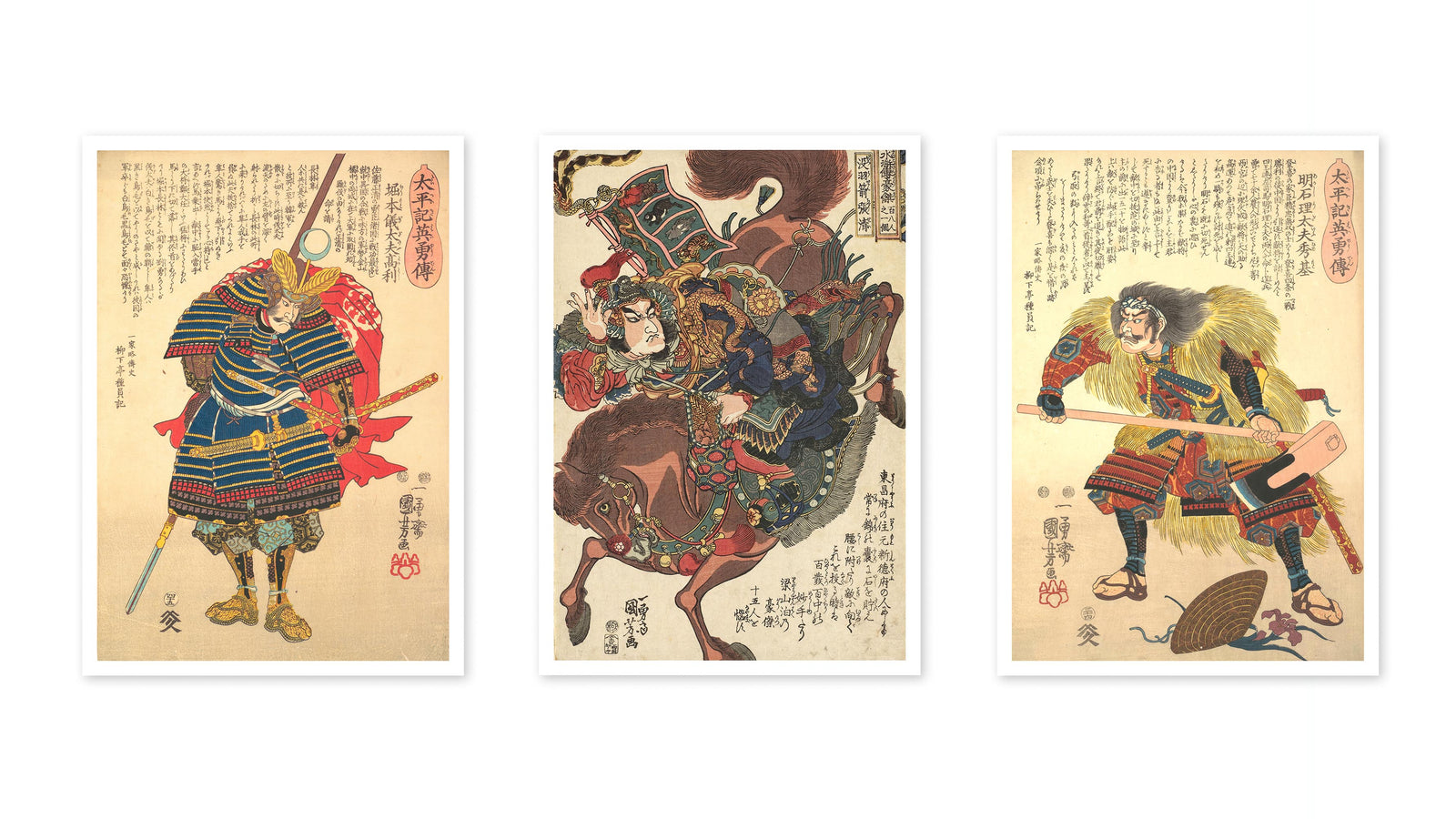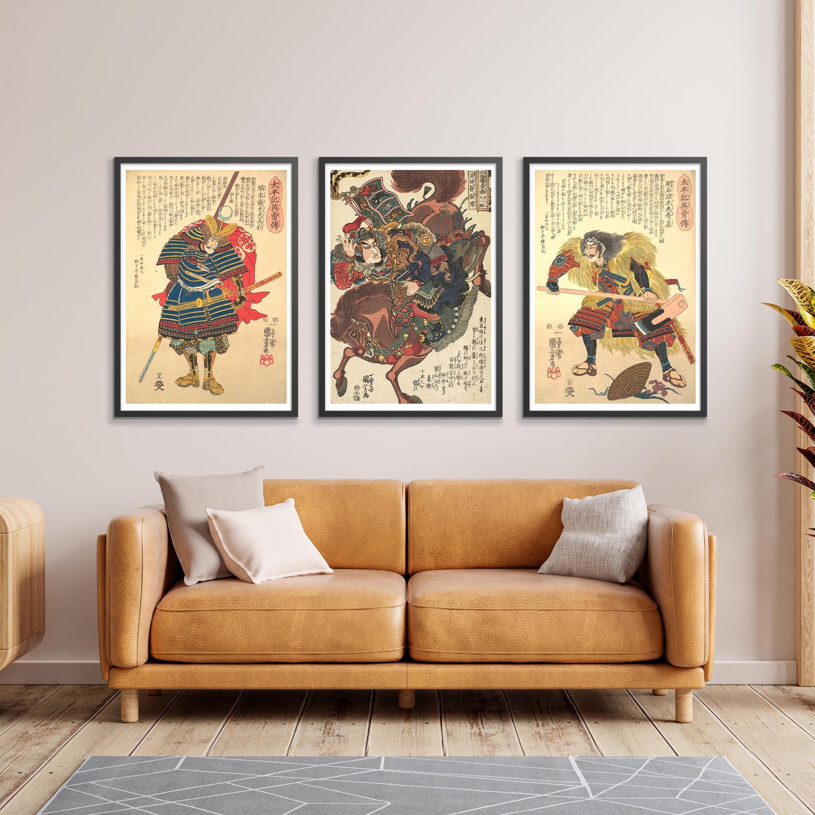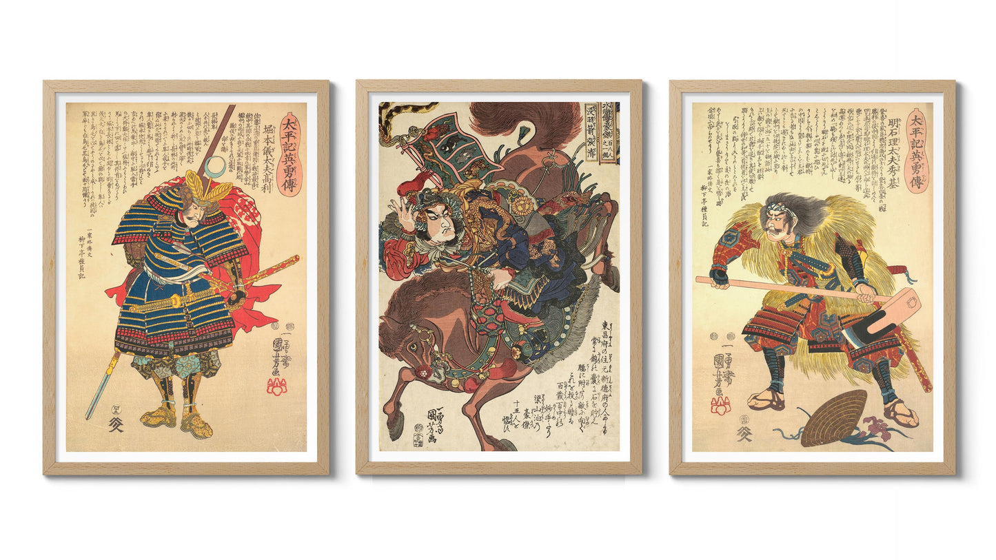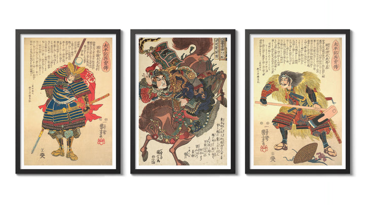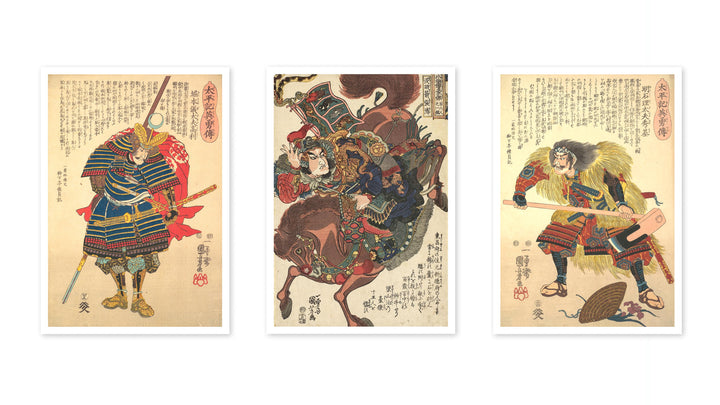 This "Traditional Samurai Heroes" poster set by Utagawa Kuniyoshi, dated 1848, showcases vibrant woodblock illustrations depicting iconic samurai warriors in dynamic poses. Crafted in the Ukiyo-E style, each piece features detailed armor, swords, and narrative text against a beige and brown palette, capturing the essence of these legendary Japanese figures with historical authenticity. Perfect for enthusiasts of traditional samurai lore.