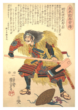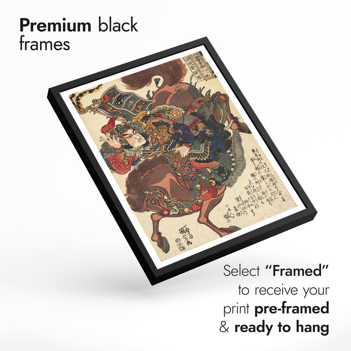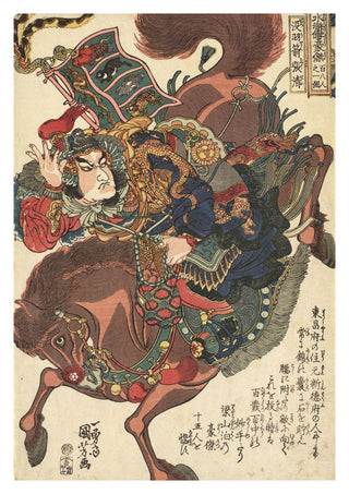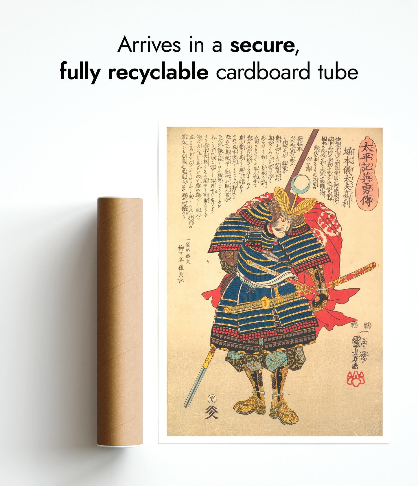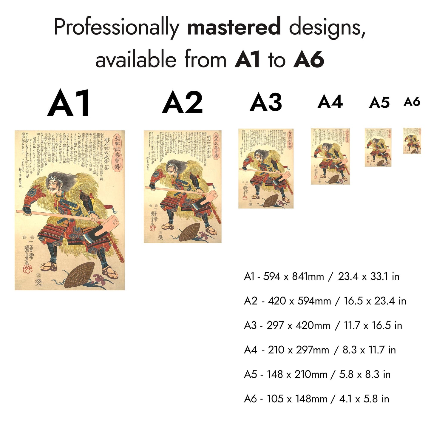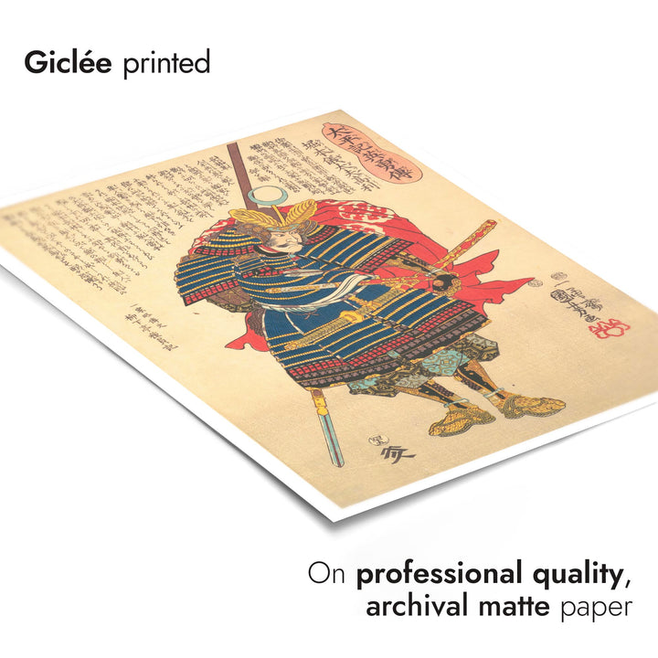 This "Traditional Samurai Heroes" poster set by Utagawa Kuniyoshi, dated 1848, showcases vibrant woodblock illustrations depicting iconic samurai warriors in dynamic poses. Crafted in the Ukiyo-E style, each piece features detailed armor, swords, and narrative text against a beige and brown palette, capturing the essence of these legendary Japanese figures with historical authenticity. Perfect for enthusiasts of traditional samurai lore.