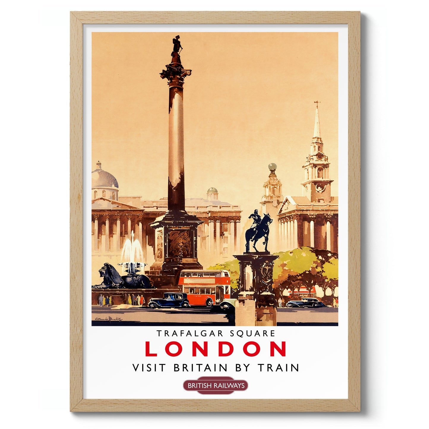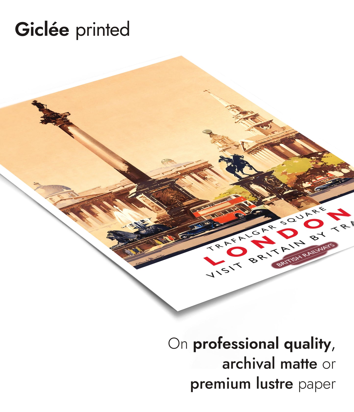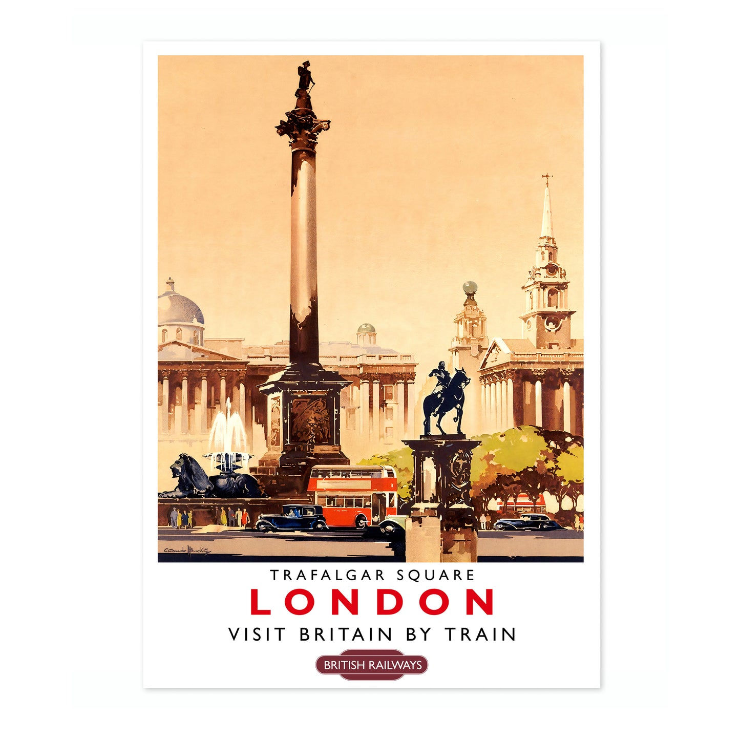 This vintage-style illustration poster of Trafalgar Square, London, transports viewers to the bustling heart of England's capital. Featuring iconic landmarks like Nelson's Column, classic red buses, and historic architecture, the artwork captures the essence of London. Perfect for fans of British Railways and timeless travel art, this poster is an evocative reminder of the UK's vibrant history.