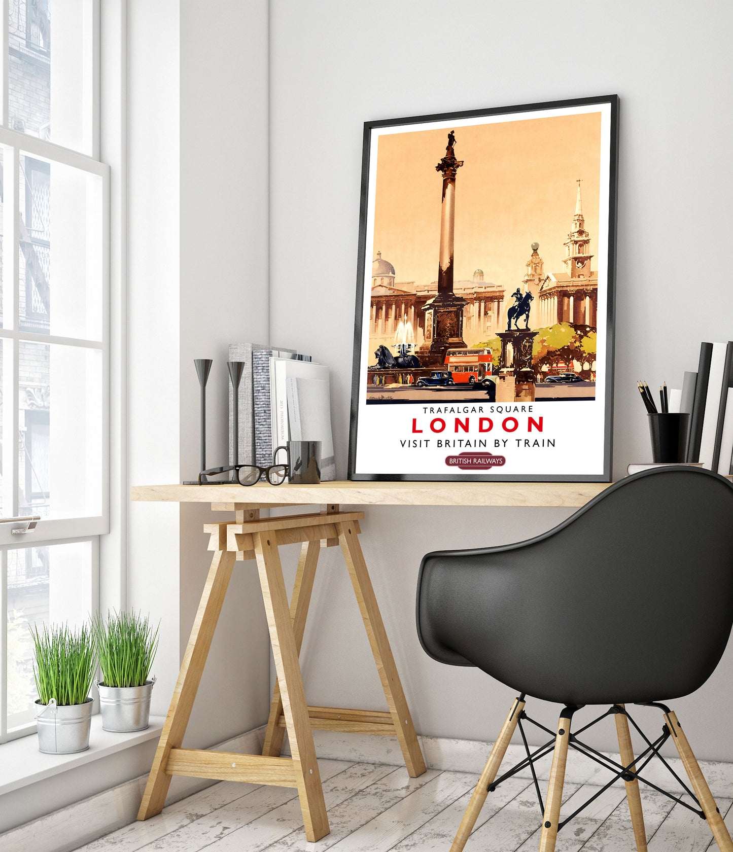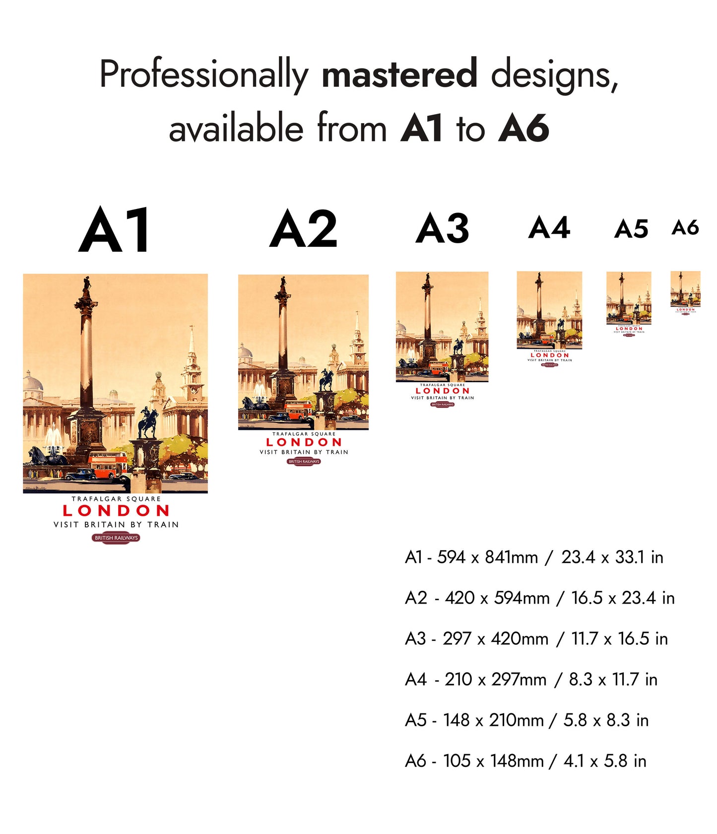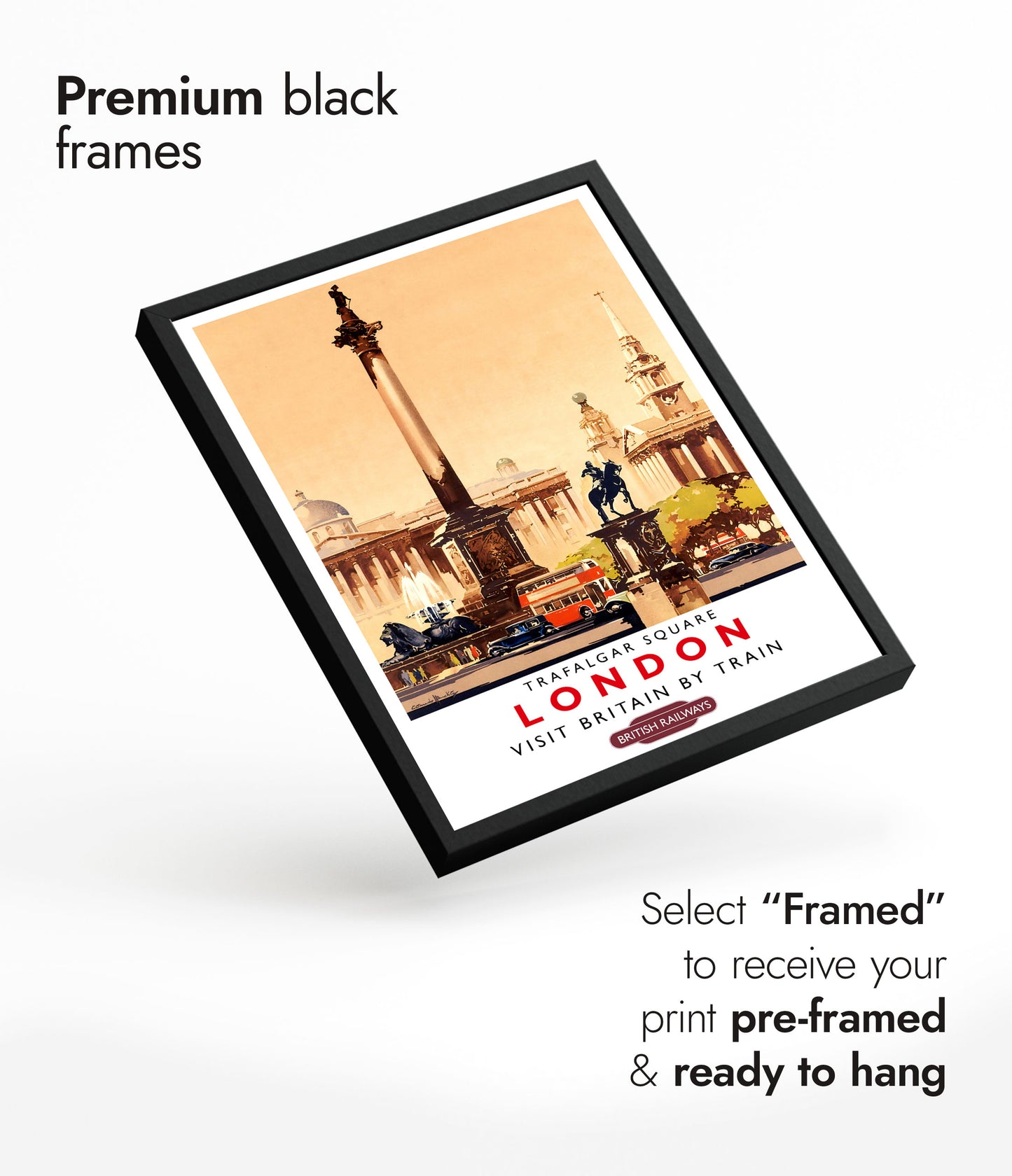 This vintage-style illustration poster of Trafalgar Square, London, transports viewers to the bustling heart of England's capital. Featuring iconic landmarks like Nelson's Column, classic red buses, and historic architecture, the artwork captures the essence of London. Perfect for fans of British Railways and timeless travel art, this poster is an evocative reminder of the UK's vibrant history.