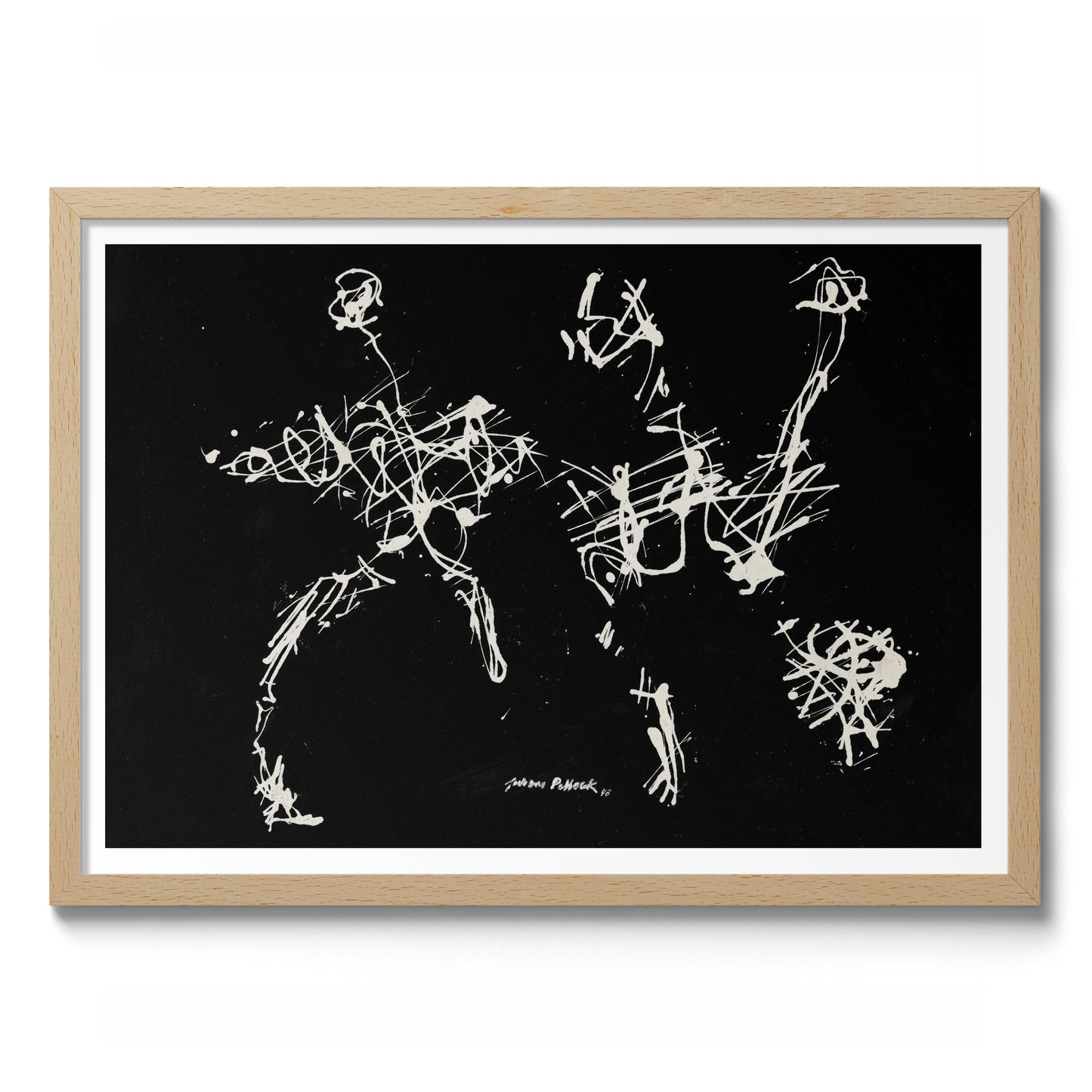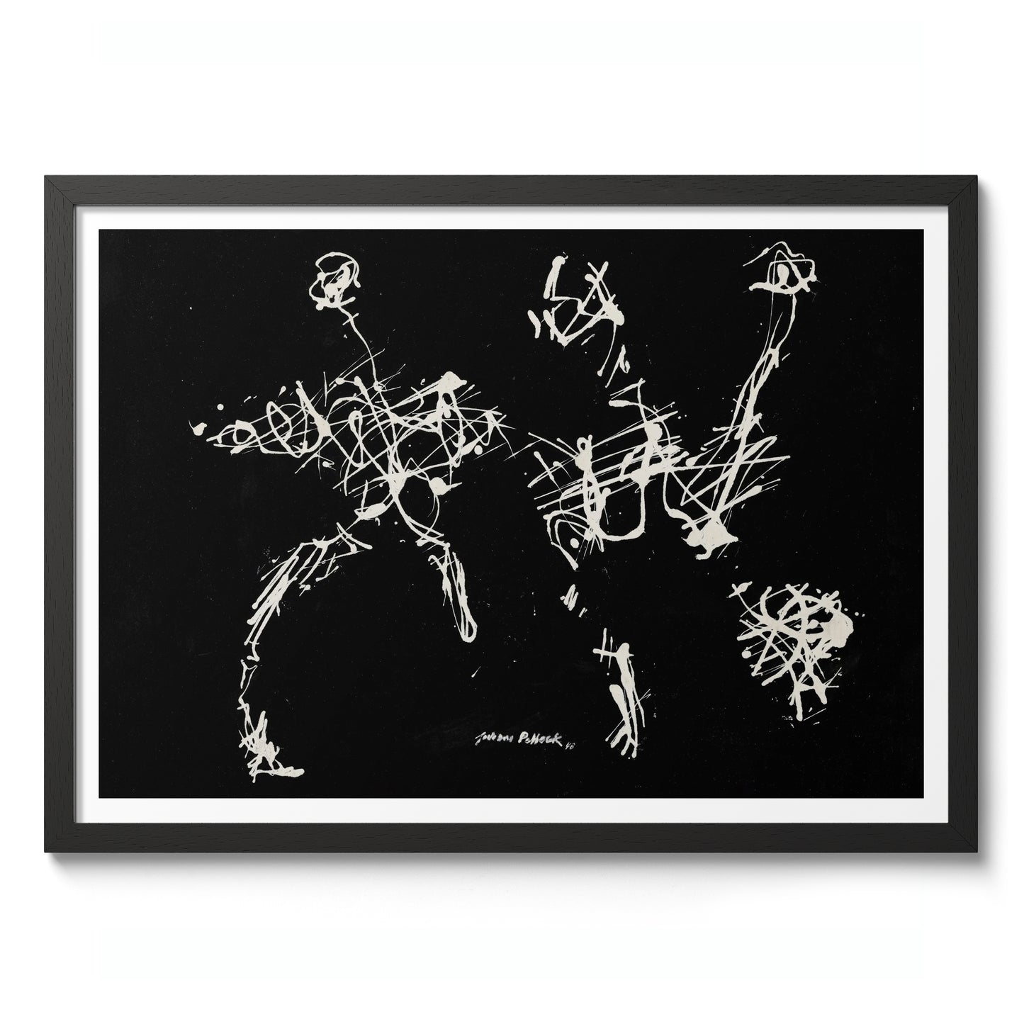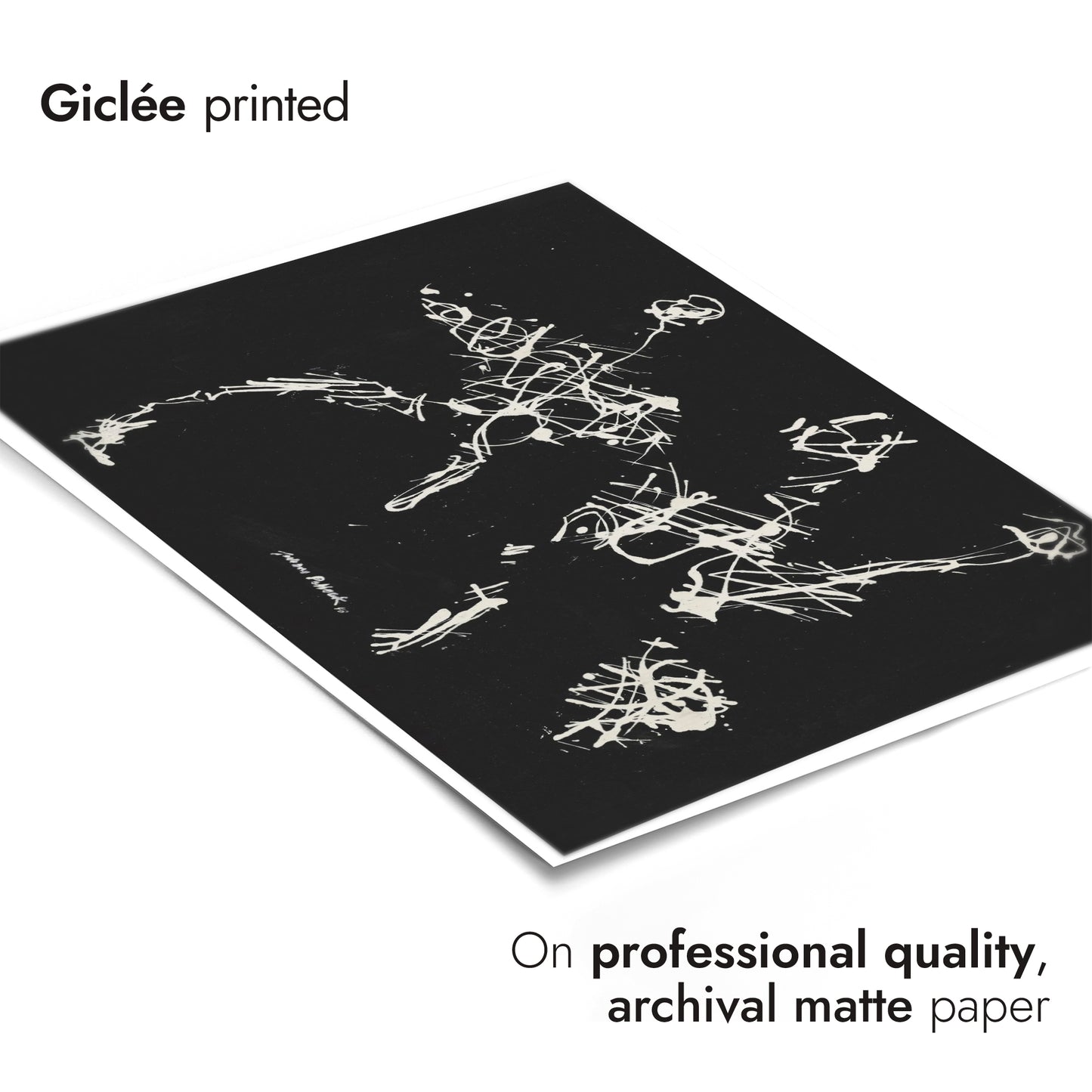 This abstract poster titled "Triad" by Jackson Pollock showcases expressive splatter and drip painting against a deep black background. Created in 1948, the piece epitomizes Pollock's distinctive expressionist style, featuring dynamic forms and vigorous strokes. The chaotic white lines create a striking contrast with the black canvas, capturing the essence of the abstract movement.