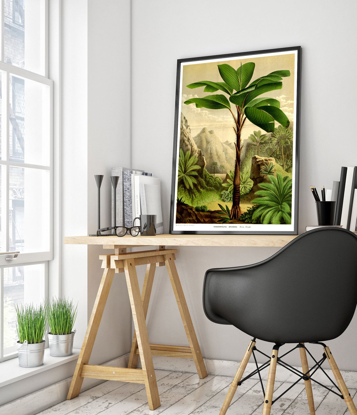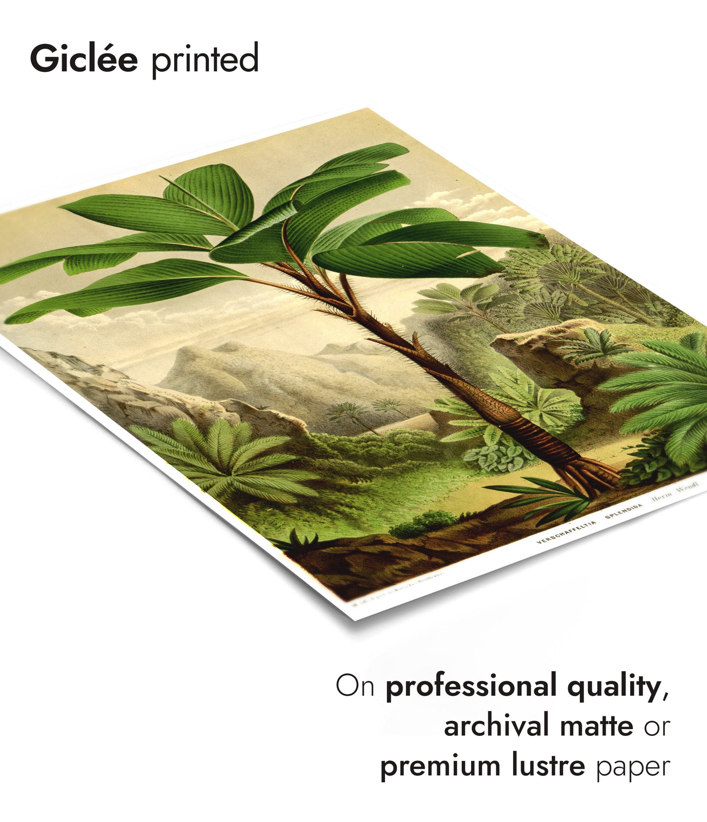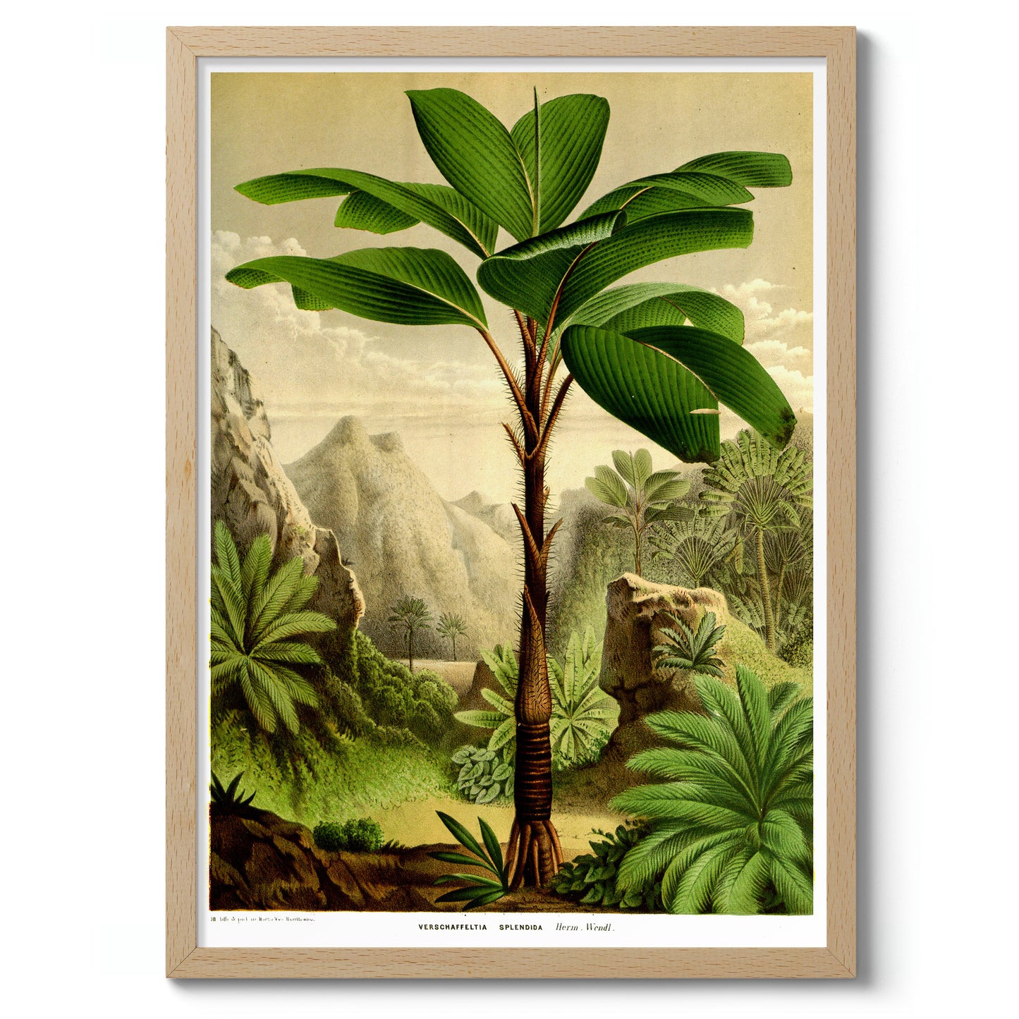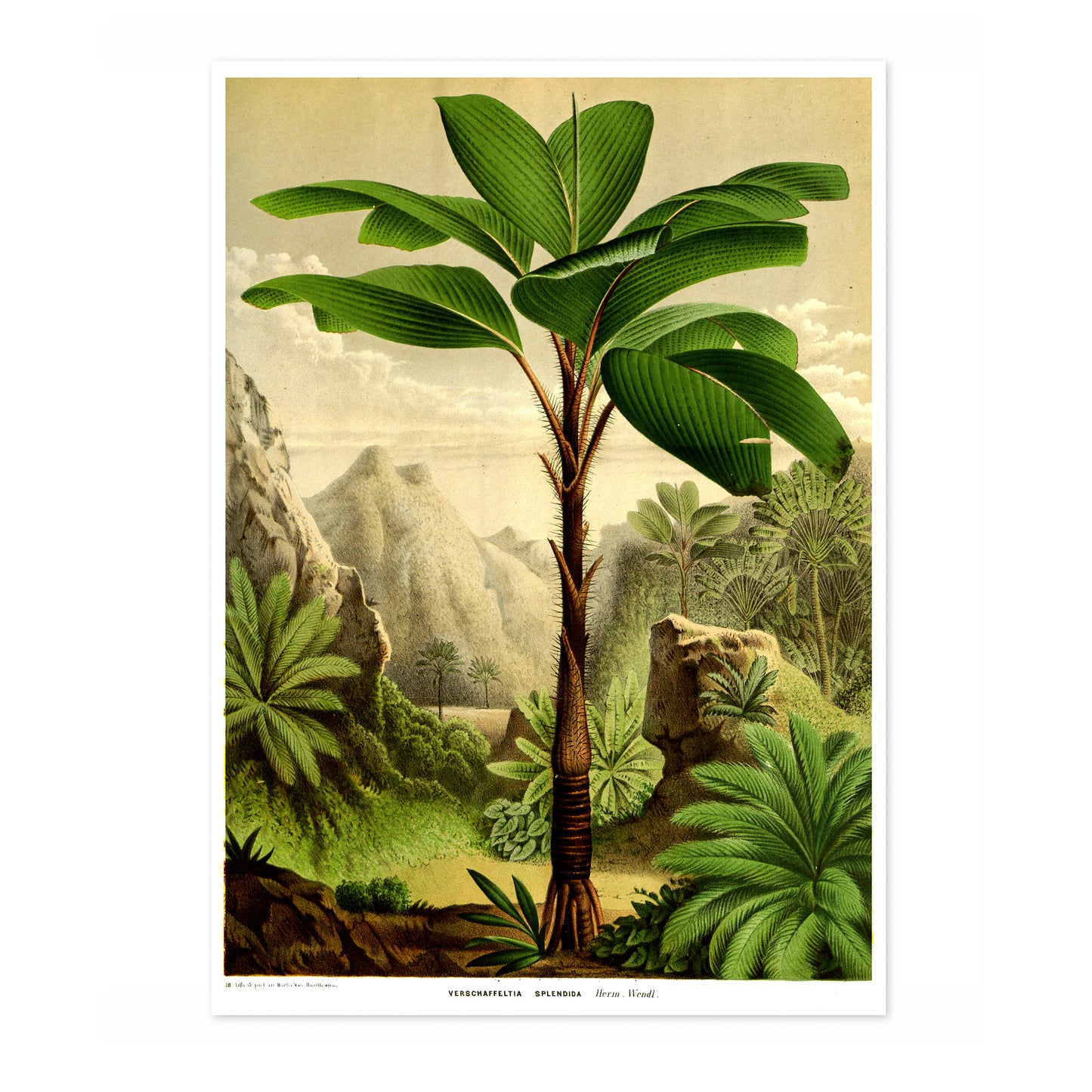 This "Tropical Tree" poster is a vintage botanical illustration depicting a lush jungle scene centered around a tall palm tree. The detailed artwork showcases vibrant green foliage set against a backdrop of rolling hills and exotic plants. Perfect for adding a touch of nature and sophistication to any space, this portrait-style poster brings the serenity of a tropical jungle indoors.