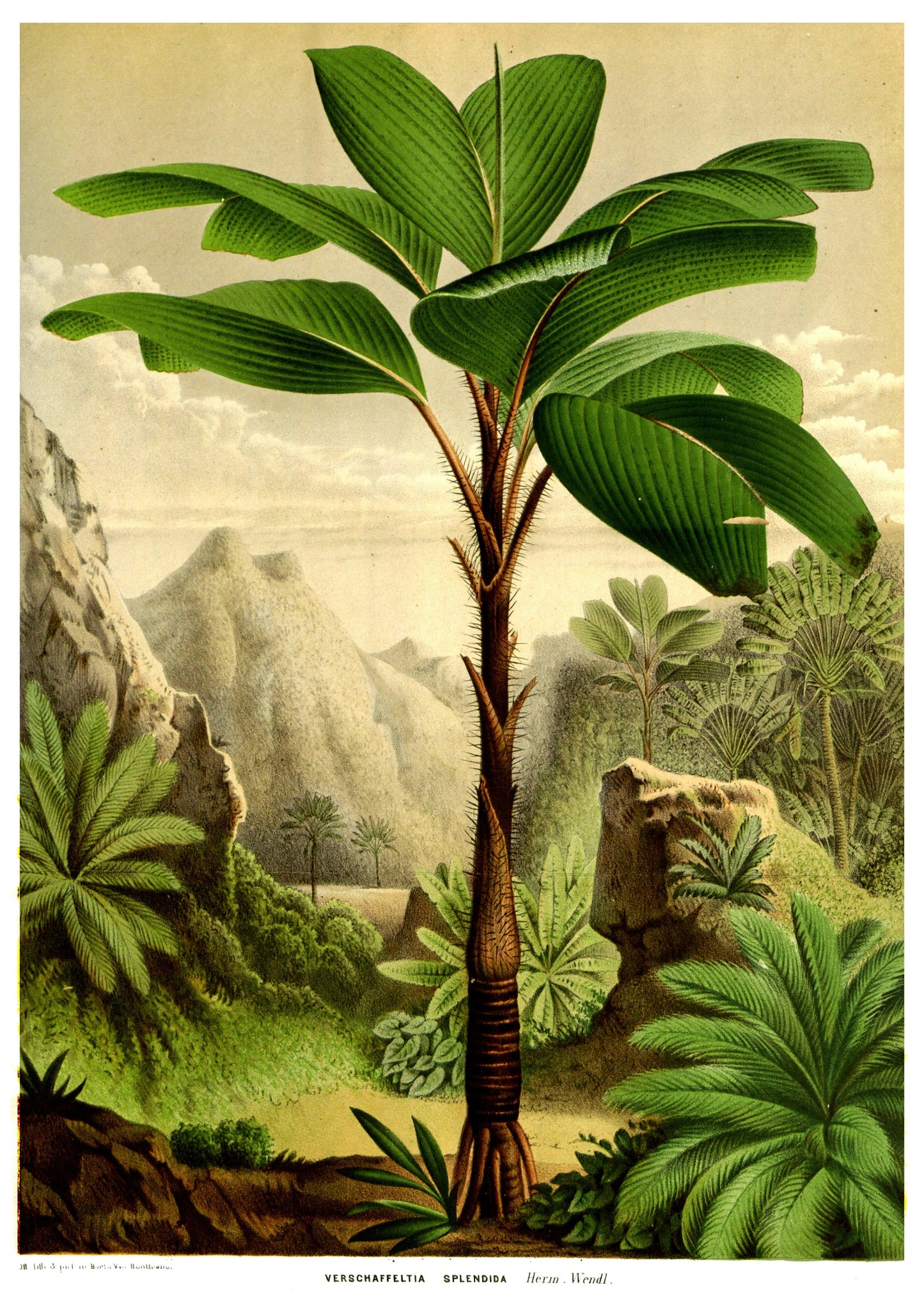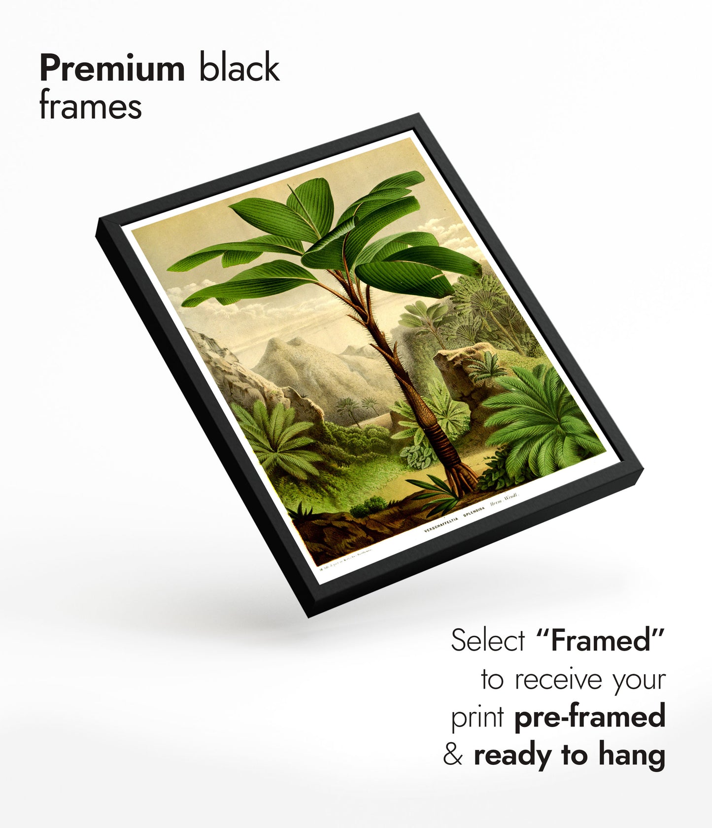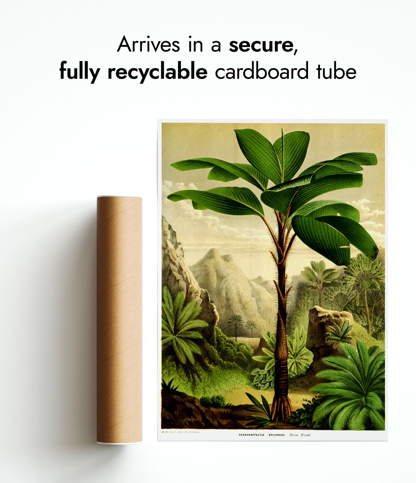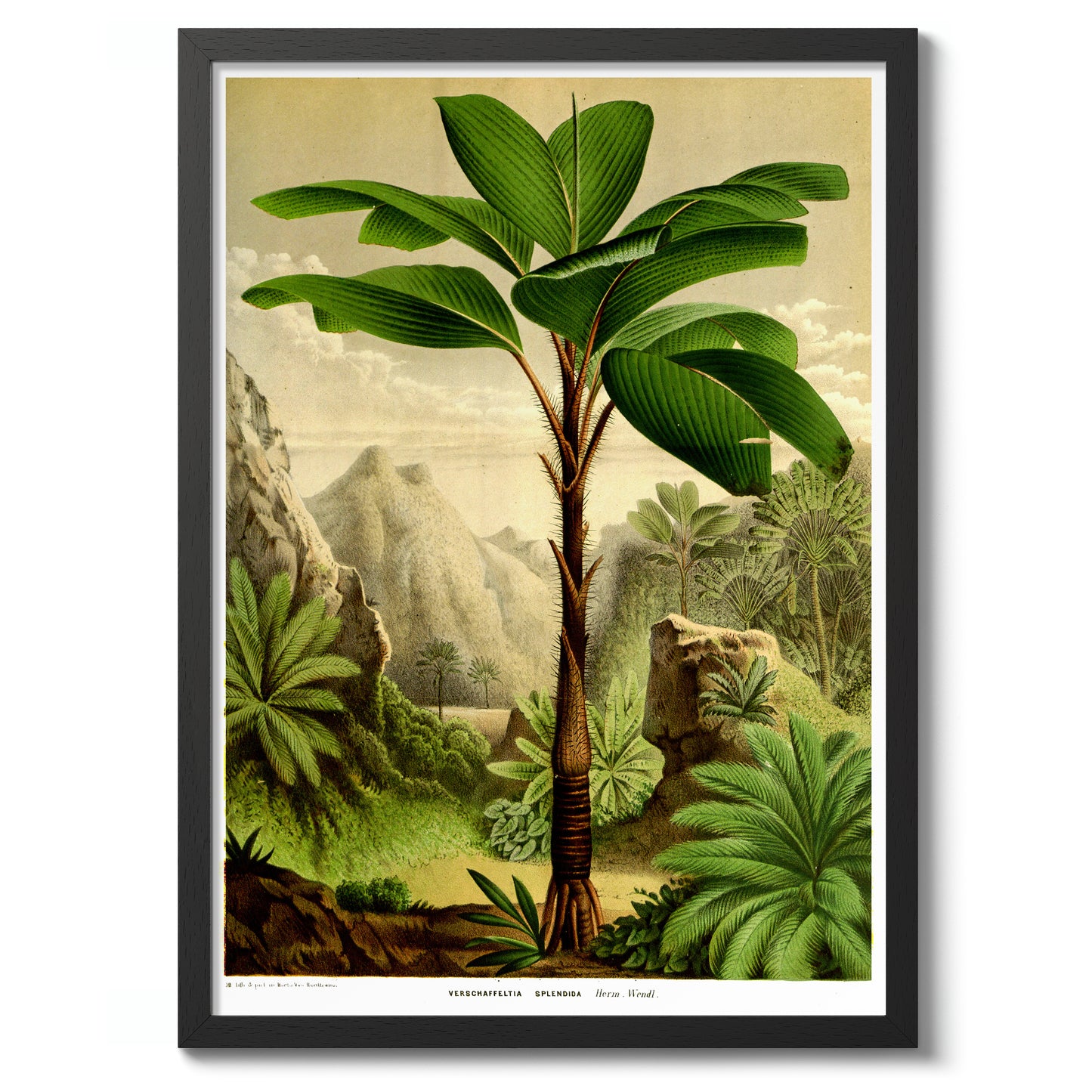 This "Tropical Tree" poster is a vintage botanical illustration depicting a lush jungle scene centered around a tall palm tree. The detailed artwork showcases vibrant green foliage set against a backdrop of rolling hills and exotic plants. Perfect for adding a touch of nature and sophistication to any space, this portrait-style poster brings the serenity of a tropical jungle indoors.