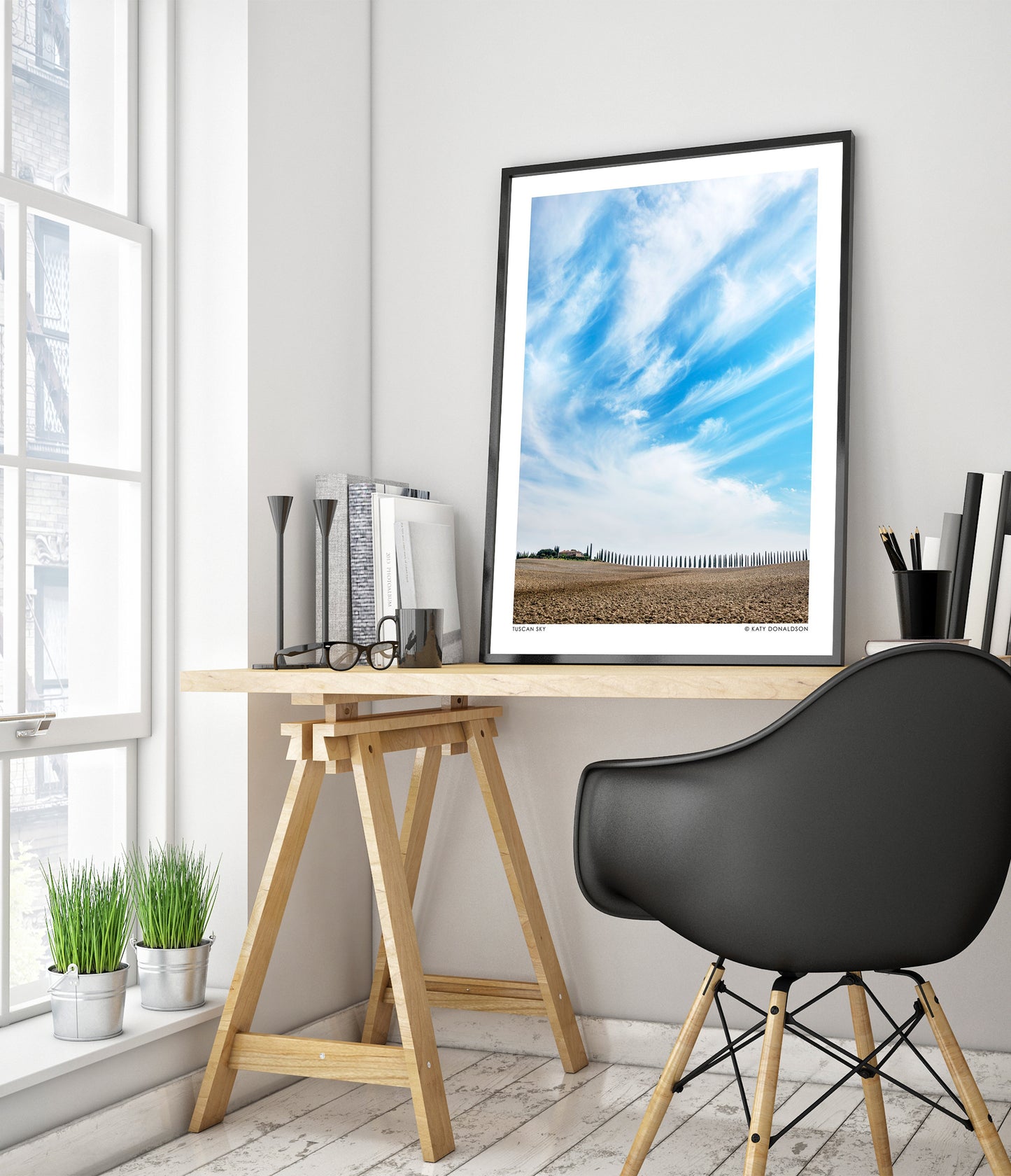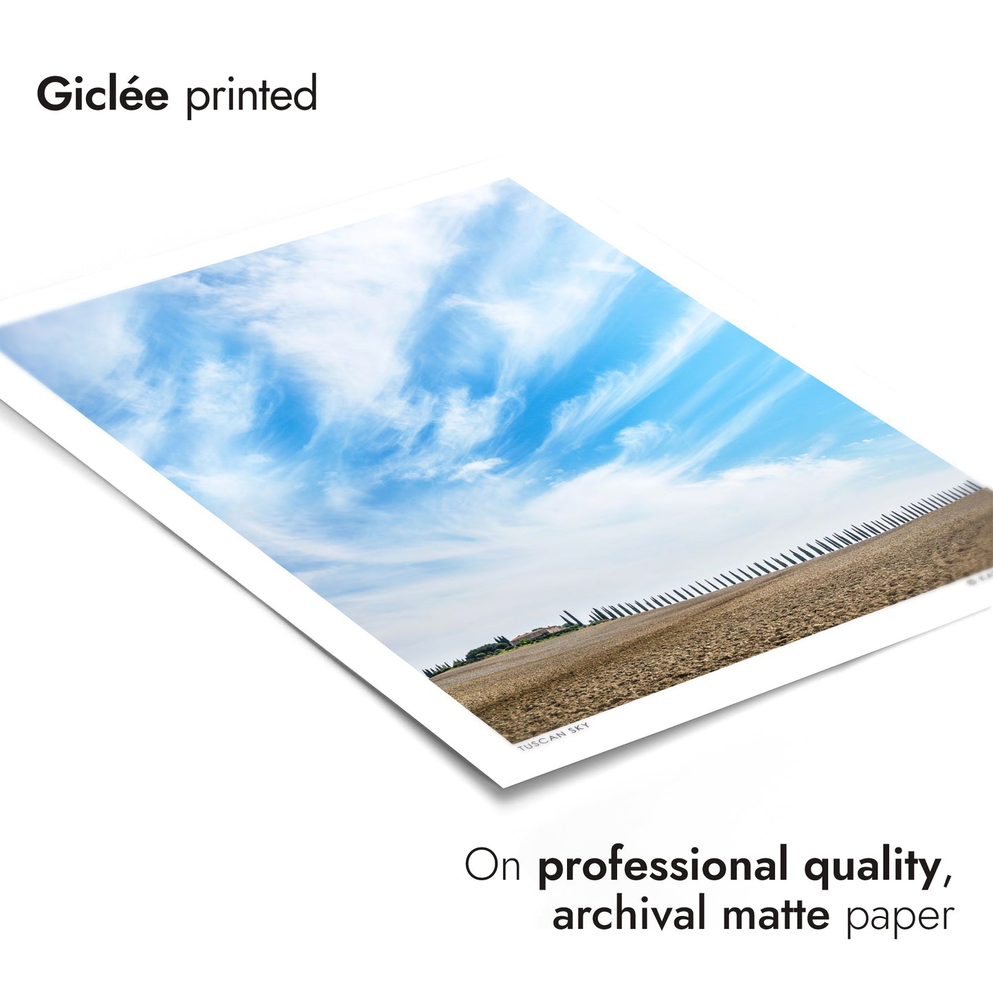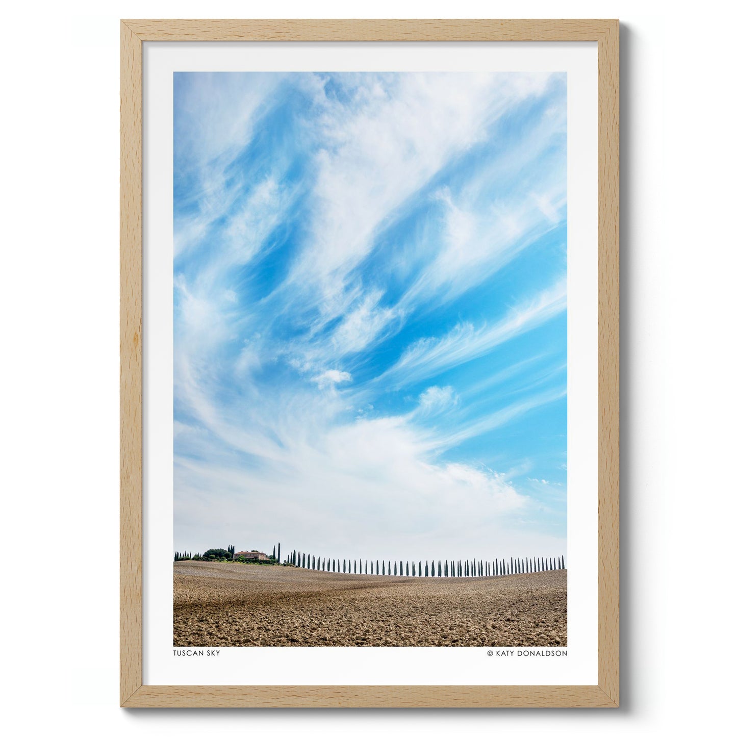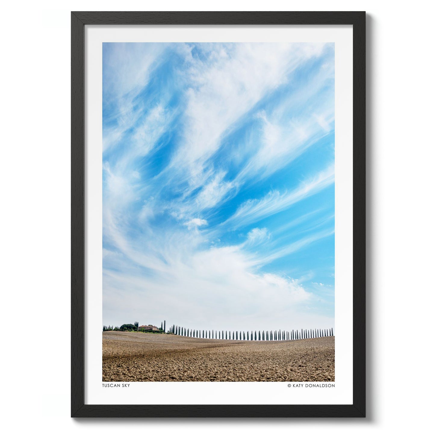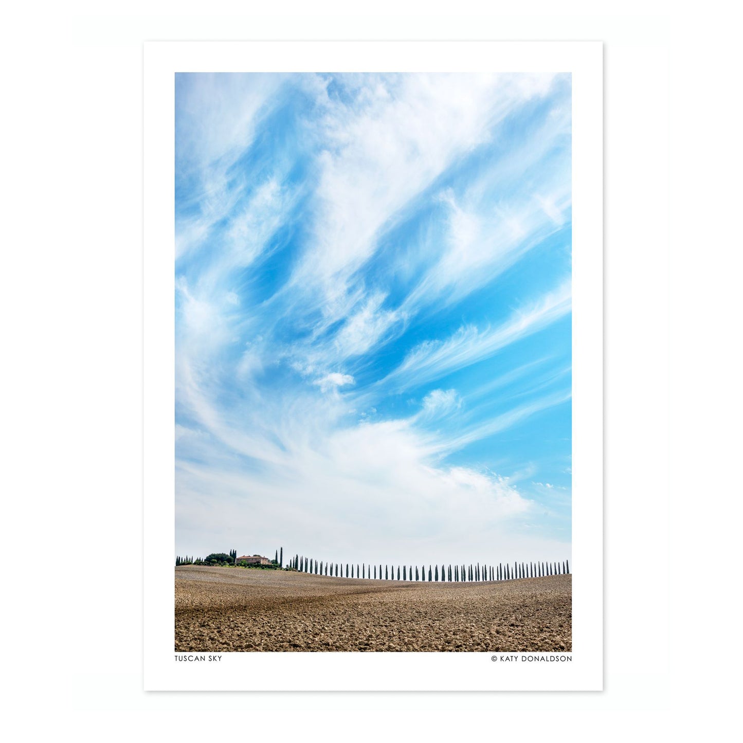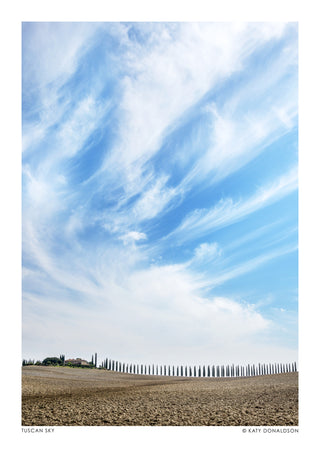 This "Tuscan Sky" poster by artist Katy Donaldson captures a breathtaking Italian landscape under a vast, dynamic sky. Dramatic clouds sweep across the blue expanses above a serene row of cypress trees and rolling hills. This minimalist photographic landscape embodies the tranquility and beauty of Tuscany, making it a perfect travel-inspired wall art choice. Ideal for enthusiasts of Italian scenery and sky photography.