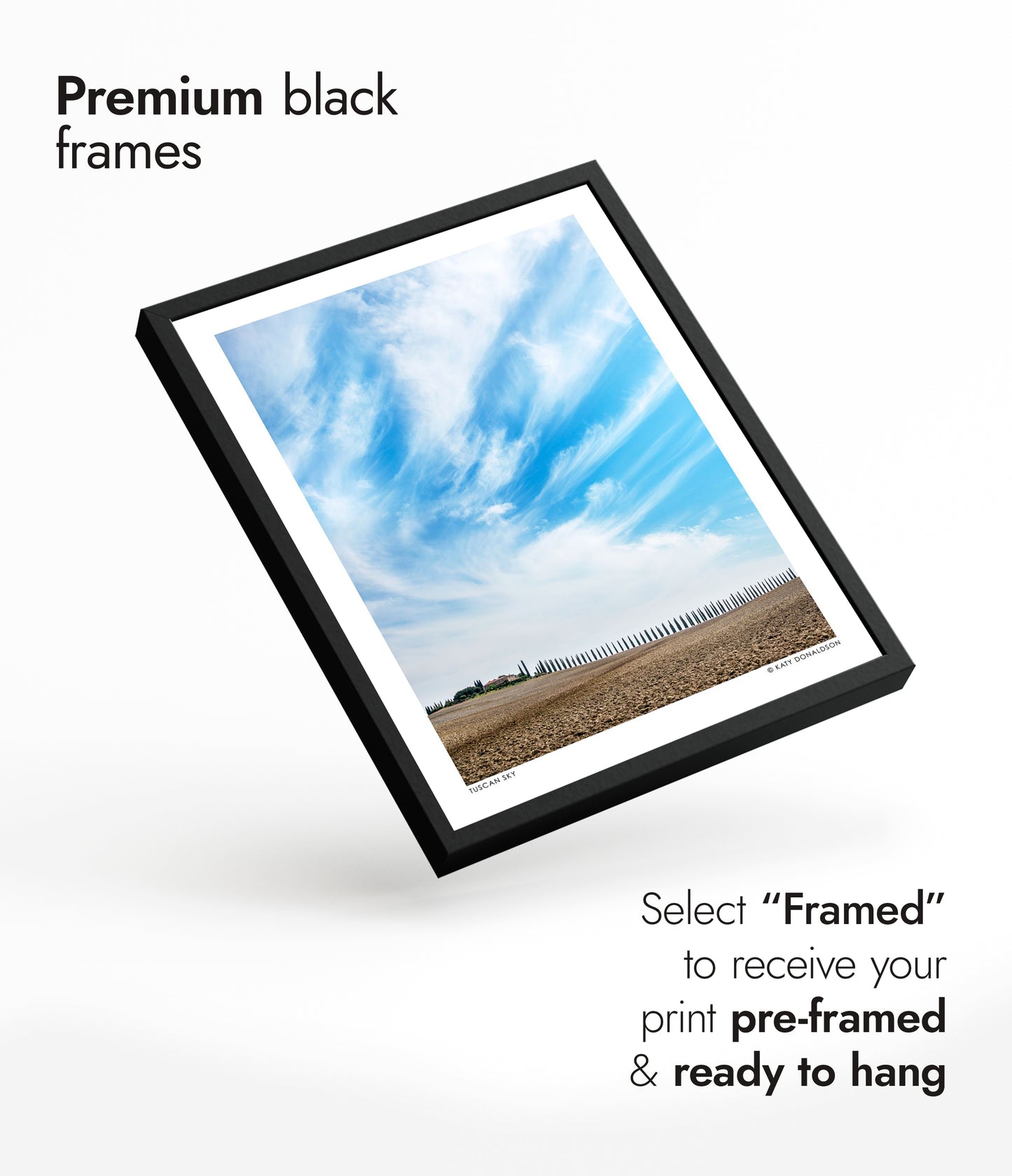 Solid wood frames available in black stained or natural finishes, with UV resistant acrylic glass. Framed orders arrive pre-installed with your choice of print, ready to hang. Available in all print sizes.