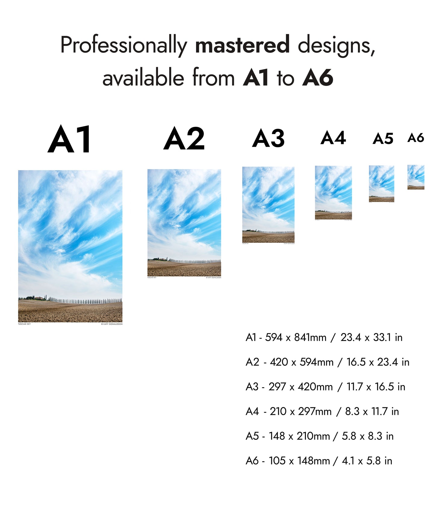 8 colour giclée print process on high-quality 230gsm archival matte paper. All our paper is FSC Certified and prints come with a lifetime fade-resistance guarantee.