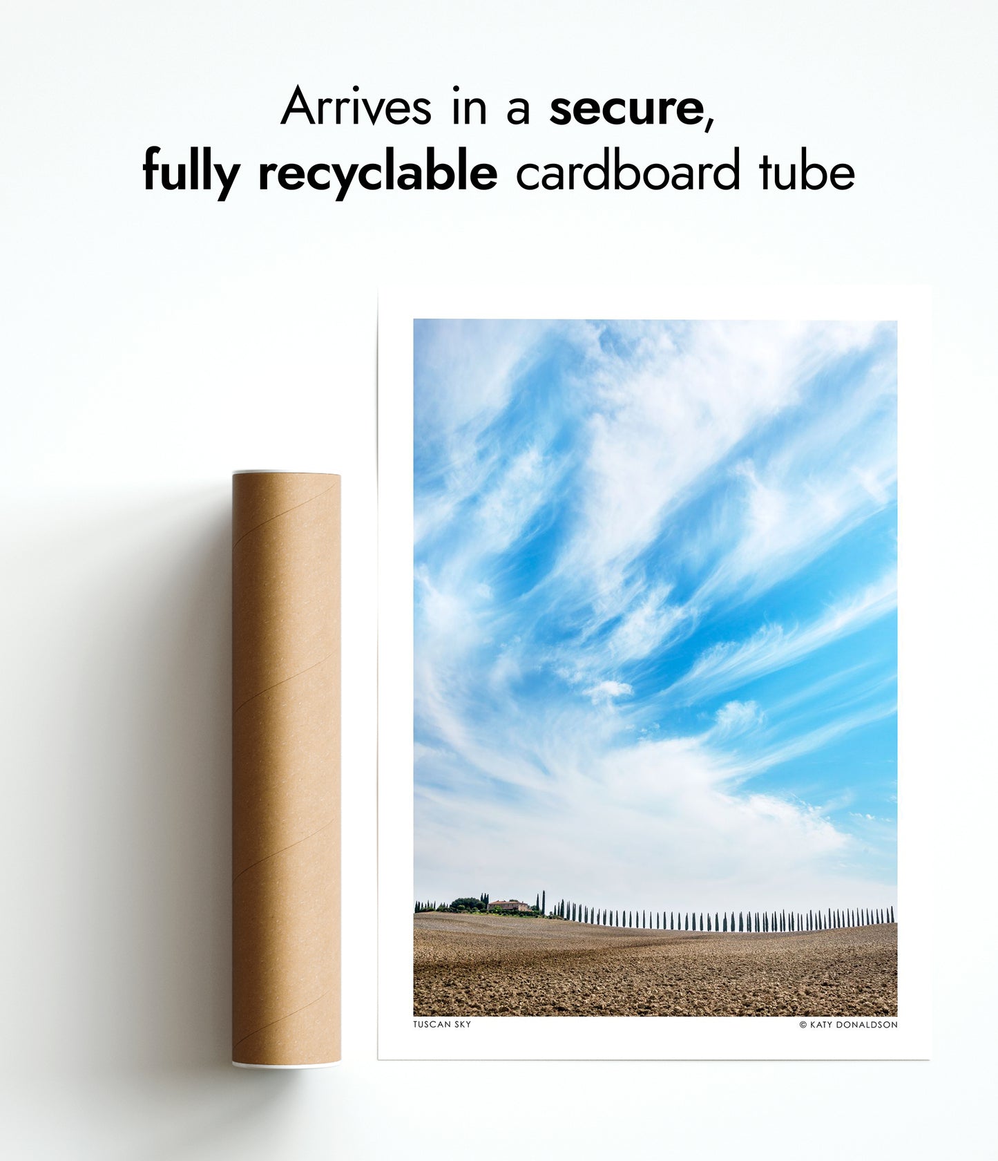 All orders are securely packed in recyclable, eco-friendly solutions. Frames are protected with sustainable bubble wrap alternatives inside thick boxes. Print only orders are shipped in heavy-duty cardboard tubes or protective hard-backed envelopes.