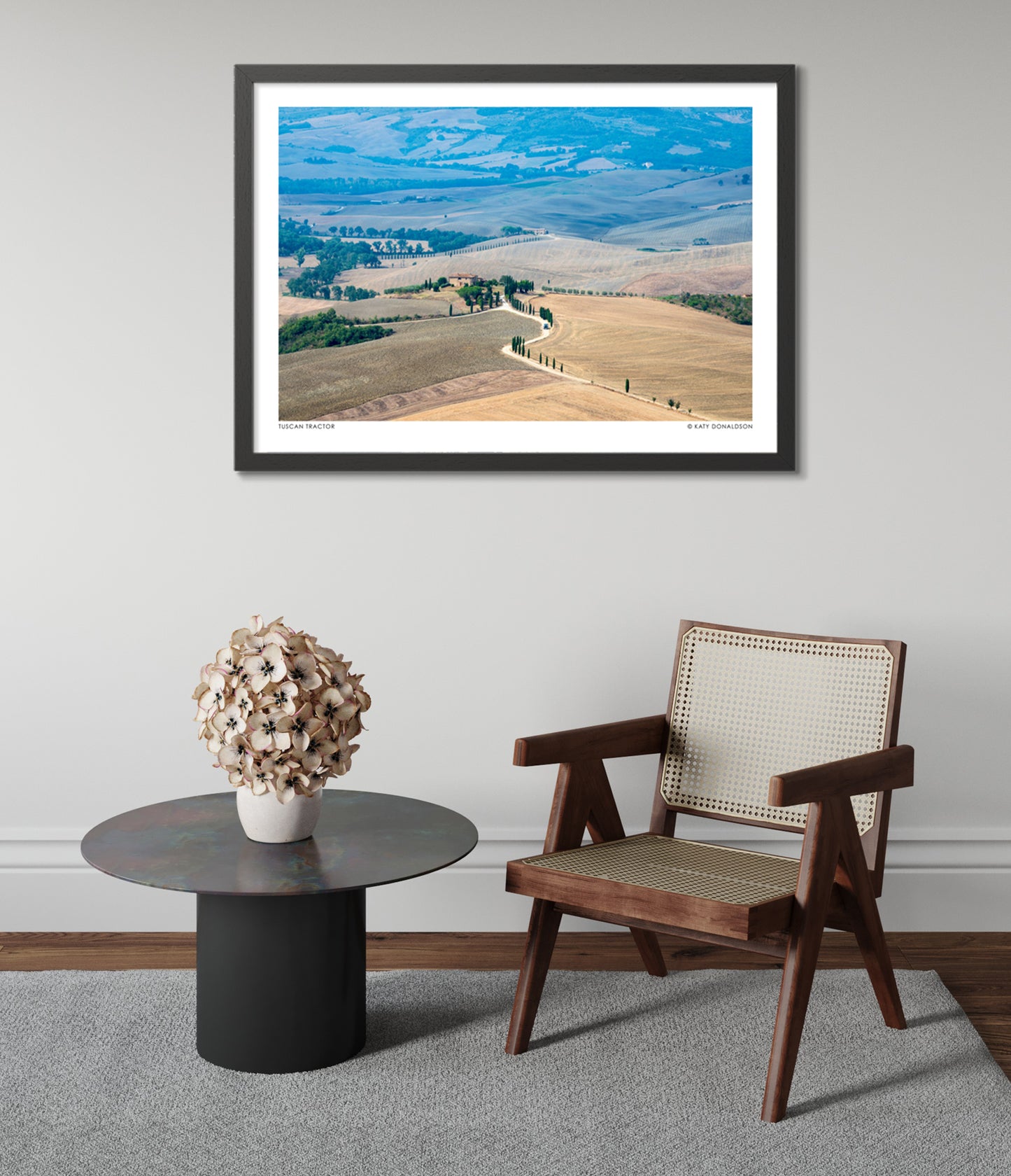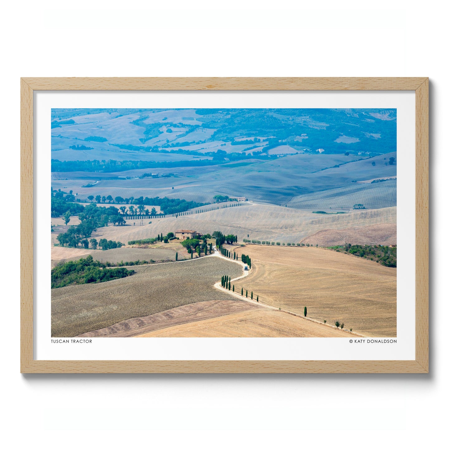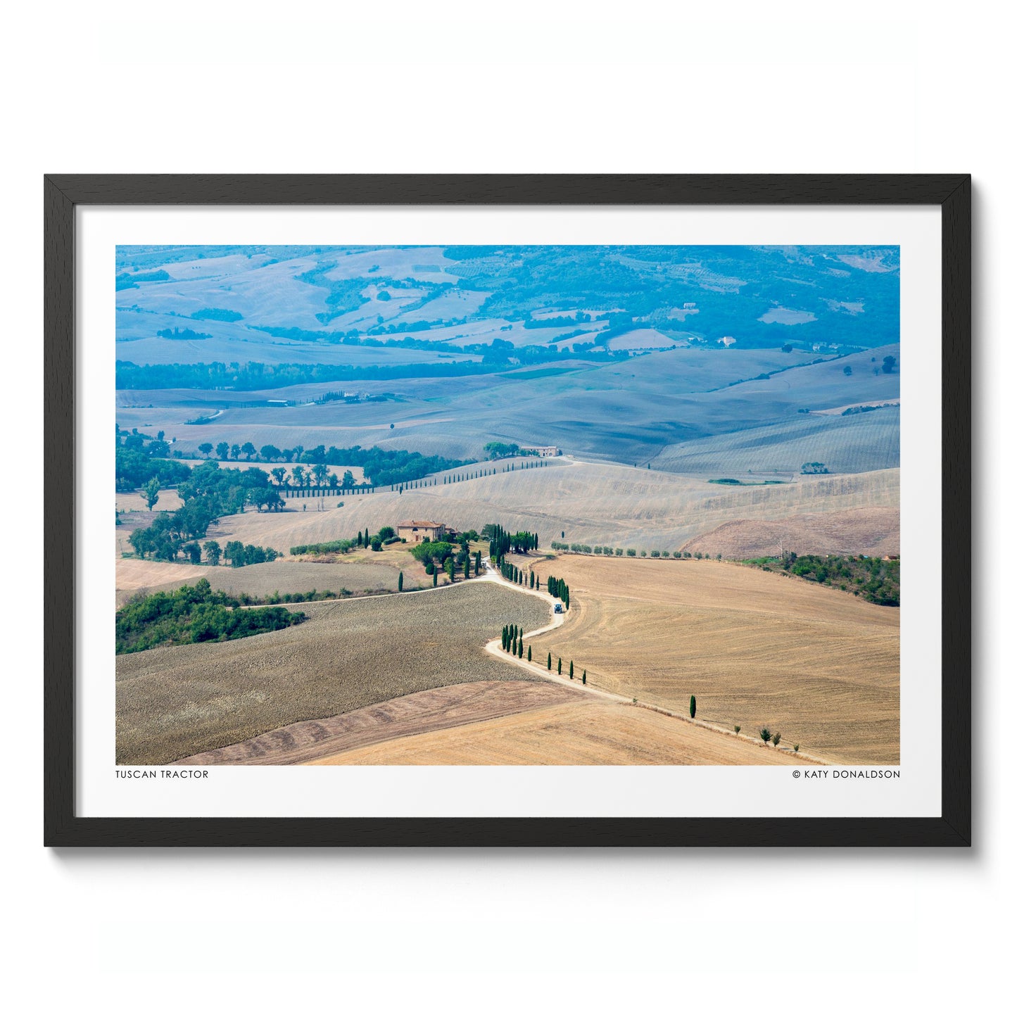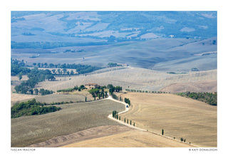 This photographic landscape poster, titled "Tuscan Tractor Landscape" by Katy Donaldson, captures the serene charm of the Tuscan countryside. The image features rolling hills and a winding road lined with cypress trees, leading to a rustic farmhouse. It beautifully portrays the quintessential Italian rural scene, perfect for those who appreciate travel and countryside themes.