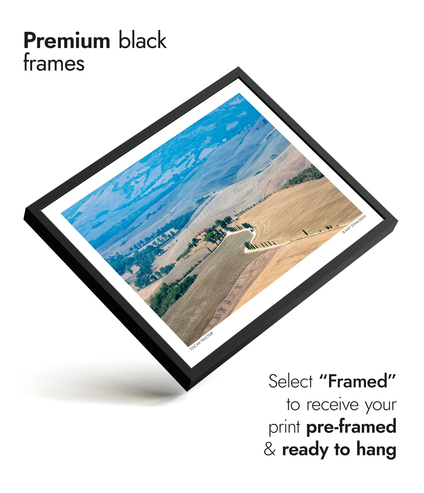 Solid wood frames available in black stained or natural finishes, with UV resistant acrylic glass. Framed orders arrive pre-installed with your choice of print, ready to hang. Available in all print sizes.