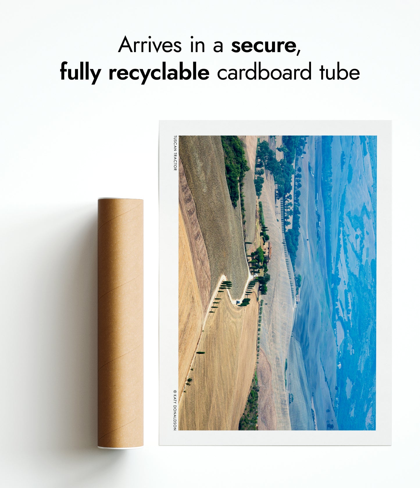 All orders are securely packed in recyclable, eco-friendly solutions. Frames are protected with sustainable bubble wrap alternatives inside thick boxes. Print only orders are shipped in heavy-duty cardboard tubes or protective hard-backed envelopes.