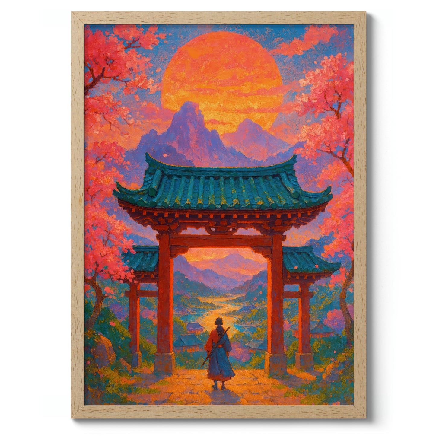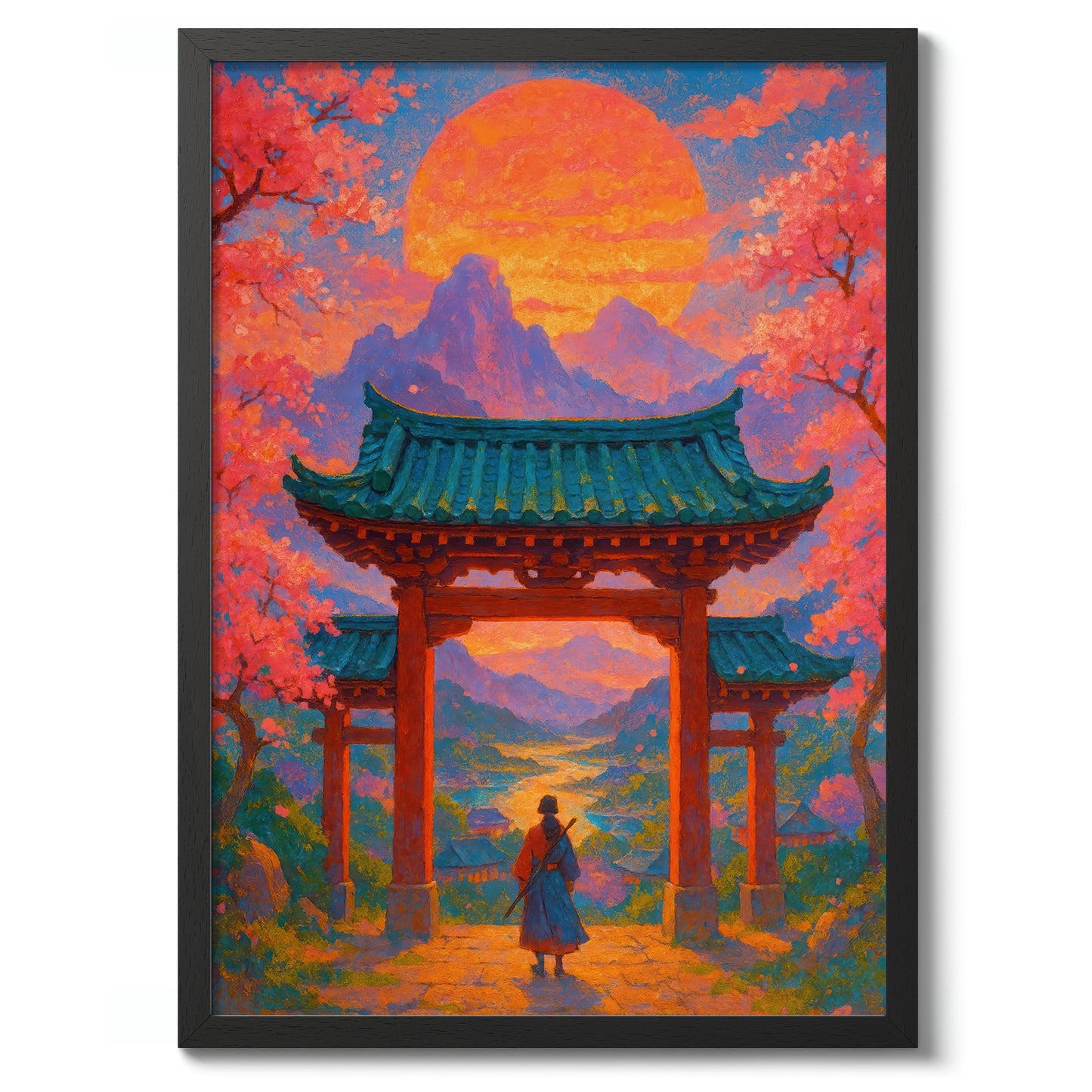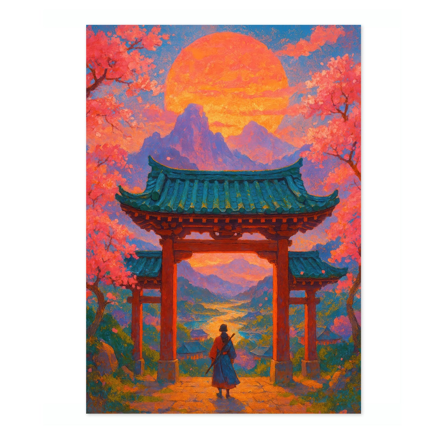 "Twilight Passage" poster depicts a serene Japanese landscape with a lone figure standing beneath a traditional gate. Set against a vivid sunset, cherry blossoms frame the scene, their pink hues contrasting with the fiery sun. The distant mountains enhance the sense of tranquility, while the anime-inspired style captures the essence of Japanese artistry. Ideal for anime and Japanese culture enthusiasts.