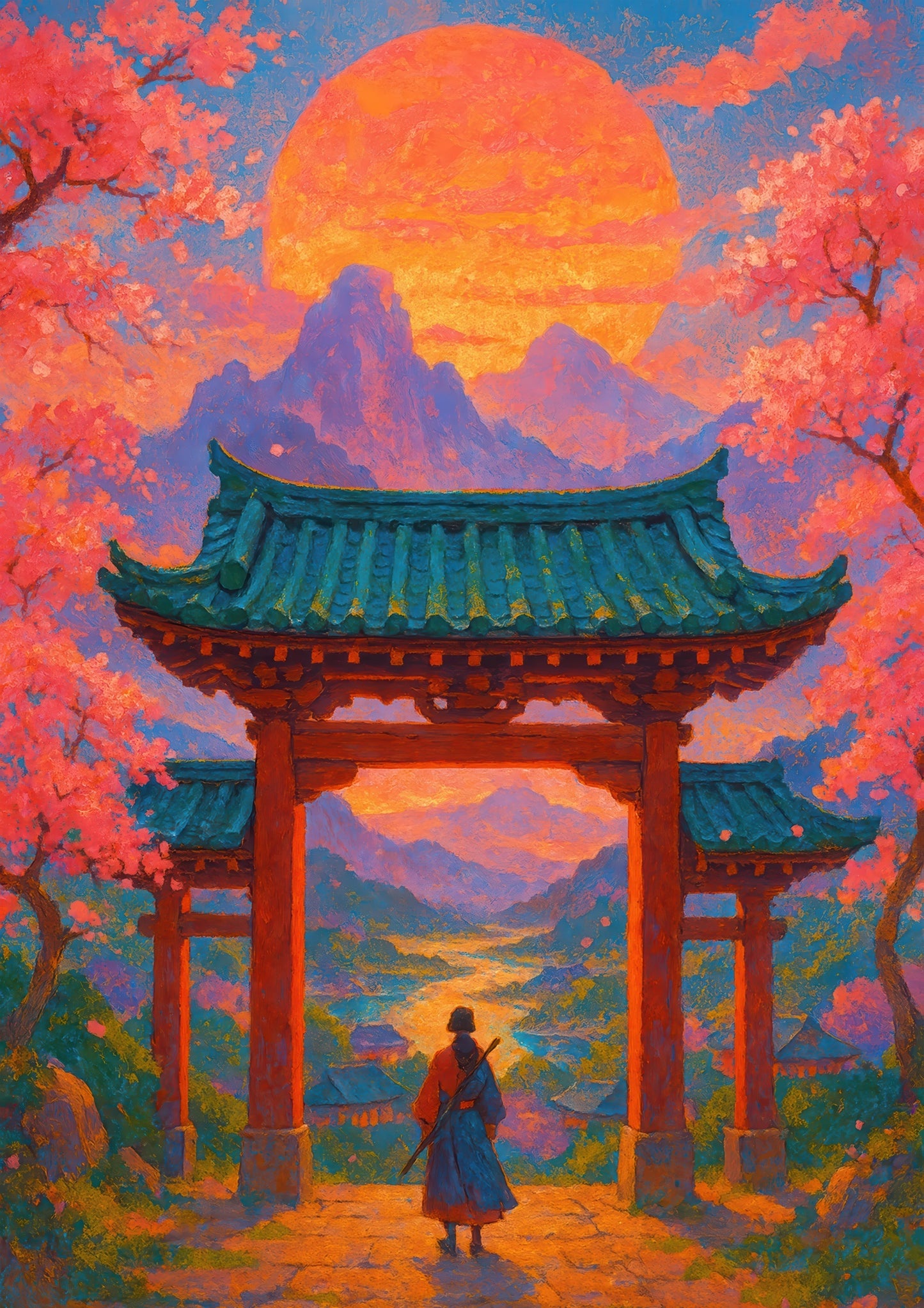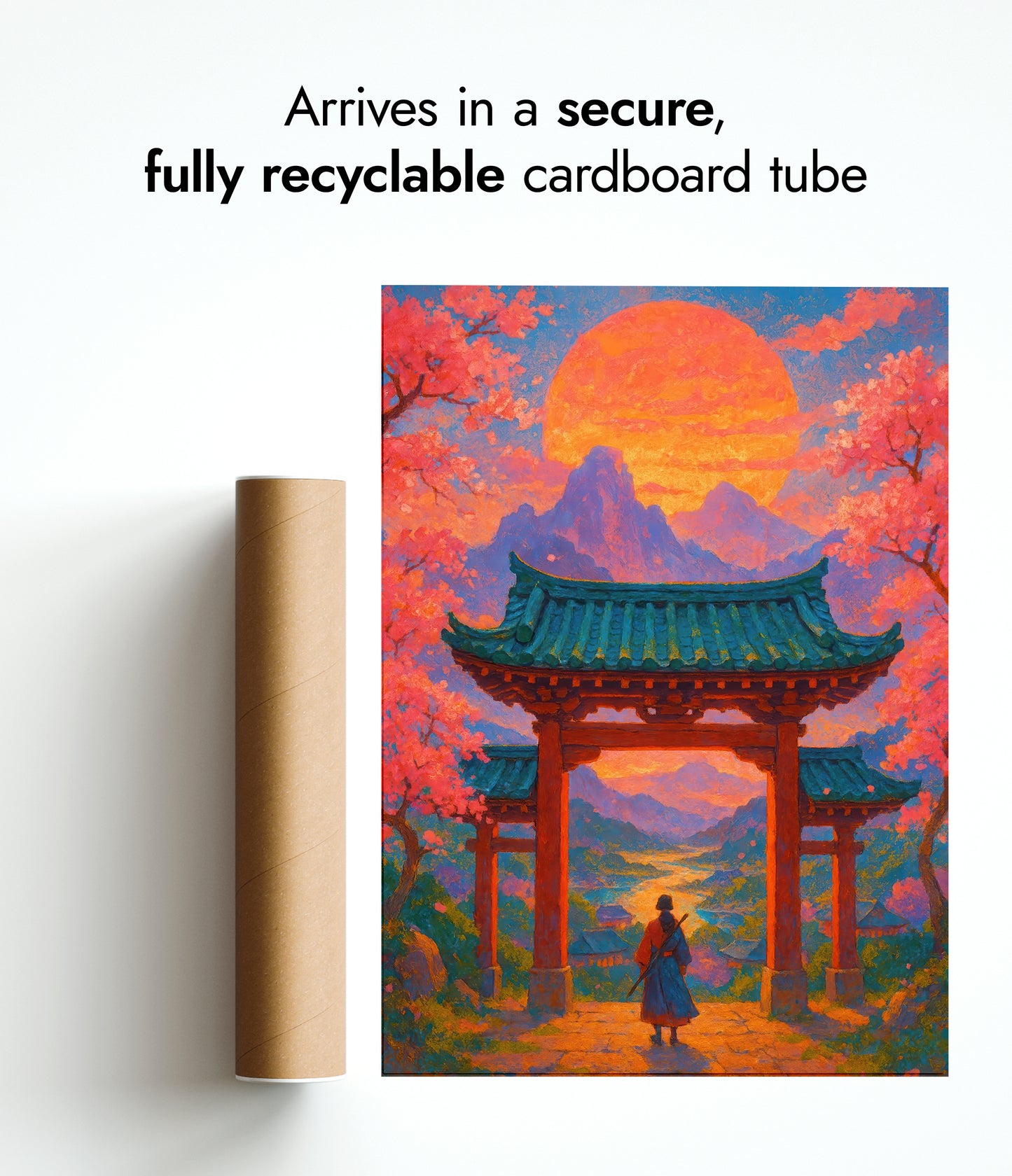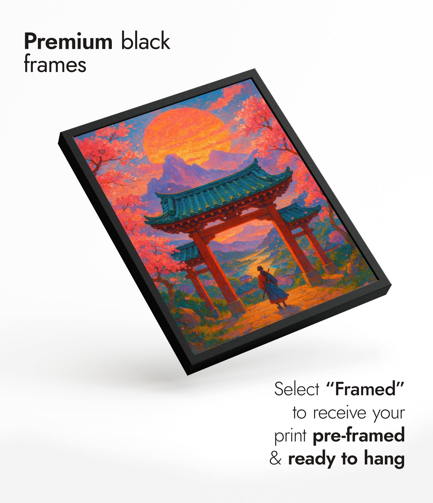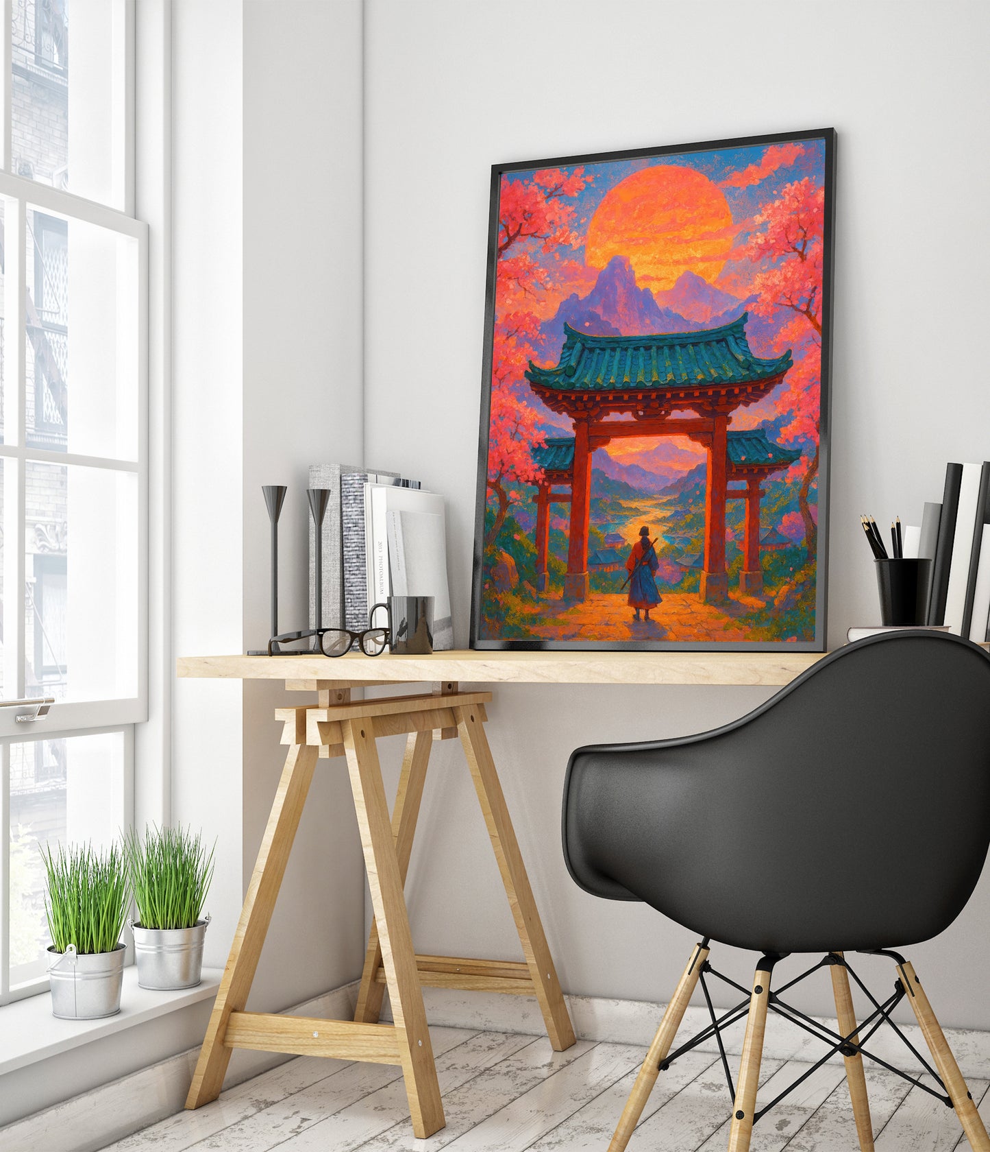 "Twilight Passage" poster depicts a serene Japanese landscape with a lone figure standing beneath a traditional gate. Set against a vivid sunset, cherry blossoms frame the scene, their pink hues contrasting with the fiery sun. The distant mountains enhance the sense of tranquility, while the anime-inspired style captures the essence of Japanese artistry. Ideal for anime and Japanese culture enthusiasts.