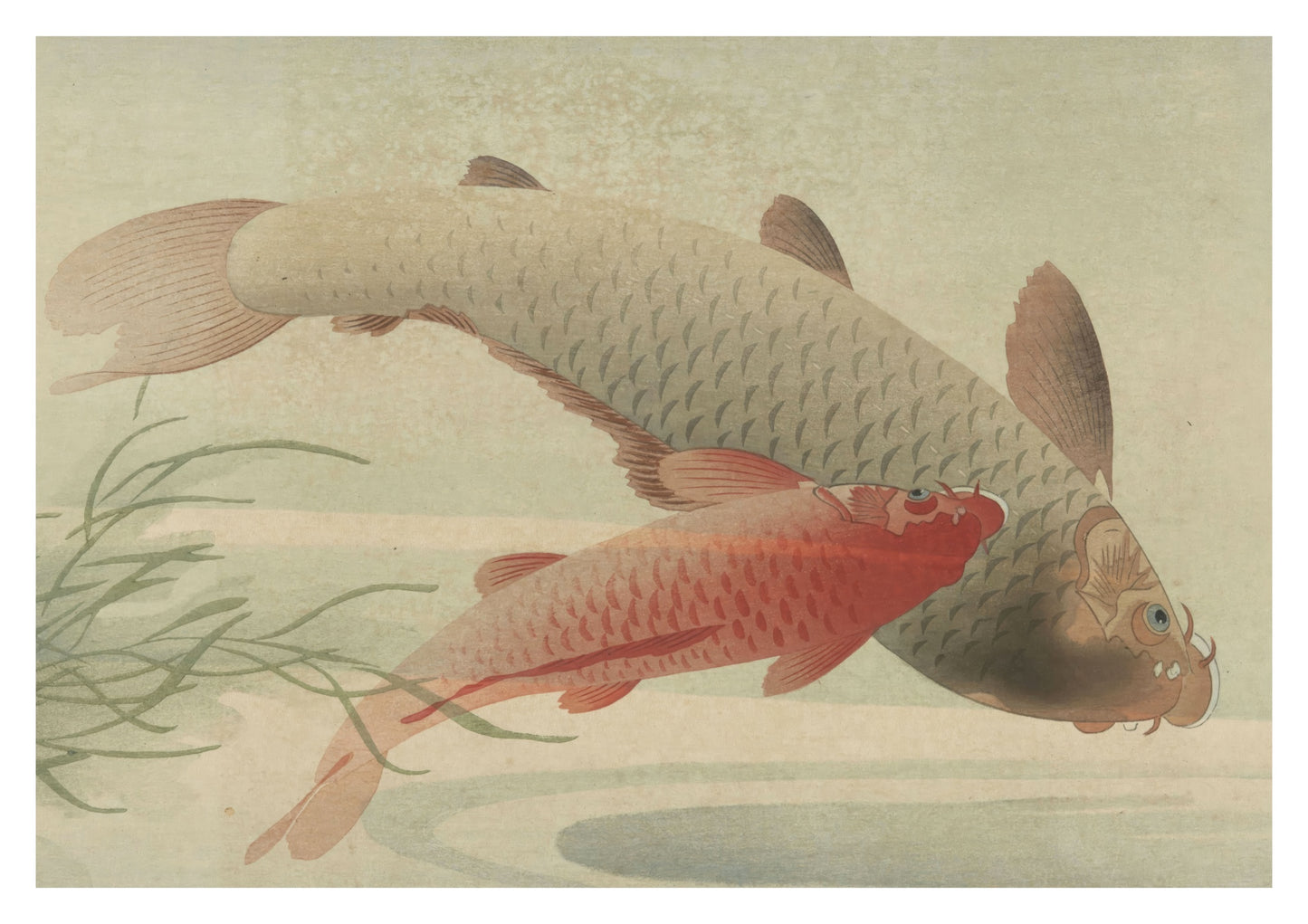 The "Two Carp & Water Weed" poster by Ohara Koson showcases a traditional Japanese woodblock design. Depicting two elegantly detailed carp swimming alongside water weeds in a tranquil lake, this landscape artwork captures the beauty and serenity of aquatic life. The subtle colour palette and precise lines emphasize the natural grace of the fish, embodying classic Japanese style. Perfect for adding a touch of tranquility to any space.
