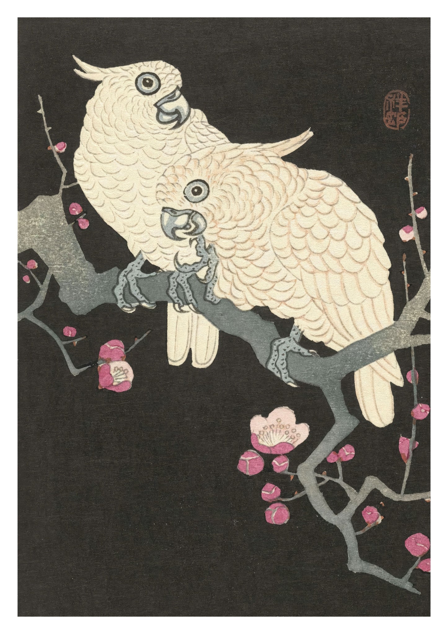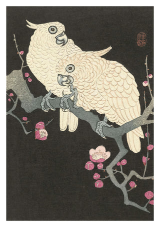 This "Two Cockatoos on Branch with Plum Blossom" poster, illustrated by Ohara Koson, captures two intricately detailed cockatoos perched on a branch adorned with delicate plum blossoms. Rendered in traditional Japanese woodblock style, this art print exudes elegance and carries rich cultural significance. Perfect for those who appreciate classic Japanese artwork and ornithological themes.